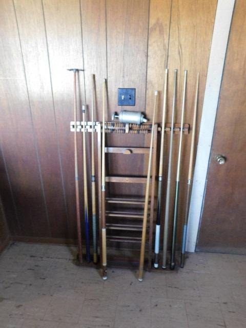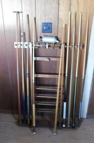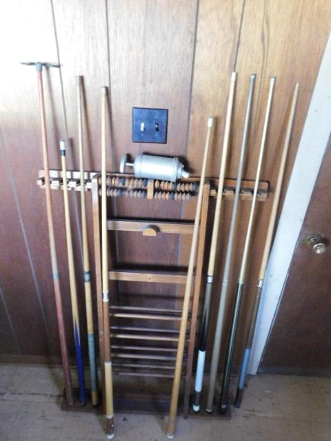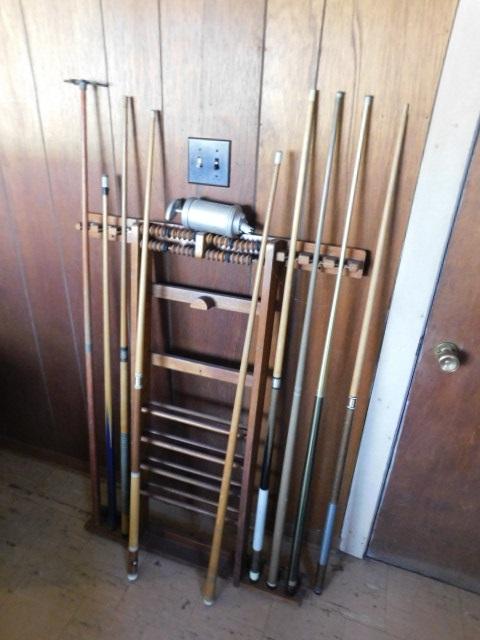 Set of Cue Sticks, Bridge, Chalkers, and Rack with Score Beads