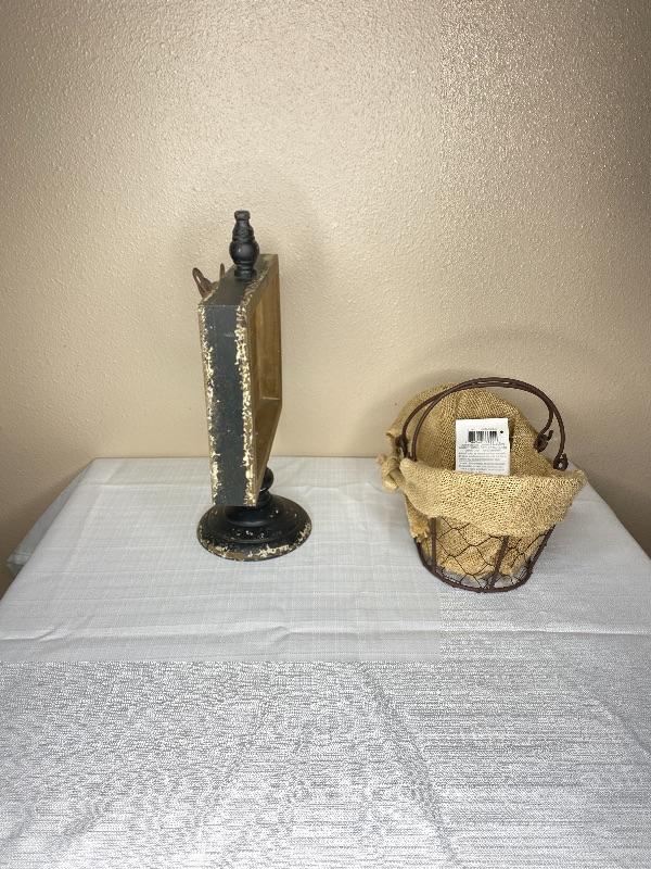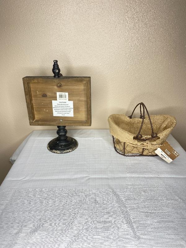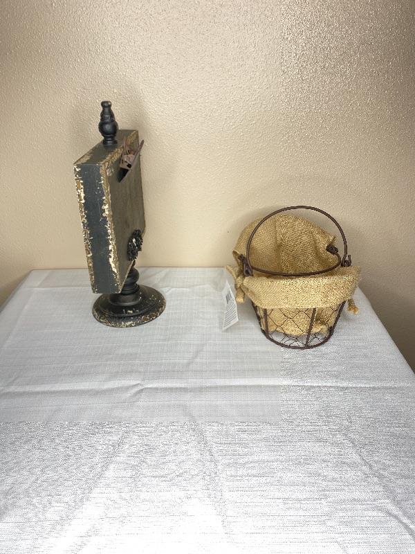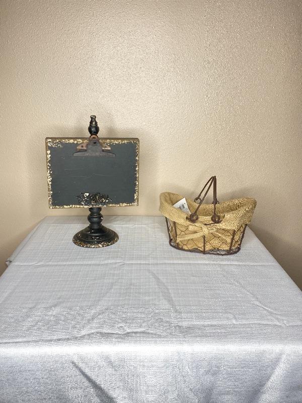 13”H x 8.75” L = Black Photo Holder with metal Clip/ 9”L x 4”H Metal Basket with Jute Liner