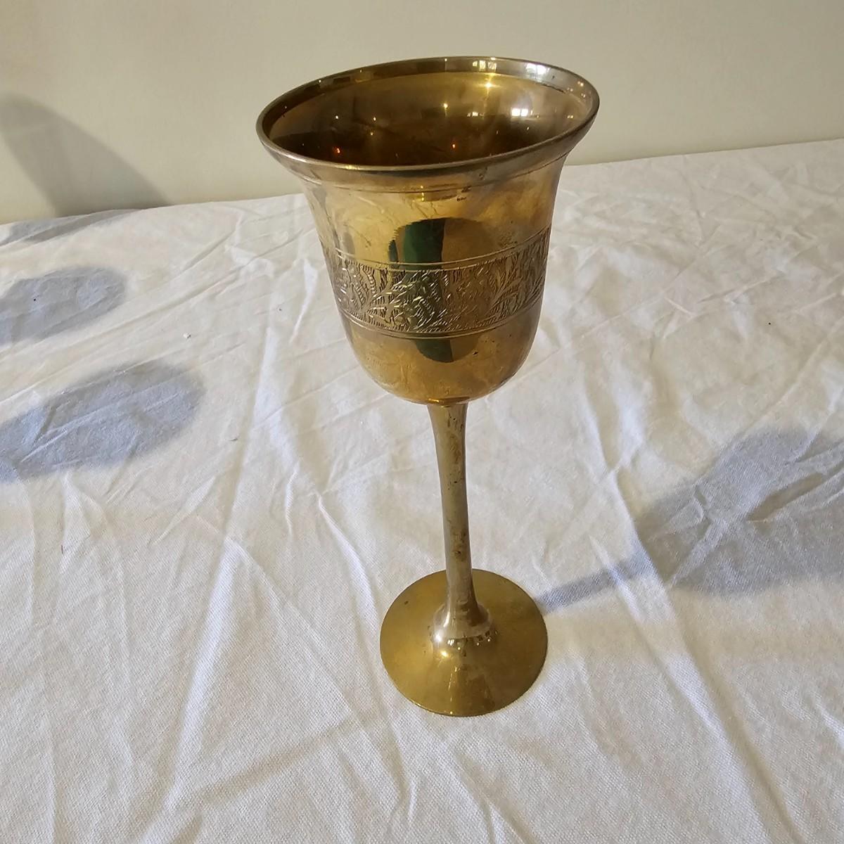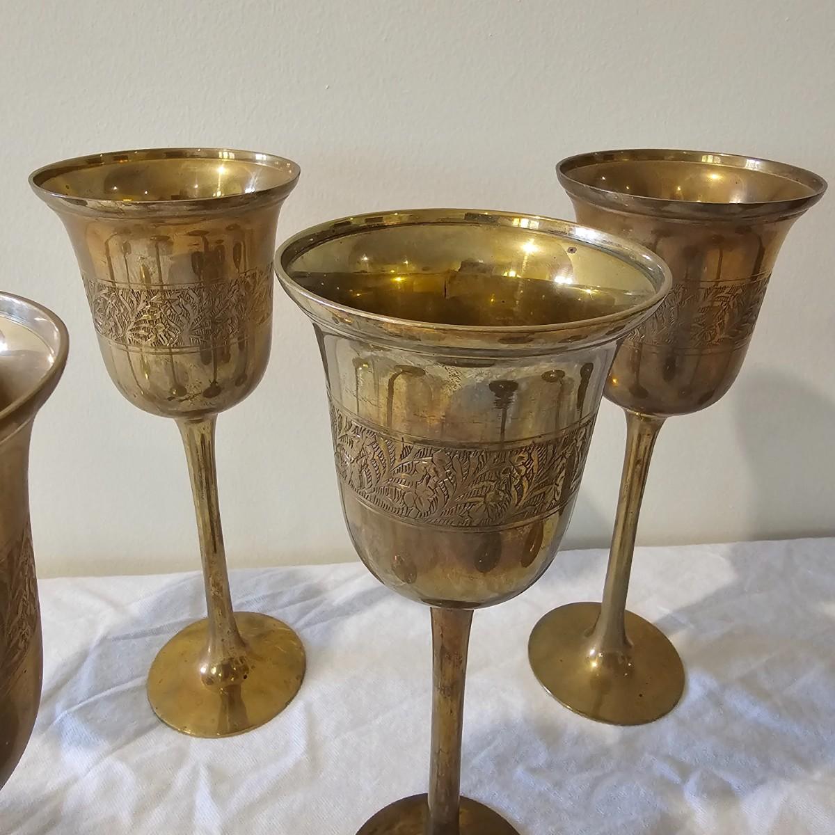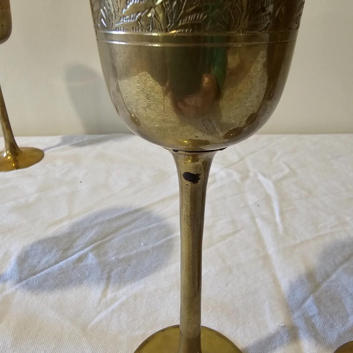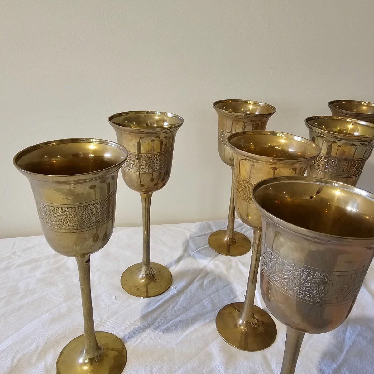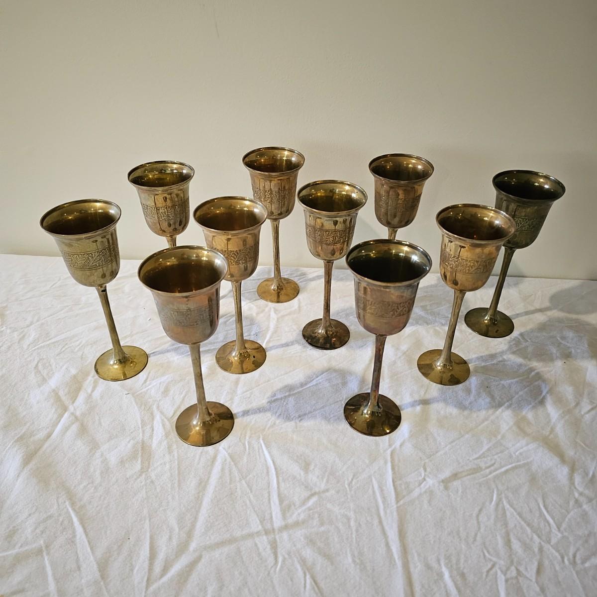 Set of 10 tall brass goblets with engraved bands around the cup parts. Each piece measures 3.25" D x 8.5" H. There are some tarnish spots on the stems and goblet cups. See photos for details. Shipping available.