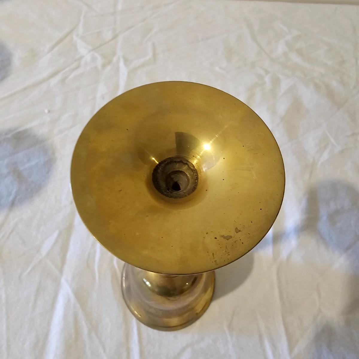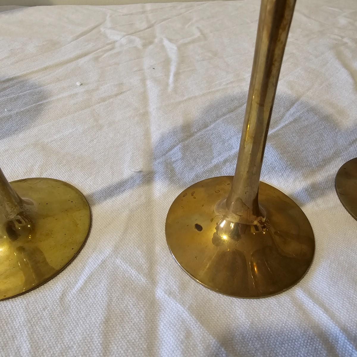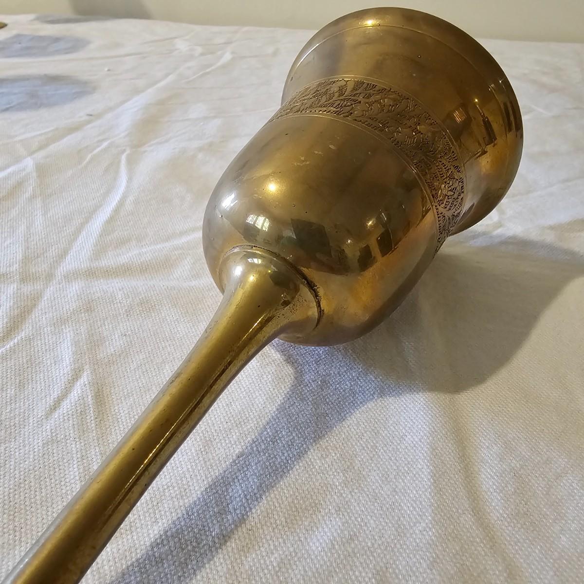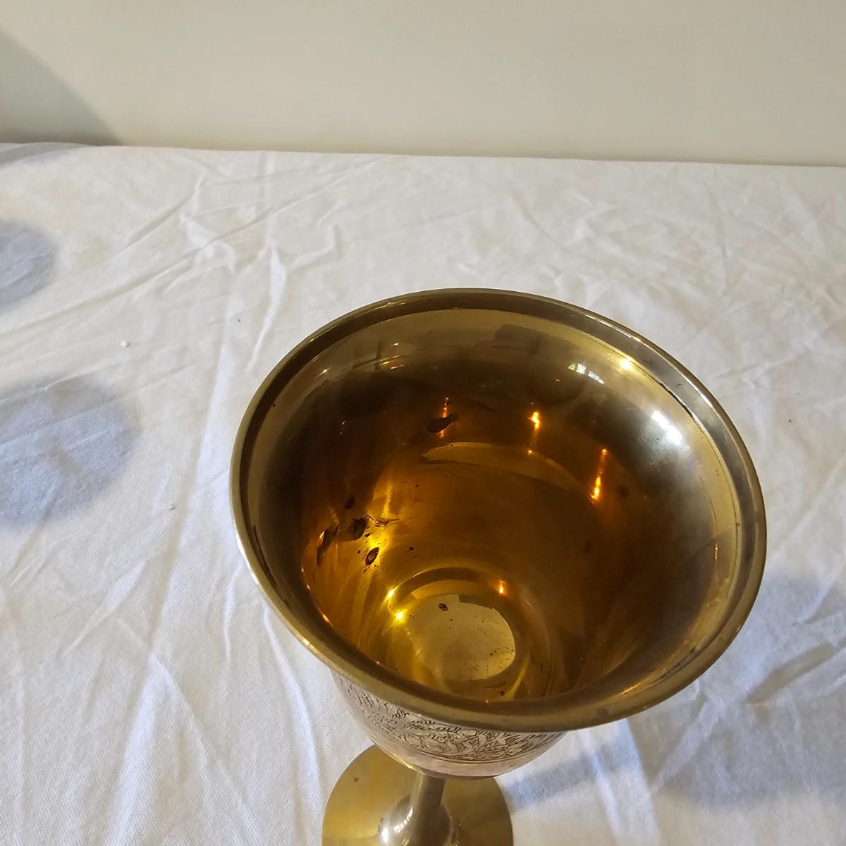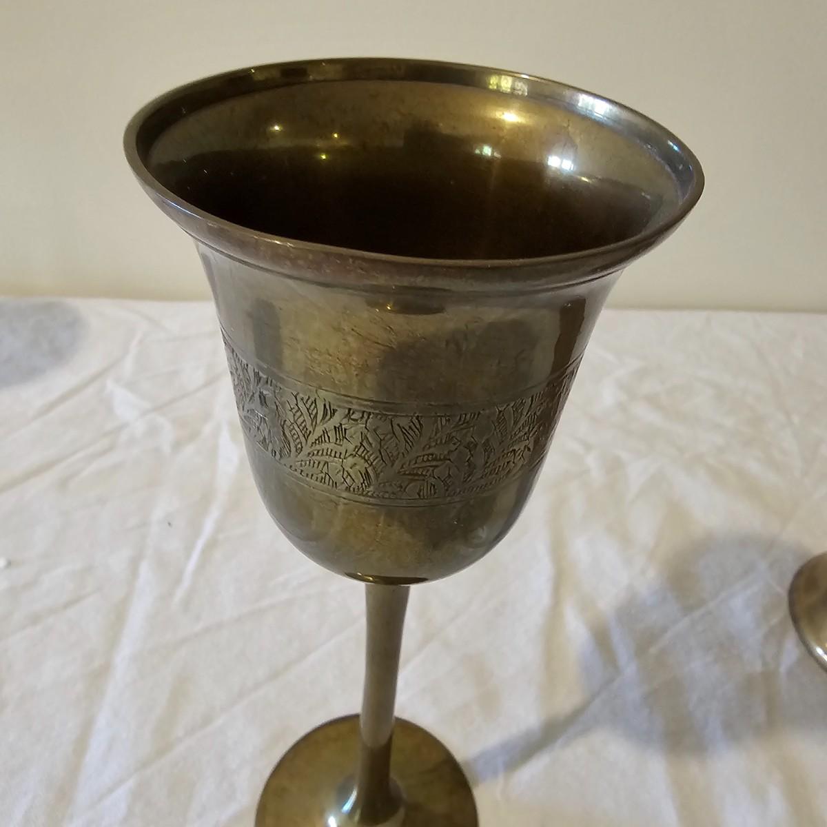 Set of 10 tall brass goblets with engraved bands around the cup parts. Each piece measures 3.25" D x 8.5" H. There are some tarnish spots on the stems and goblet cups. See photos for details. Shipping available.