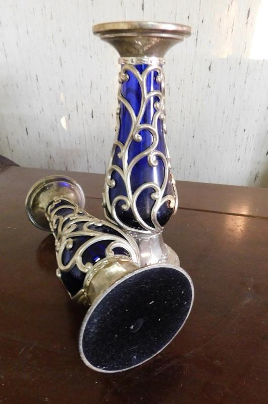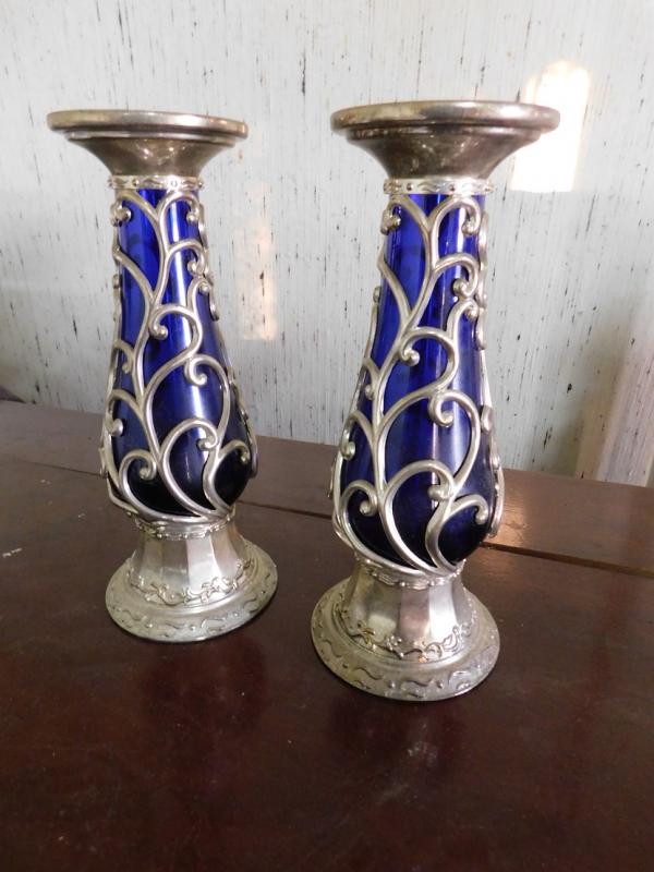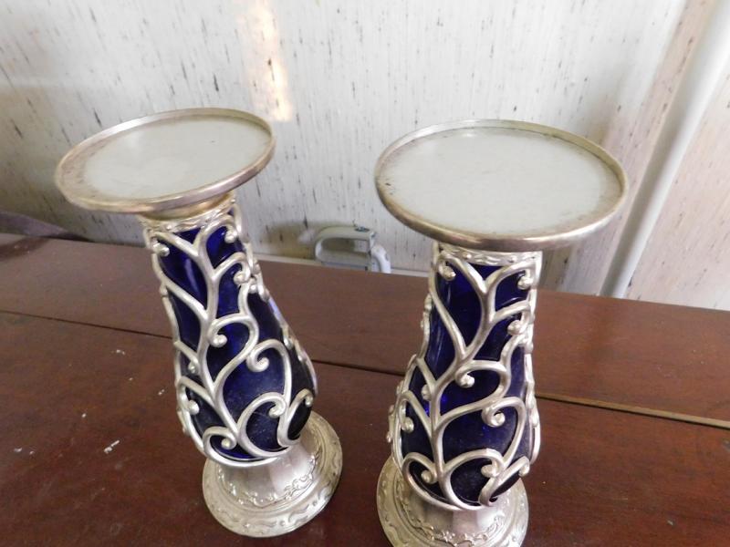 Set of Decorative Candle Holders with Blue Glass Globes and Metal Framing