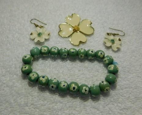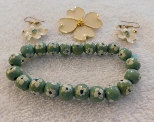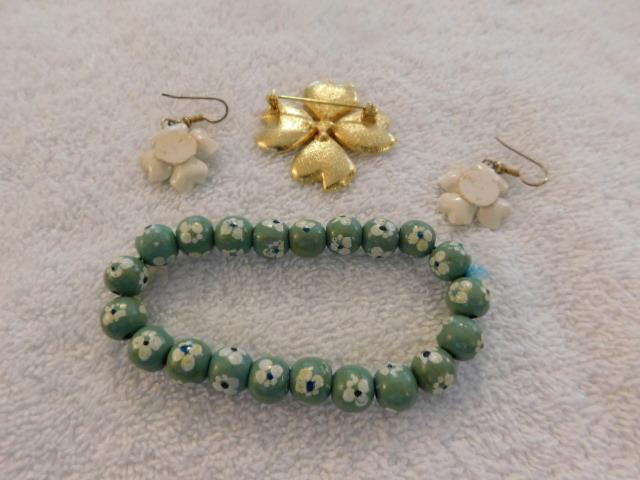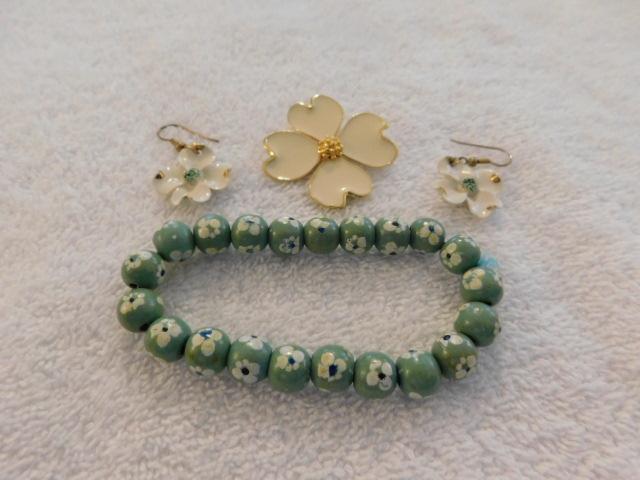 Set of Dogwood Themed Wood Bead Bracelet and Enamel Earrings and Pin