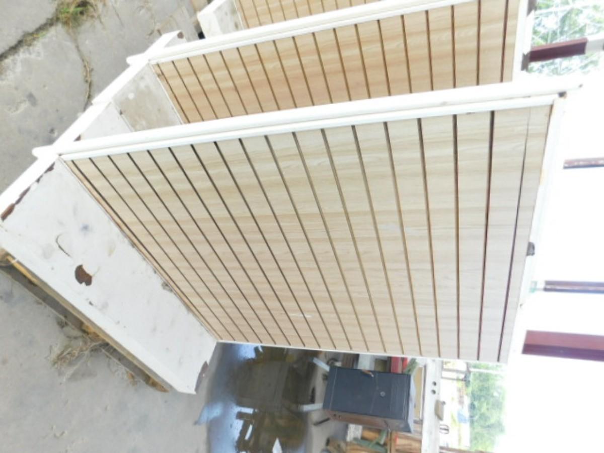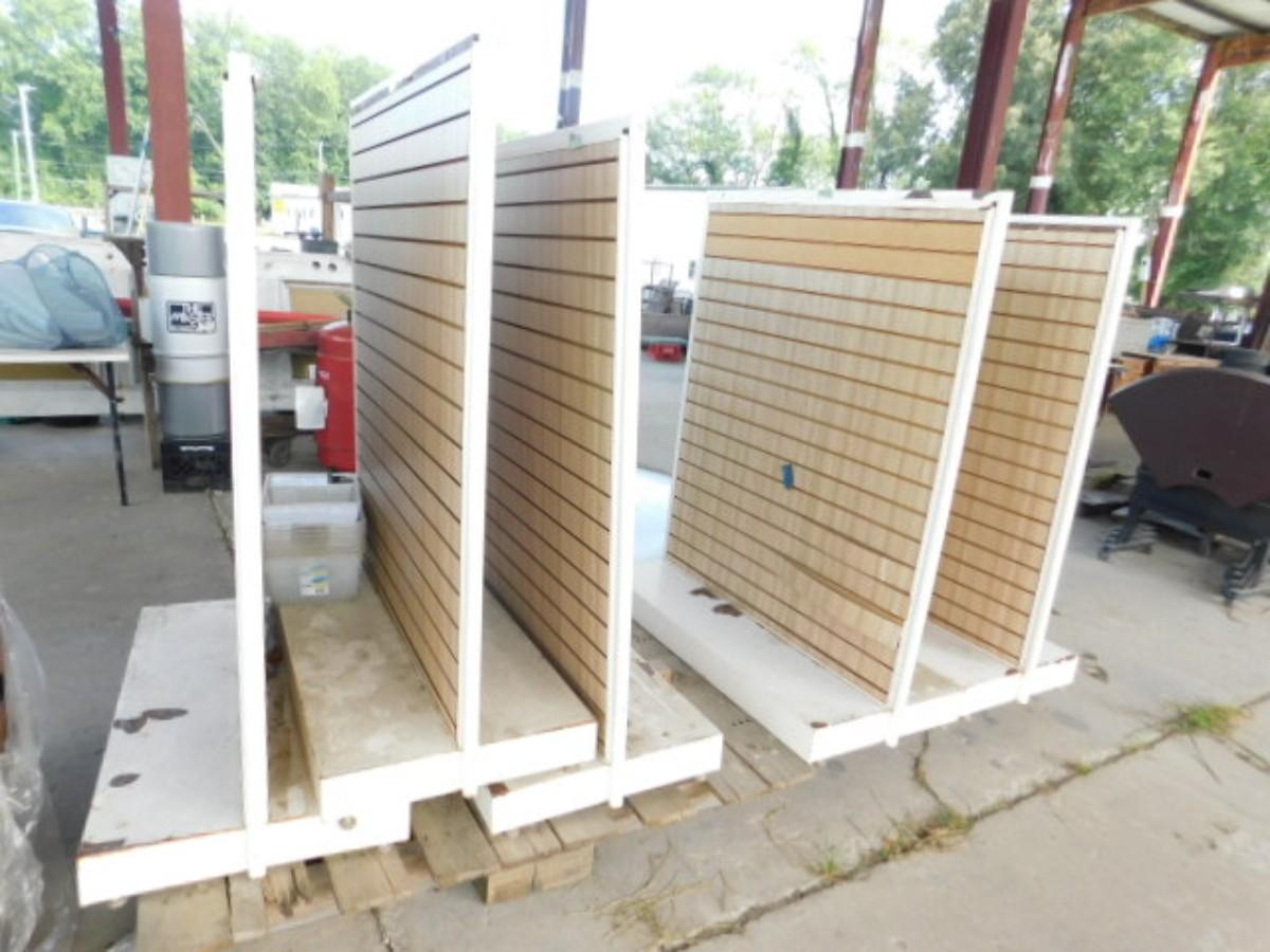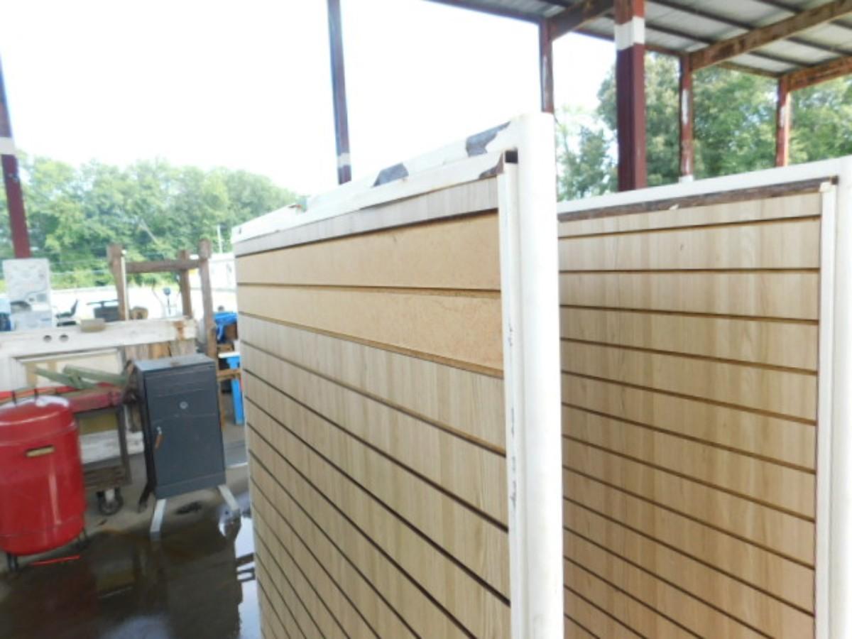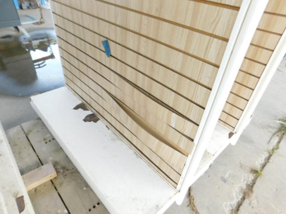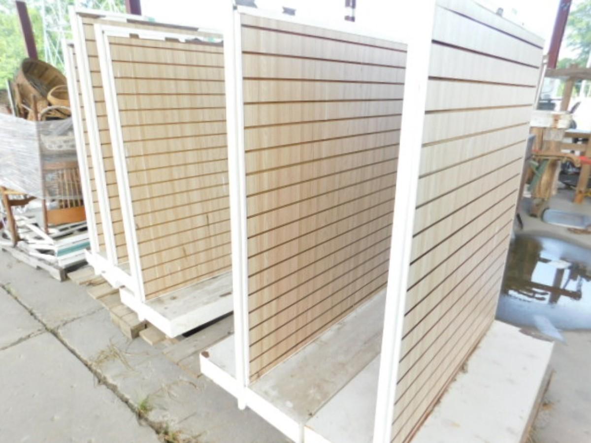 Set of Retail Display Slat Wall Racks some paint chipping. Slat wall laminate loose or missing on a few walls