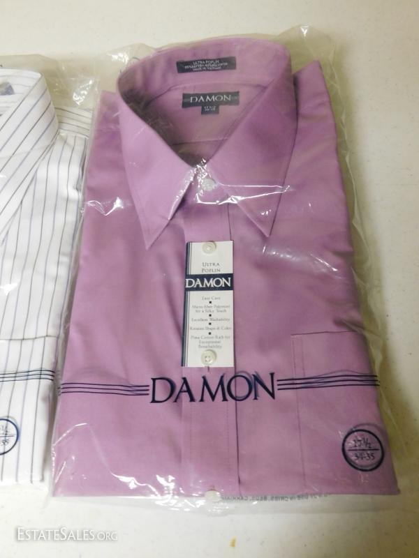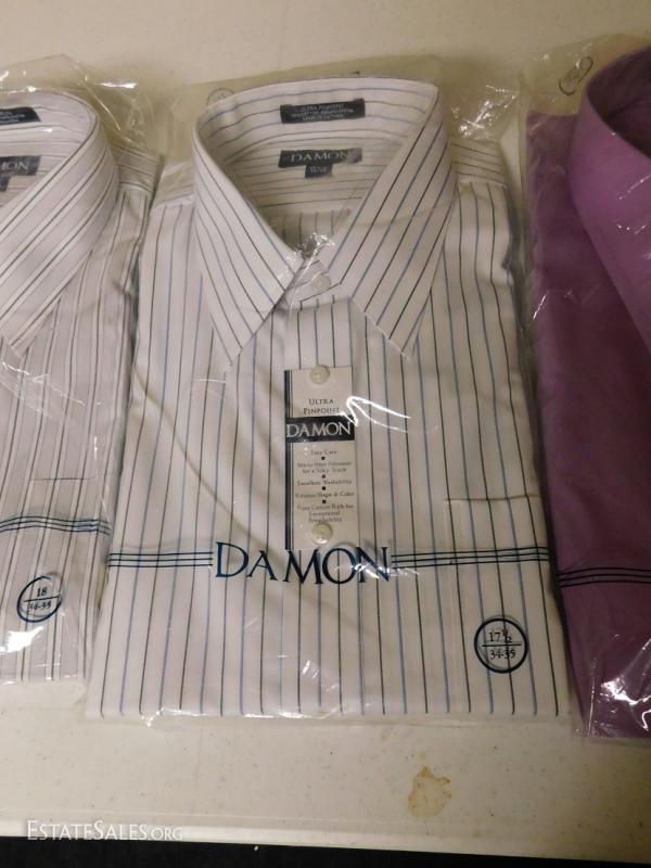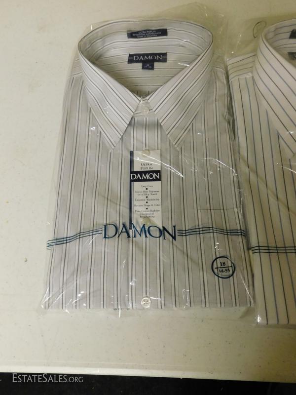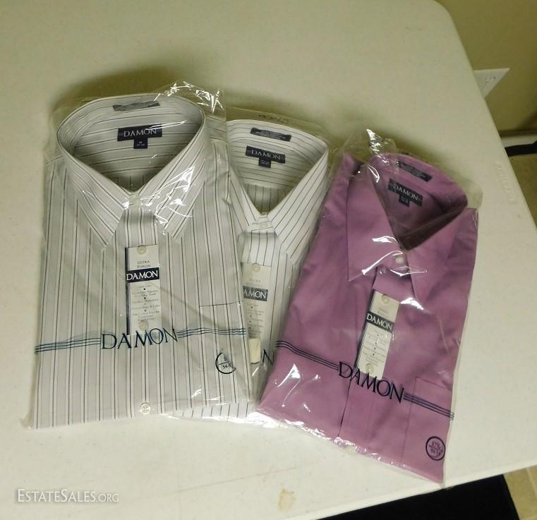 Set of three new dress shirts by Damon. Sizes vary from 16-17 1/2. Still in wrap. Buying as is without trying on.