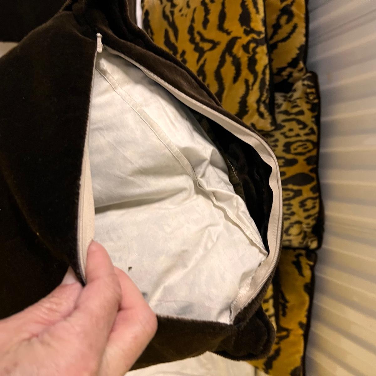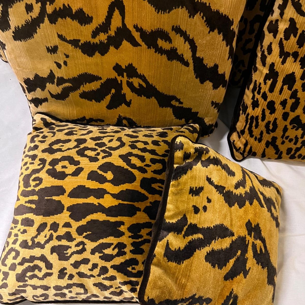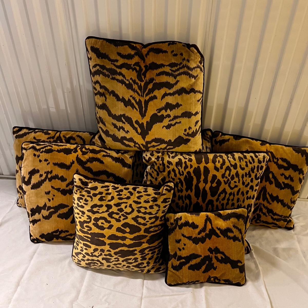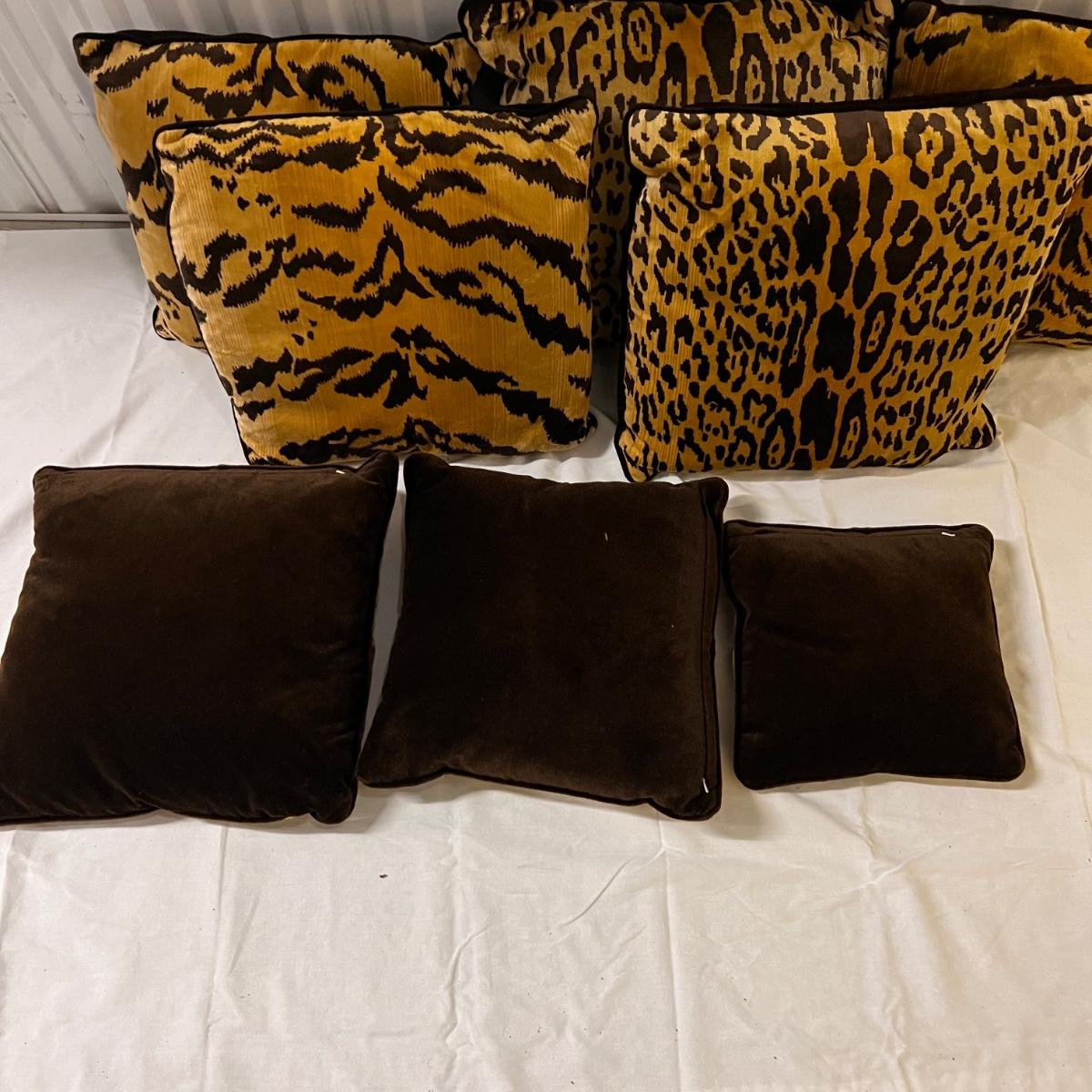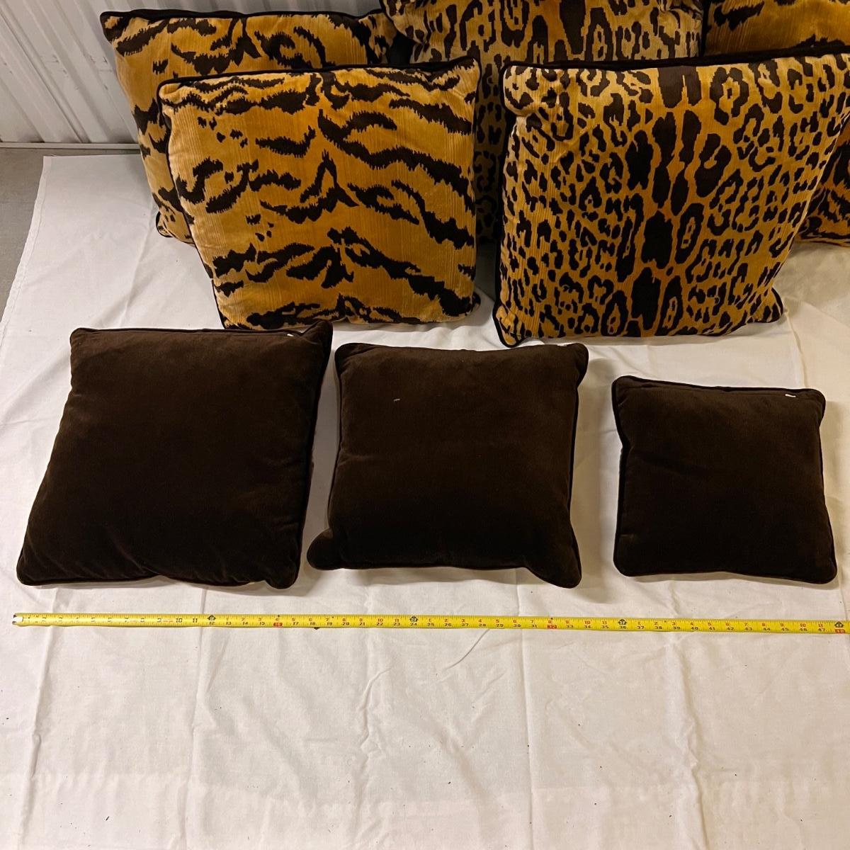This set of pillows have removable covers that are a tan/dark brown animal print design and velvet fabric, Scalamandre “Tigre” and “Leopardo”. The six that are the largest measure 17” square.