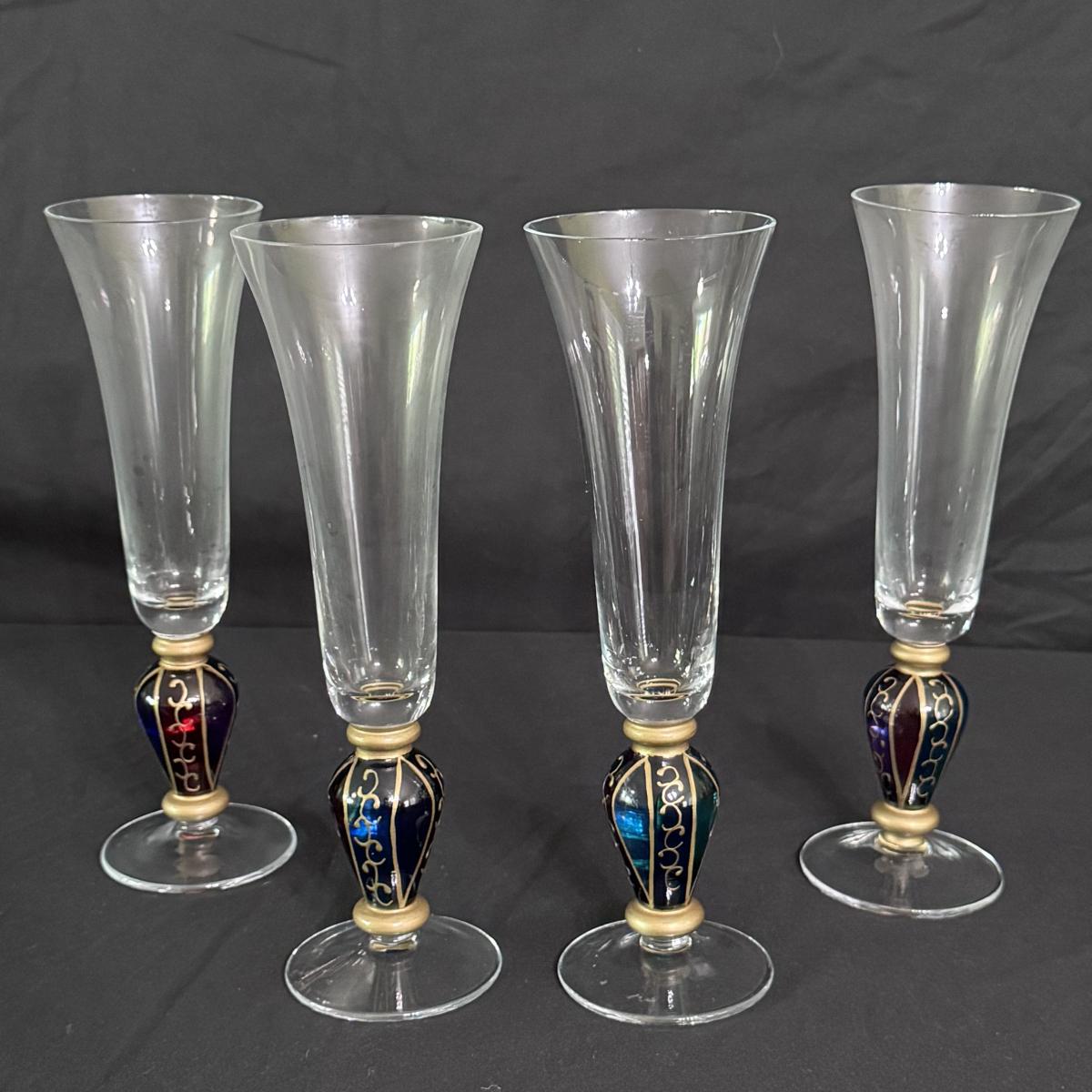 Lot includes eight carnival champagne glasses made with dichroic glass at the base. The bases of the glasses are decorated with a gold colored paint. Each glass individually measures 3”D x 10”H. Shipping available.