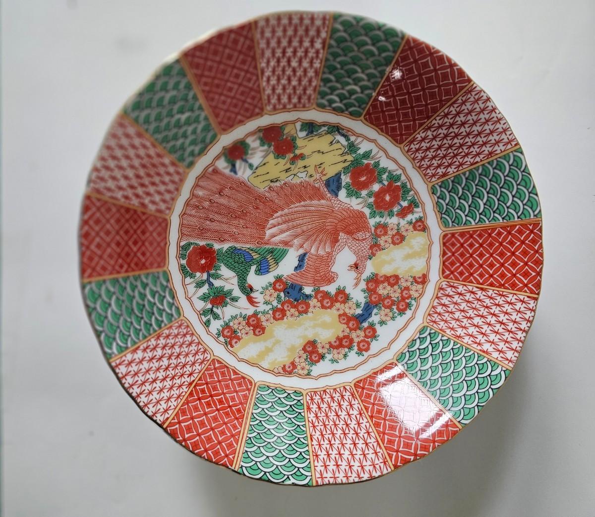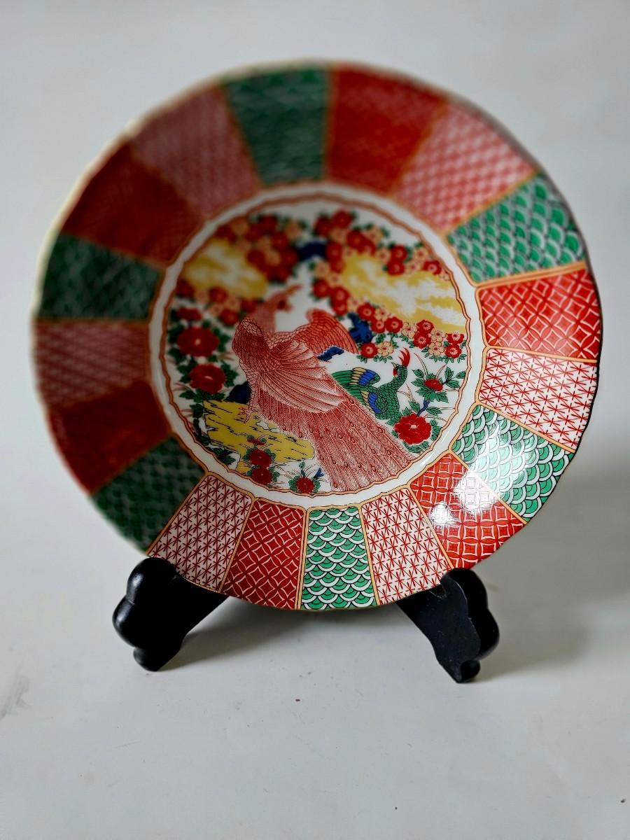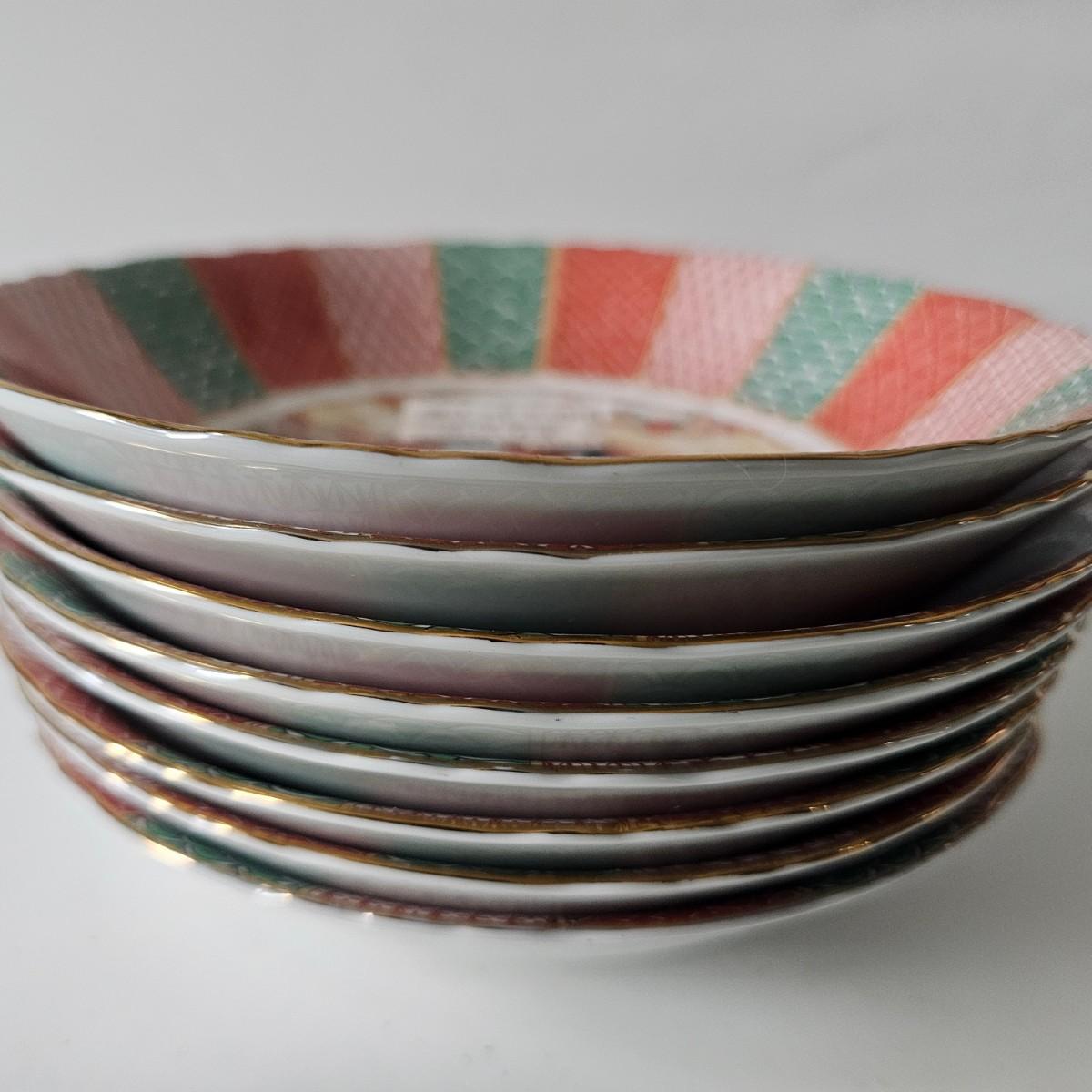 Midcentury modern plates with beautiful color, colorful farm motif with red, green and gold details