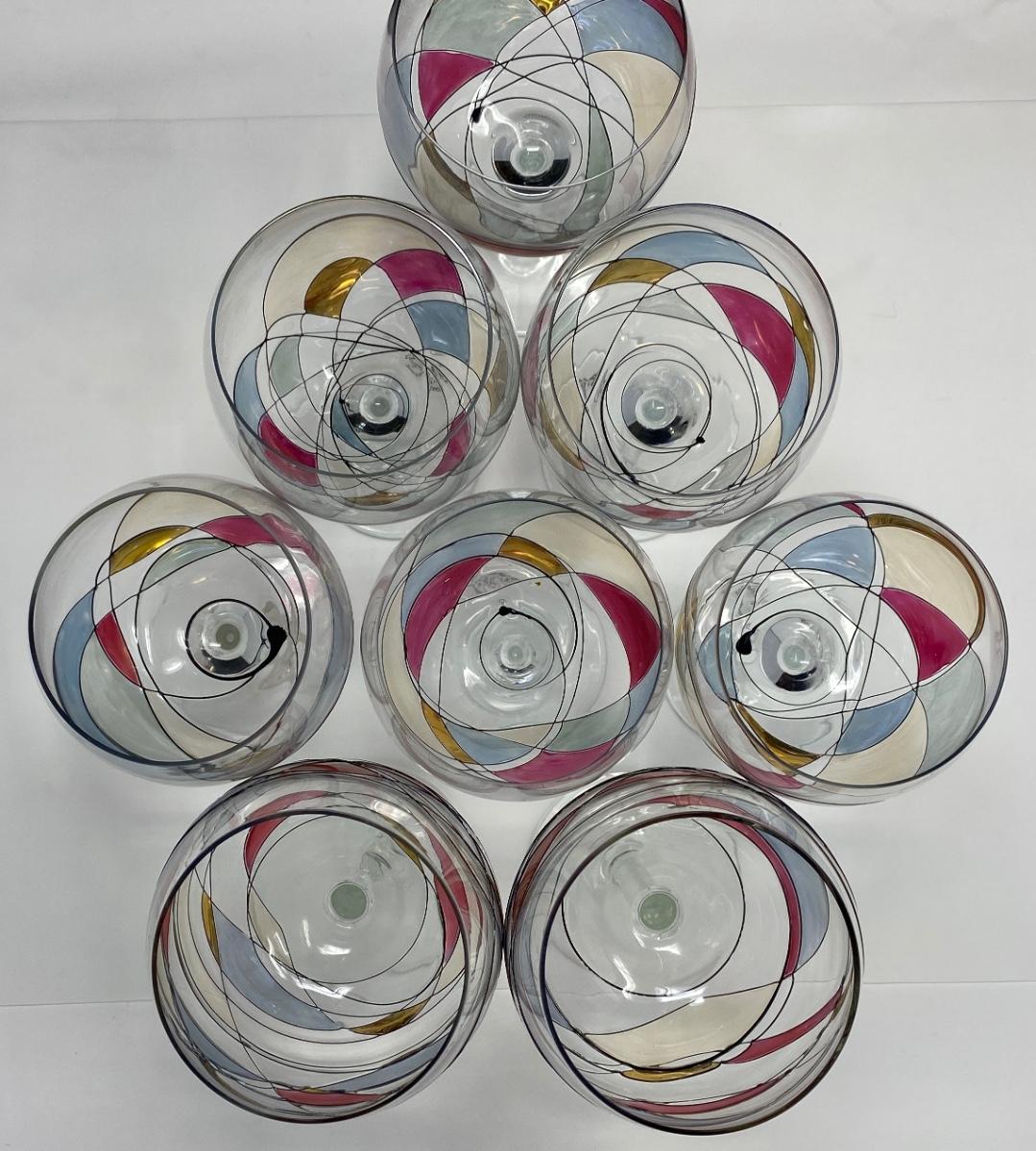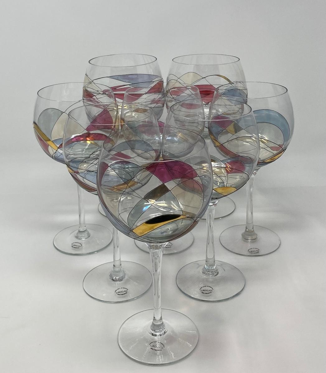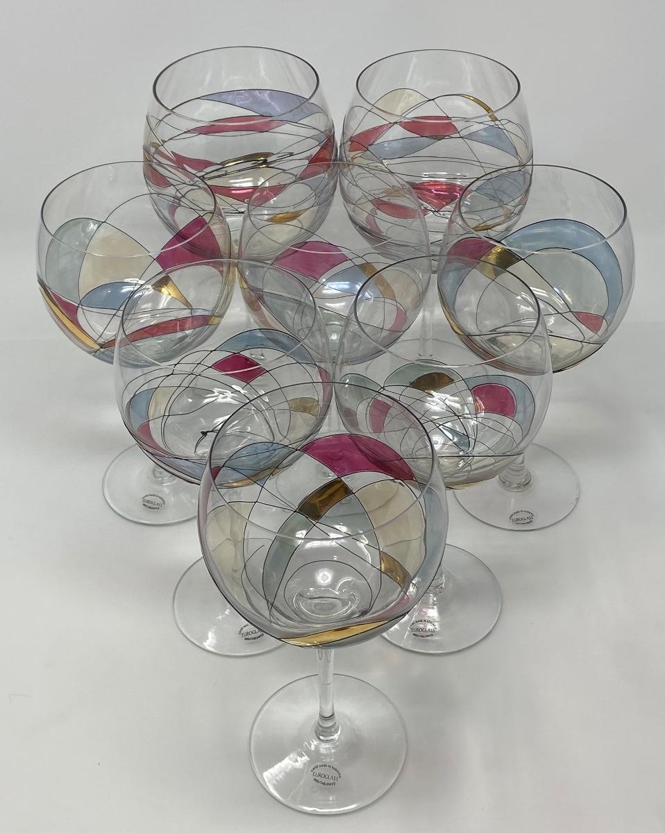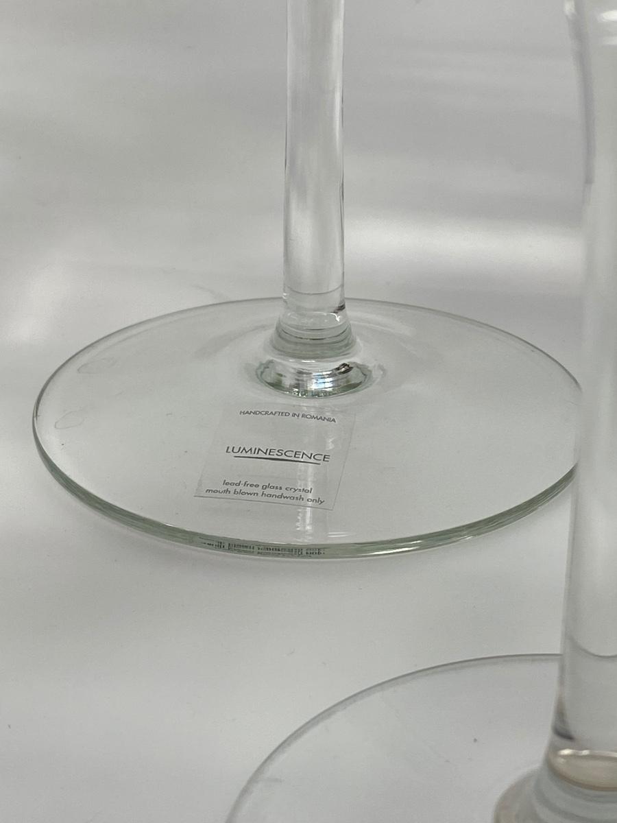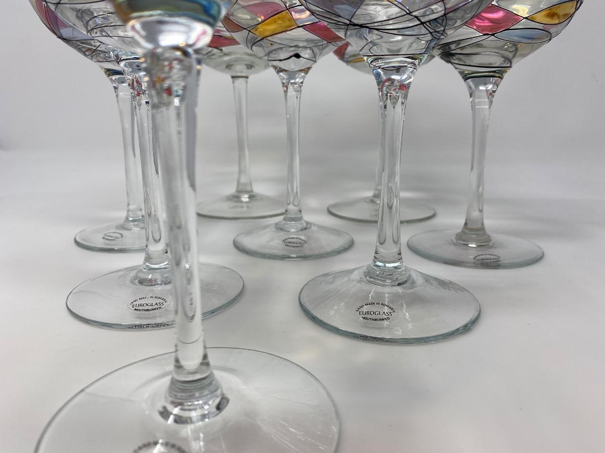 Set of Eight Romanian Luminescence Mouthblown Lead Free Glass Crystal Glasses. Six Glasses are 8in T and Two Taller Glasses are about 8.75in T.