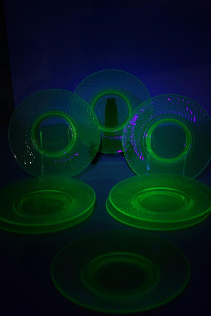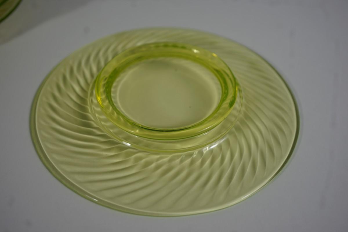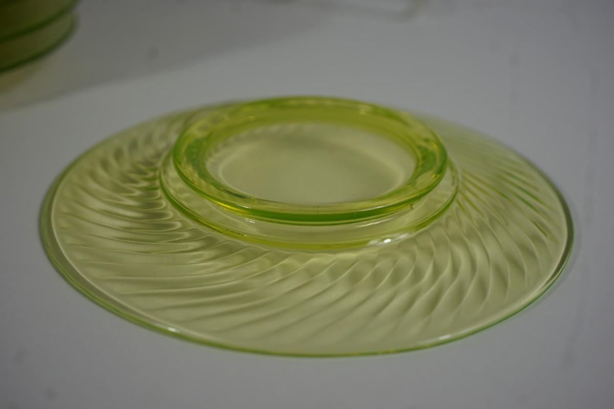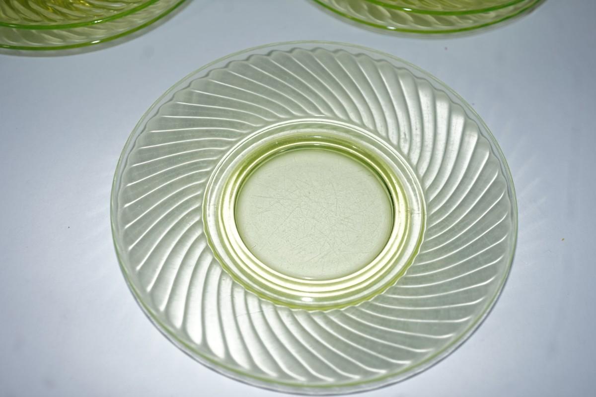 SET OF EIGHT VASELINE GLASS 8" LUNCHEON PLATES SWIRL PATTERN PLATFORM BASE -Uranium