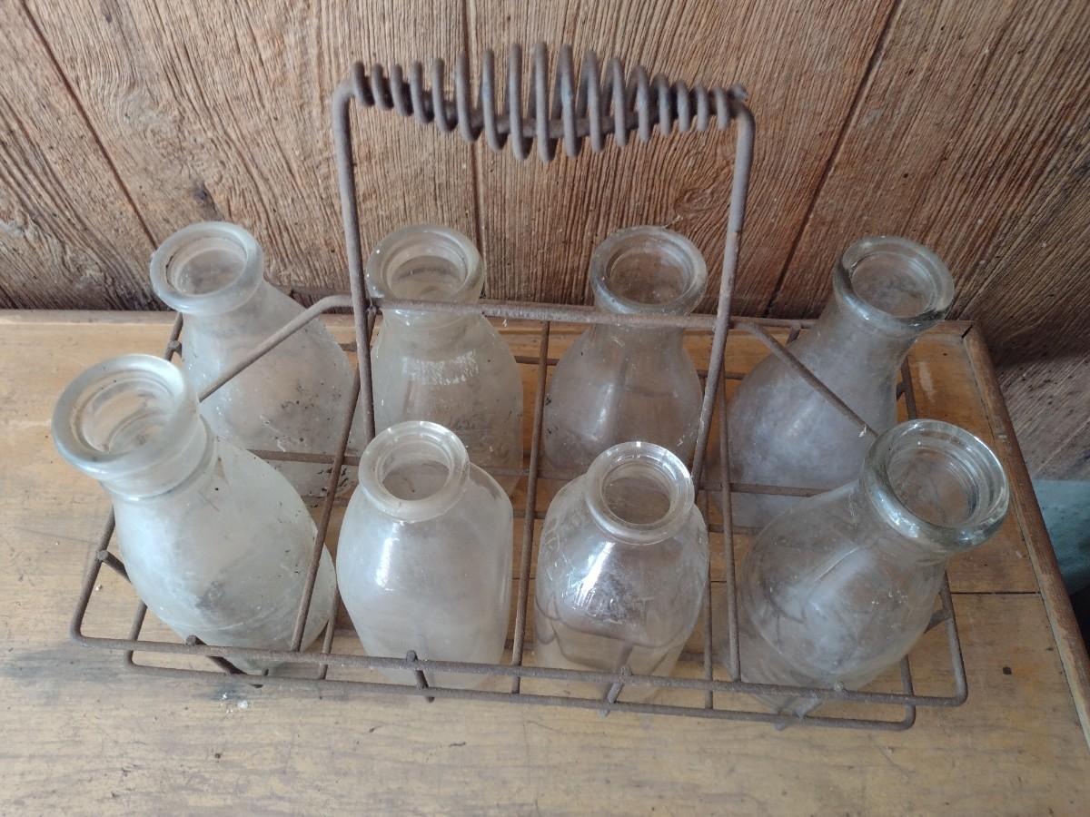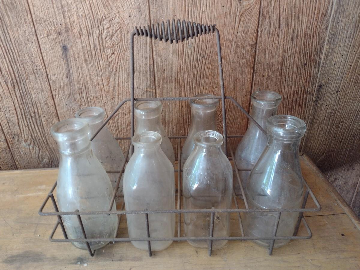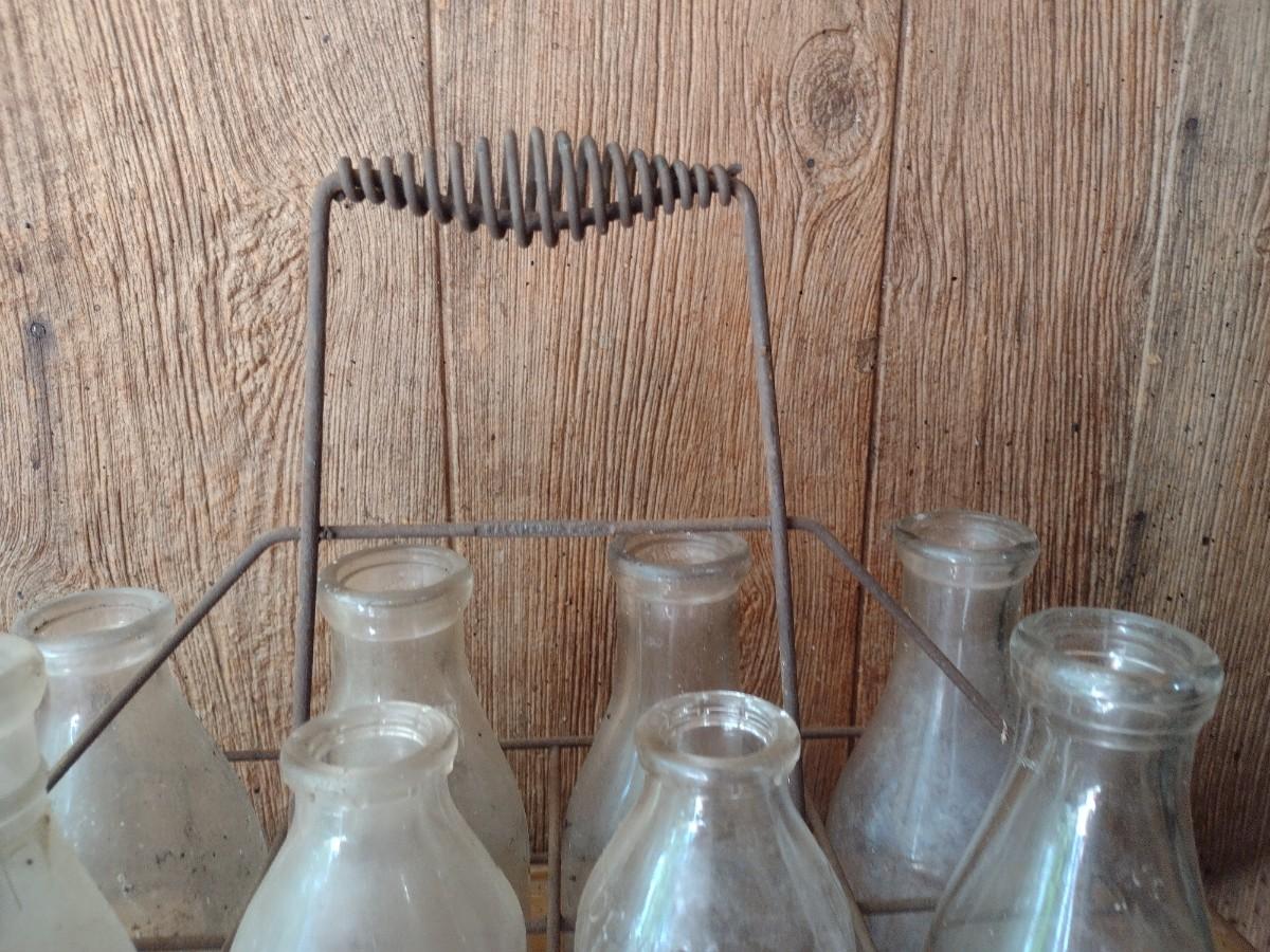 Set of Eight Vintage Dairy Milk Bottles Various Markings in Metal Wire Carry Caddy (#40)