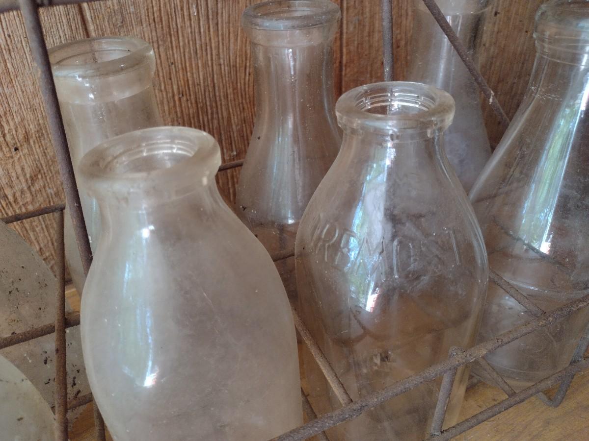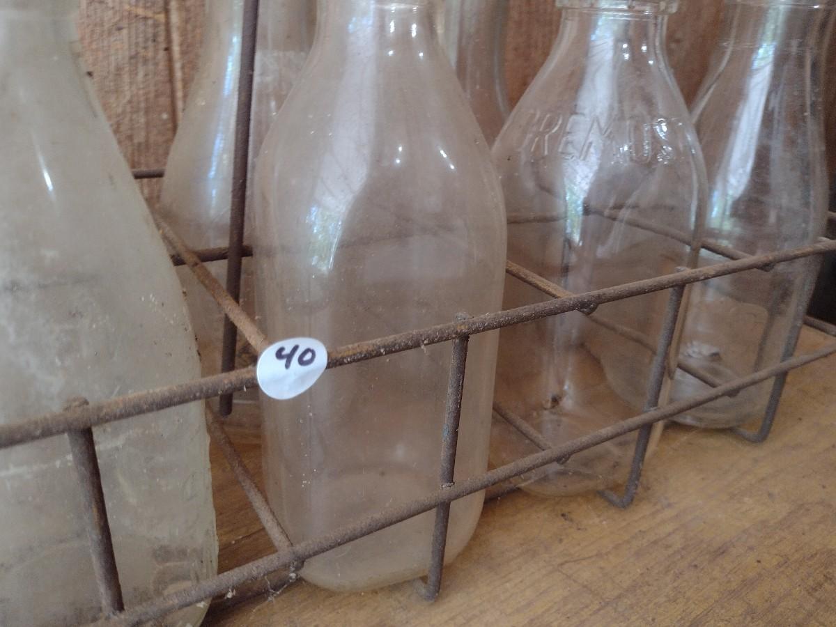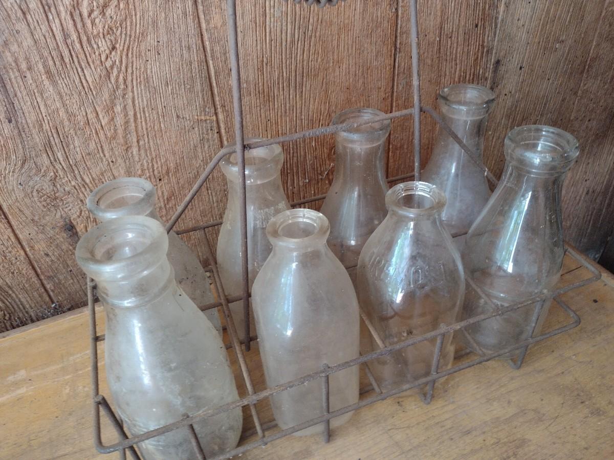 Set of Eight Vintage Dairy Milk Bottles Various Markings in Metal Wire Carry Caddy (#40)