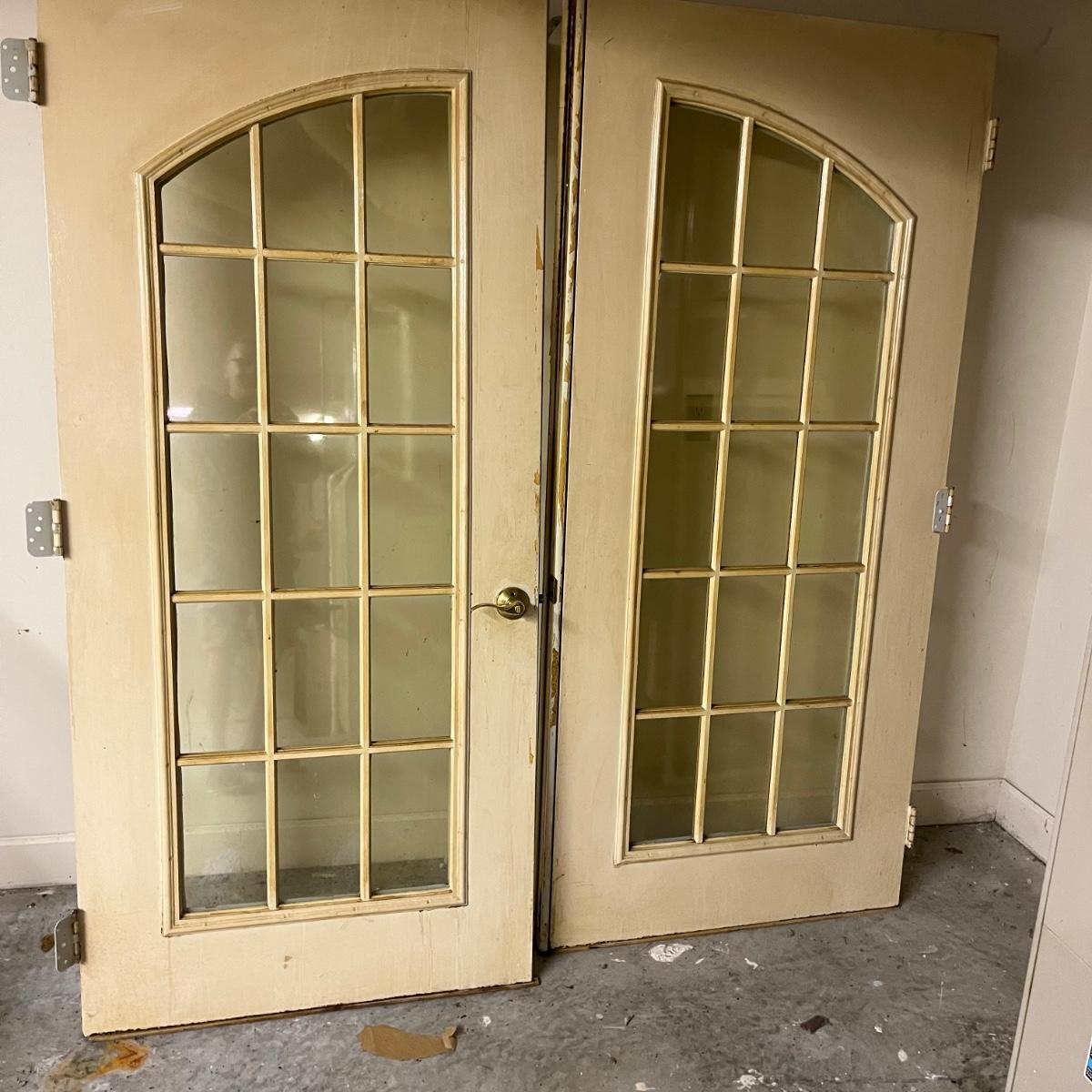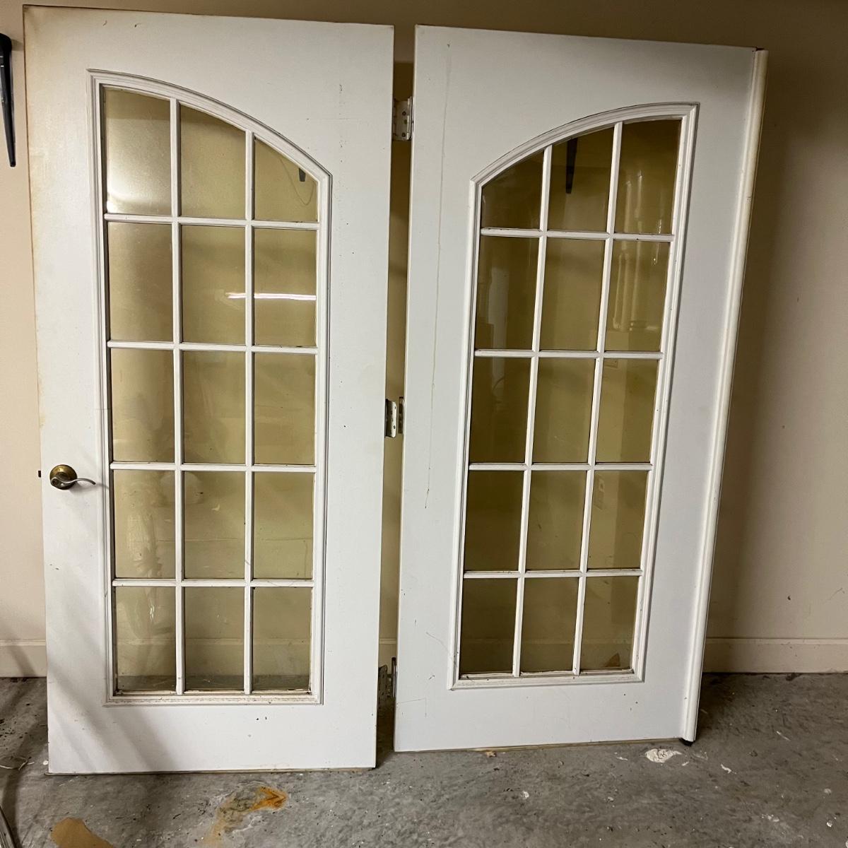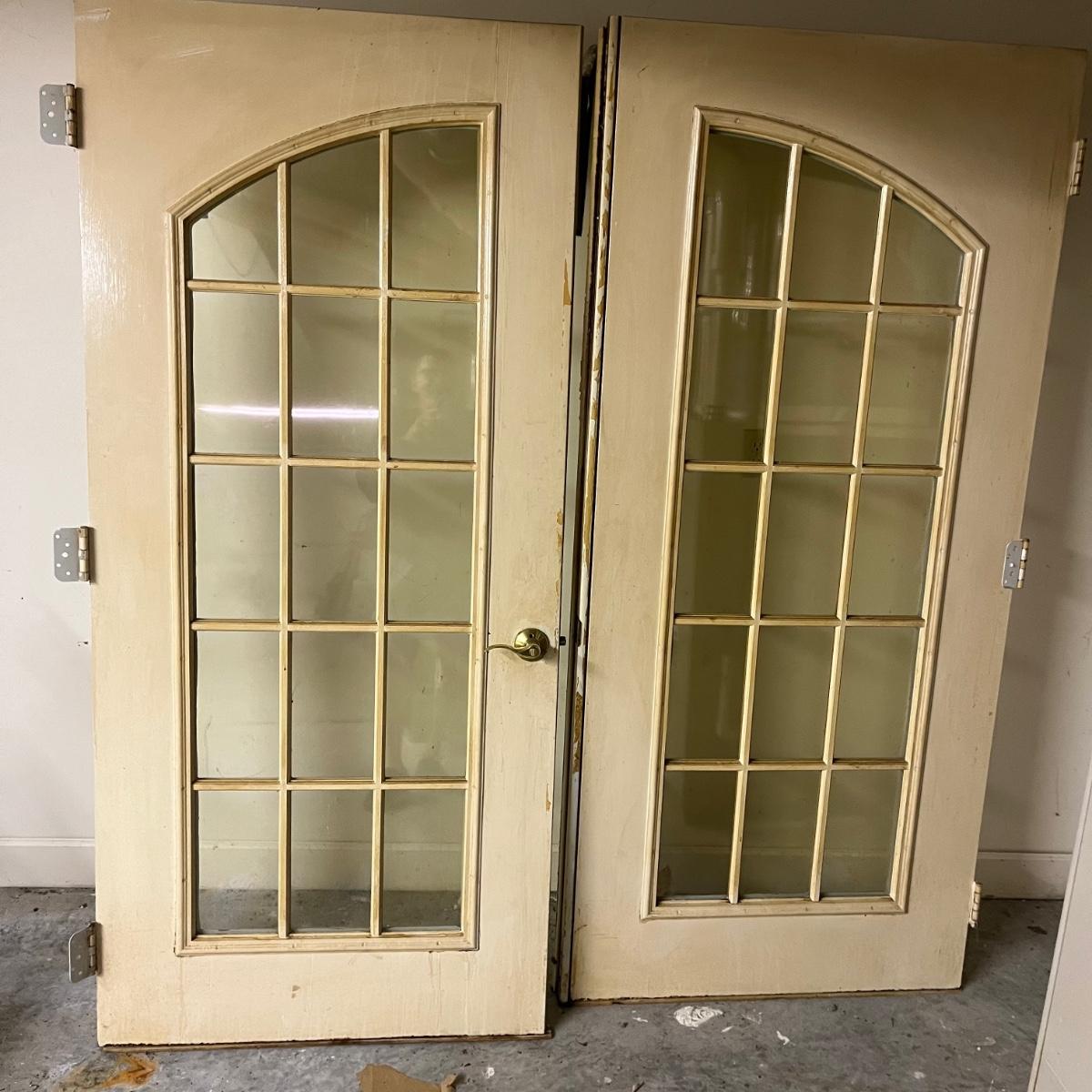 Lot includes a pair of metal and glass French doors that each measure 36” x 79.5” x 1.75”. Bring help item is substantial.