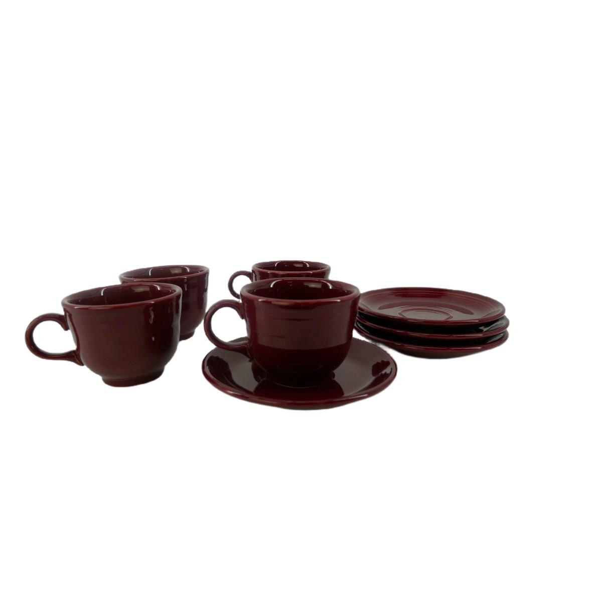 Set of four maroon, cinnabar glazed Fiesta, Fiestaware tea, coffee cups and saucers by Homer Laughlin China Co. All in excellent condition, no visible issues found. Each cup is approximately 3.5" in diameter and 2.75" in height. Each saucer is approximately 6" in diameter. Lot weighs 4 lb 8 oz. (G23)