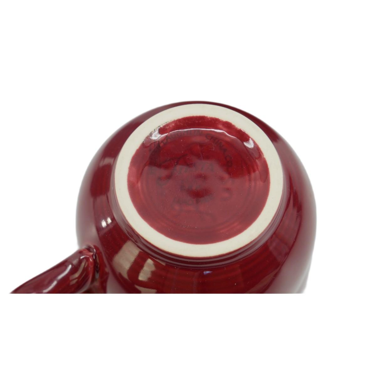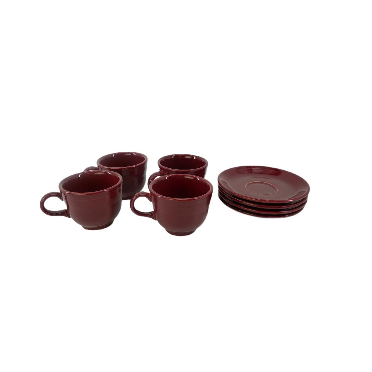 Set of four maroon, cinnabar glazed Fiesta, Fiestaware tea, coffee cups and saucers by Homer Laughlin China Co. All in excellent condition, no visible issues found. Each cup is approximately 3.5" in diameter and 2.75" in height. Each saucer is approximately 6" in diameter. Lot weighs 4 lb 8 oz. (G22)