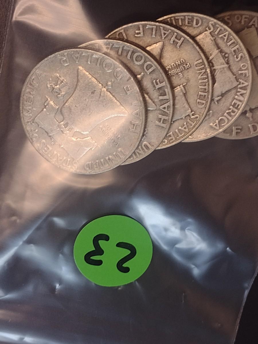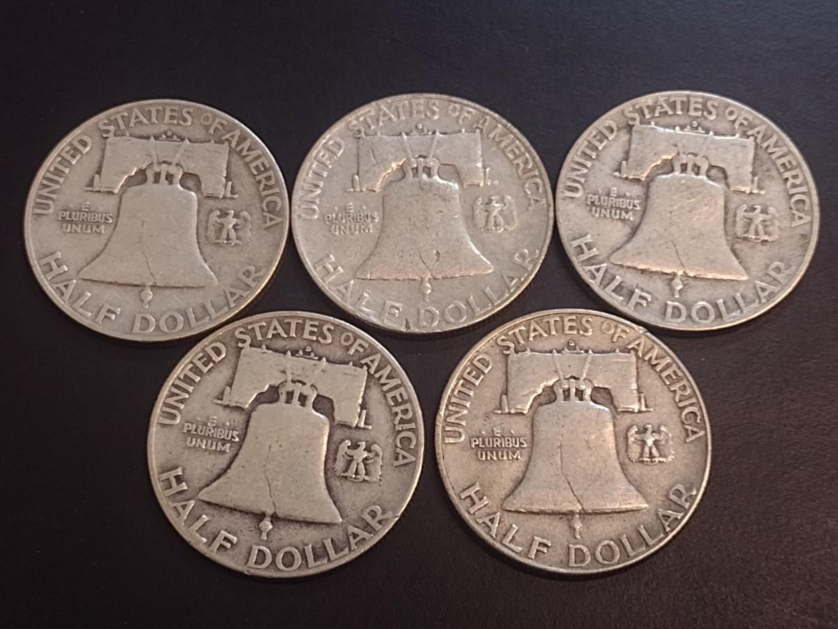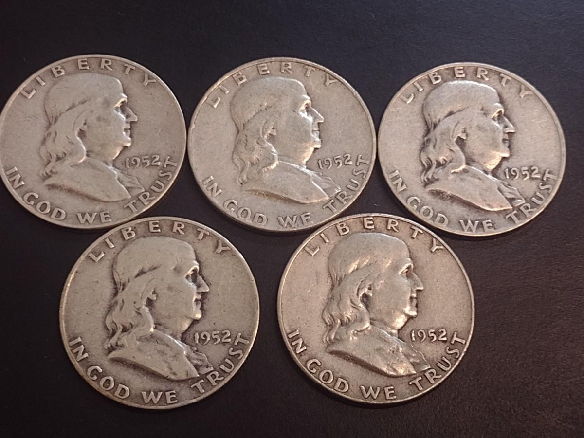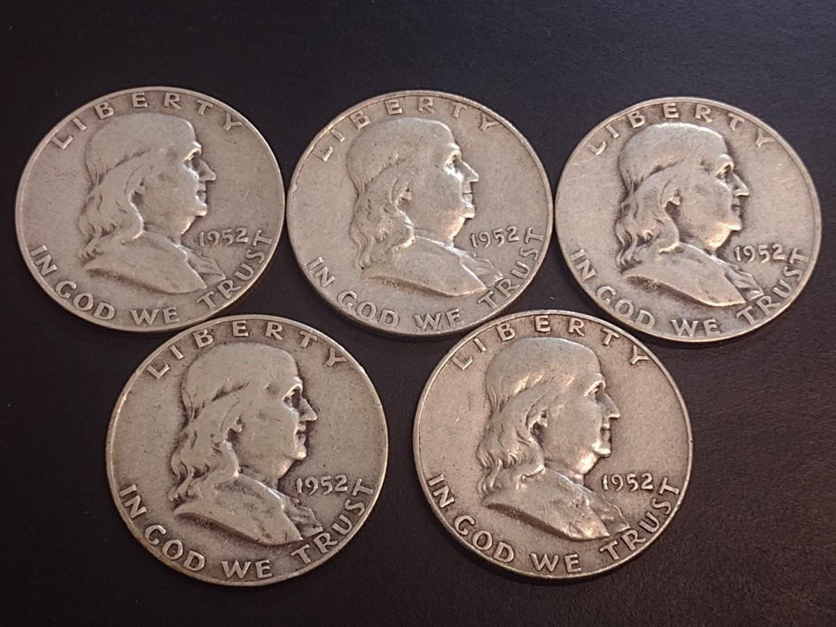Set of Five 1952-D, U.S. Mint Franklin Silver Half Dollars Circulated (23)