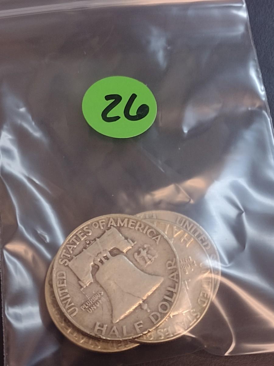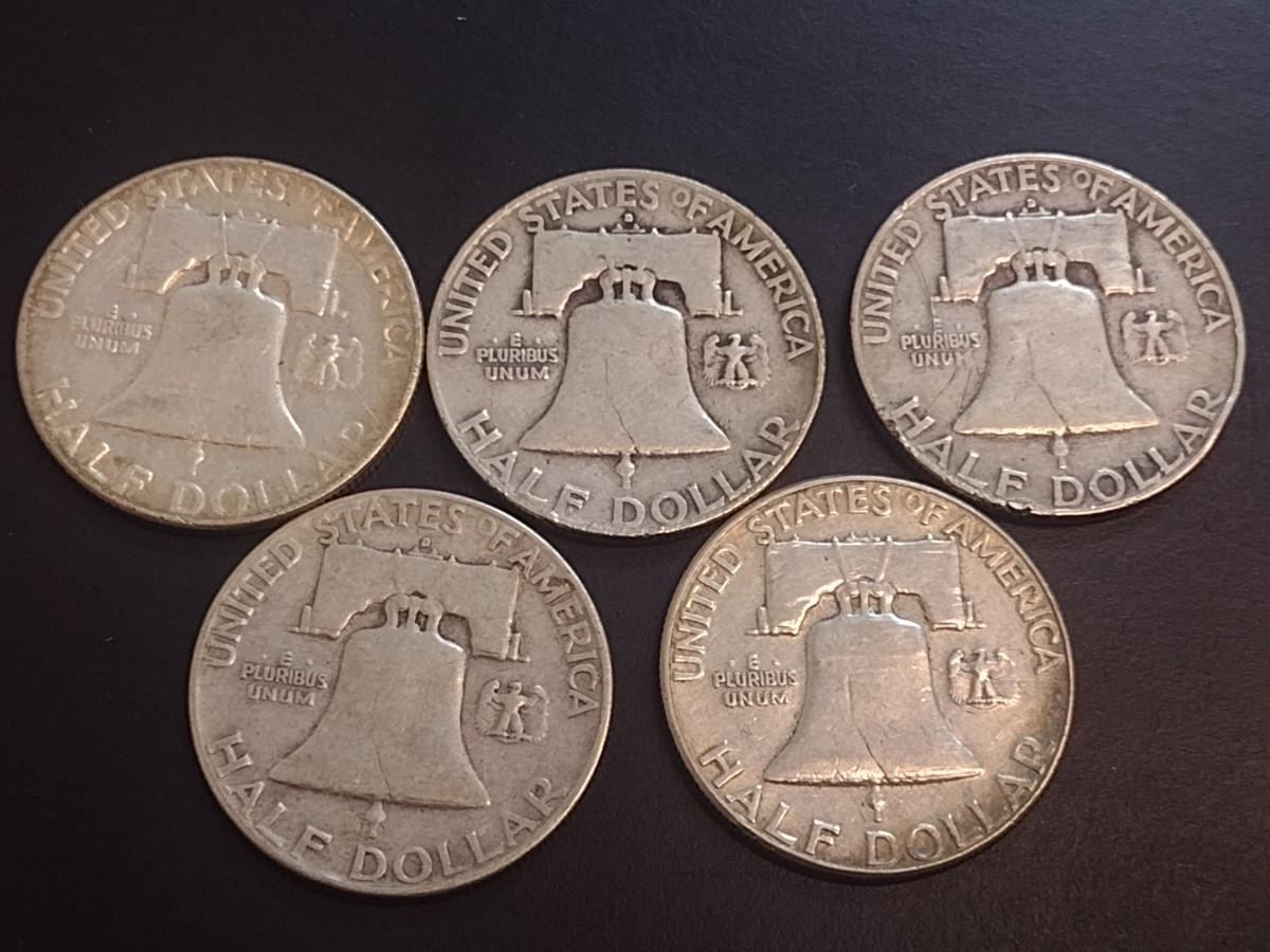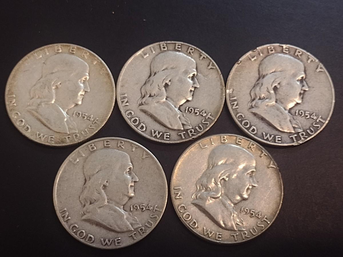 Set of Five 1954-D, Unmarked U.S. Mint Franklin Silver Half Dollars Circulated (26)