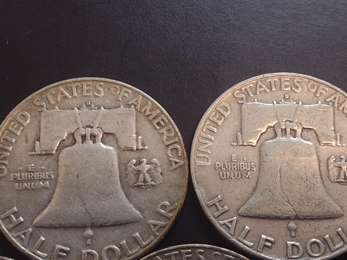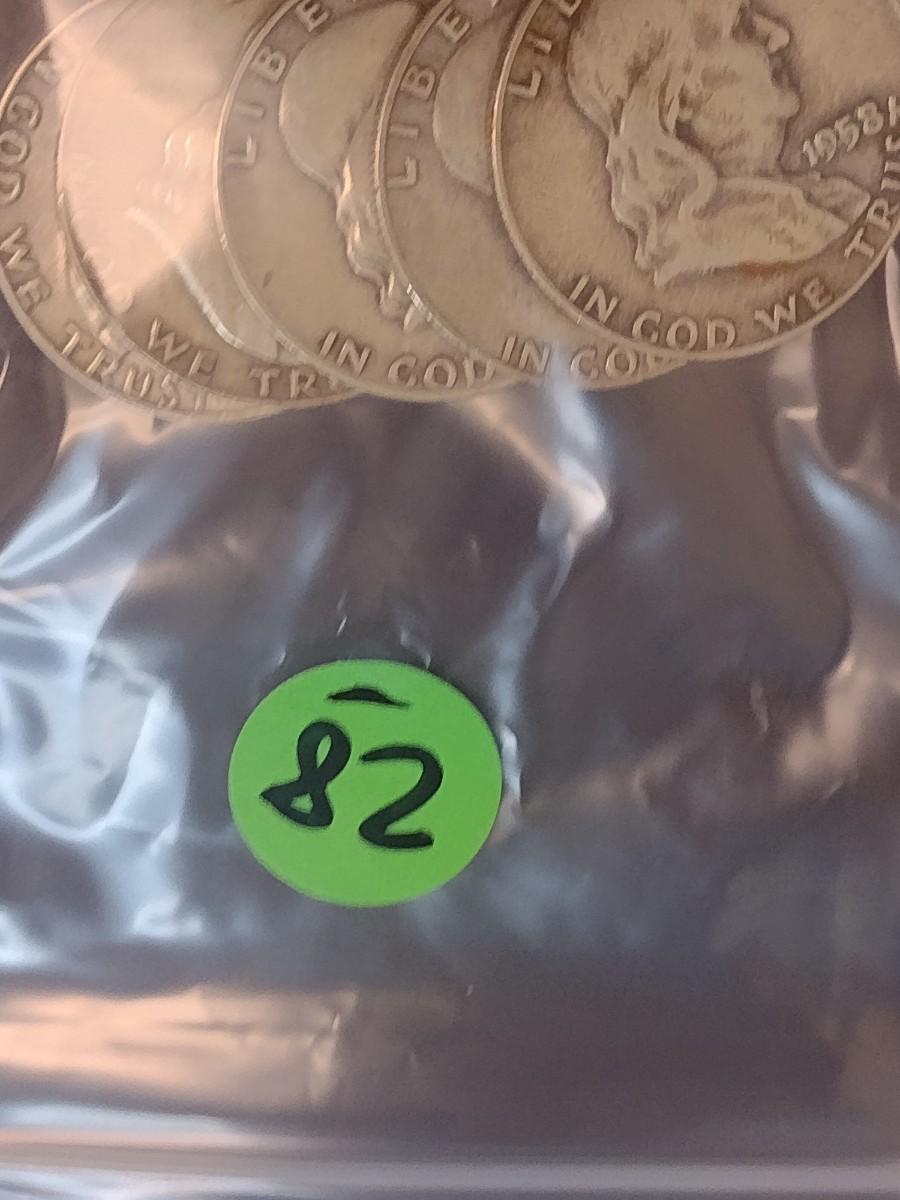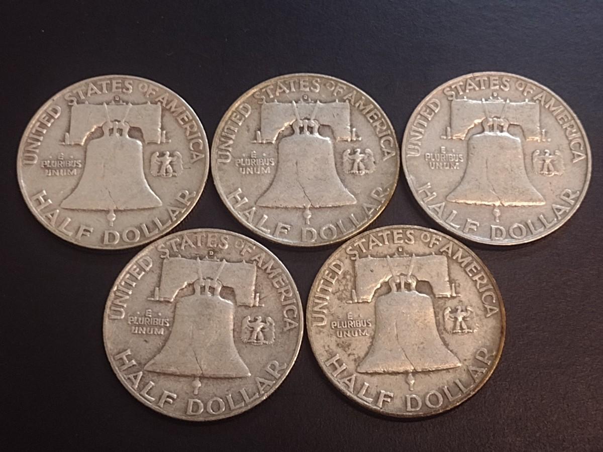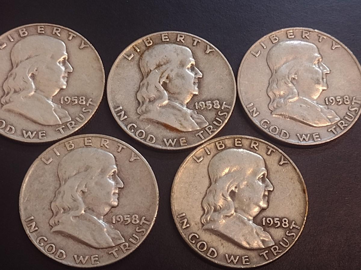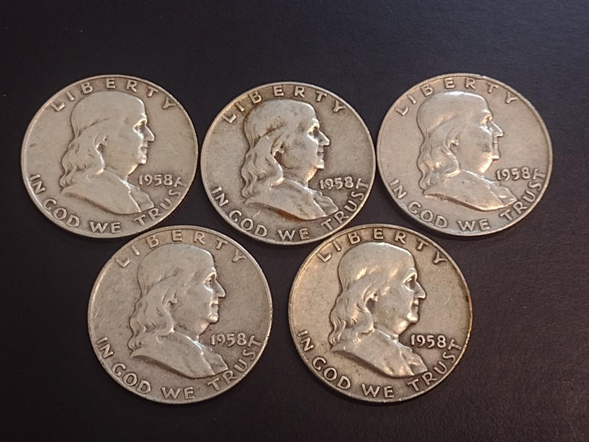 Set of Five 1958-D, U.S. Mint Franklin Silver Half Dollars Circulated (28)