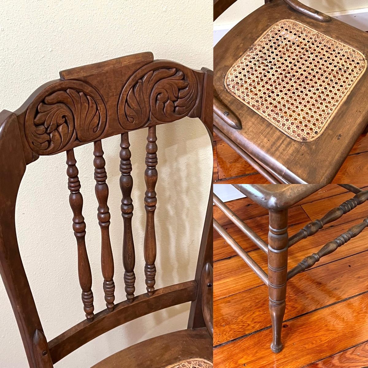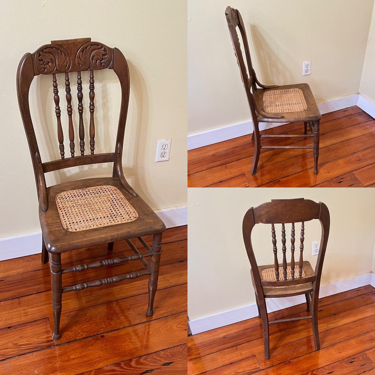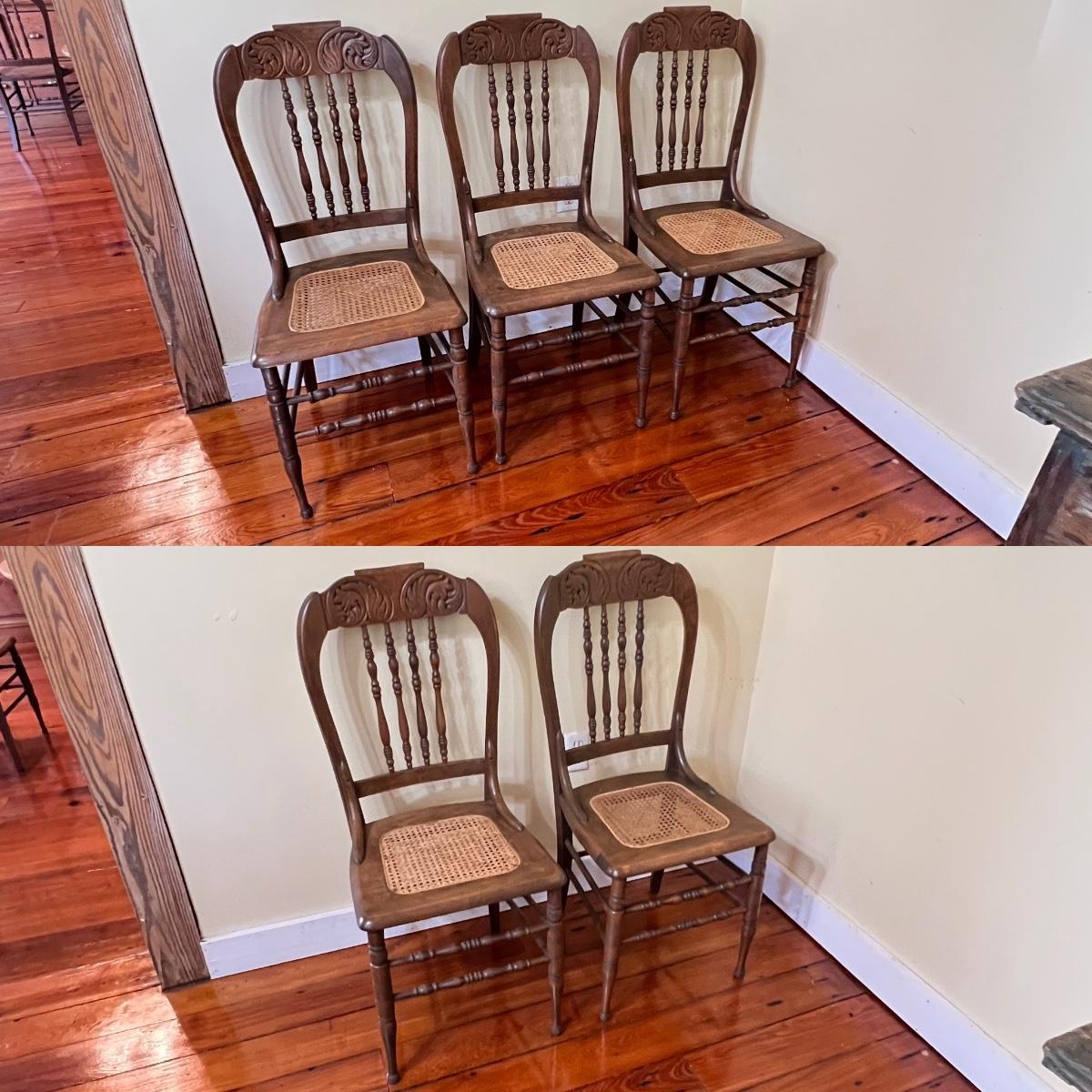 All cane is intact on all 5 chairs. 38.5” H x 16.5” W x 18” D.