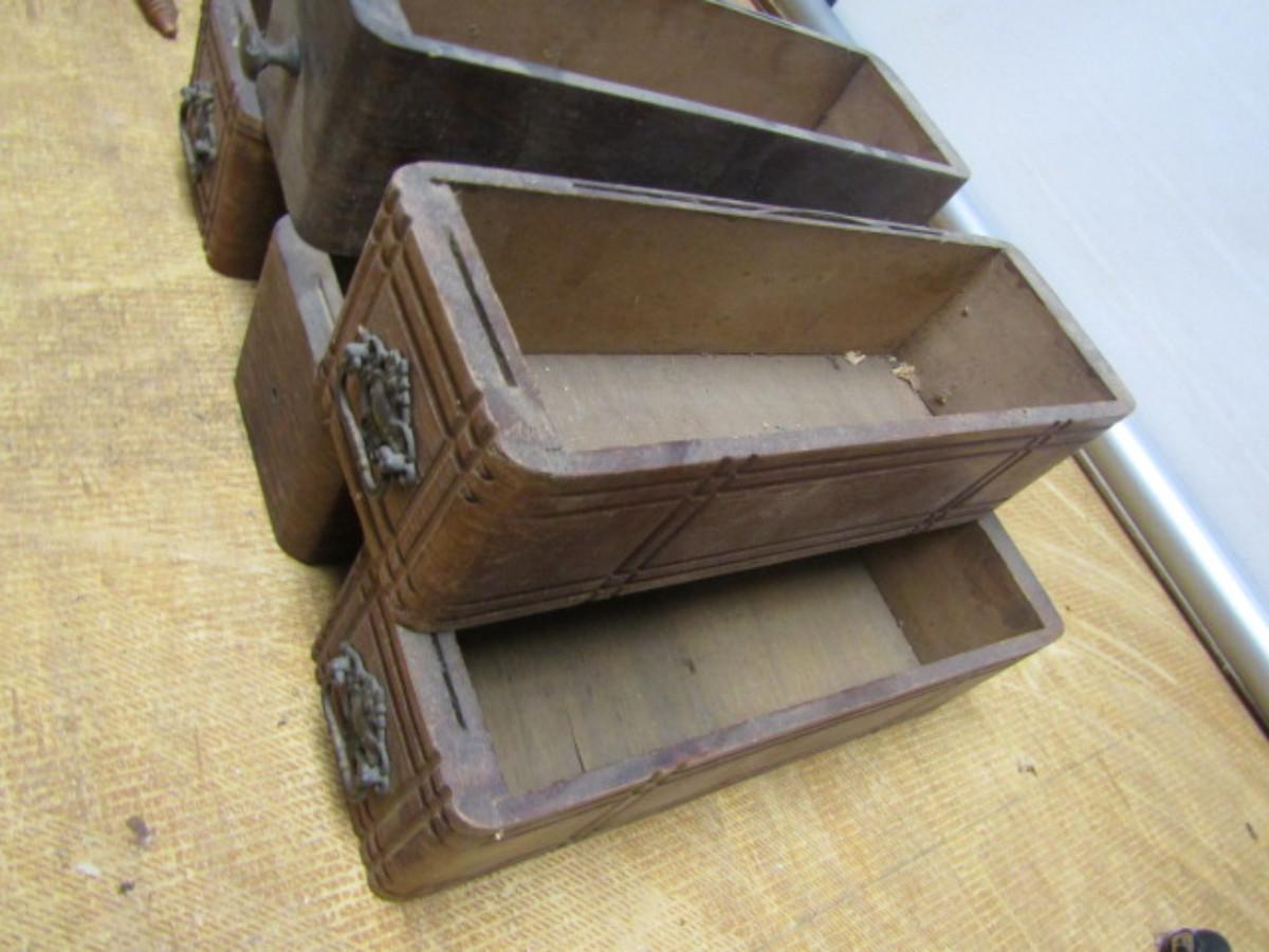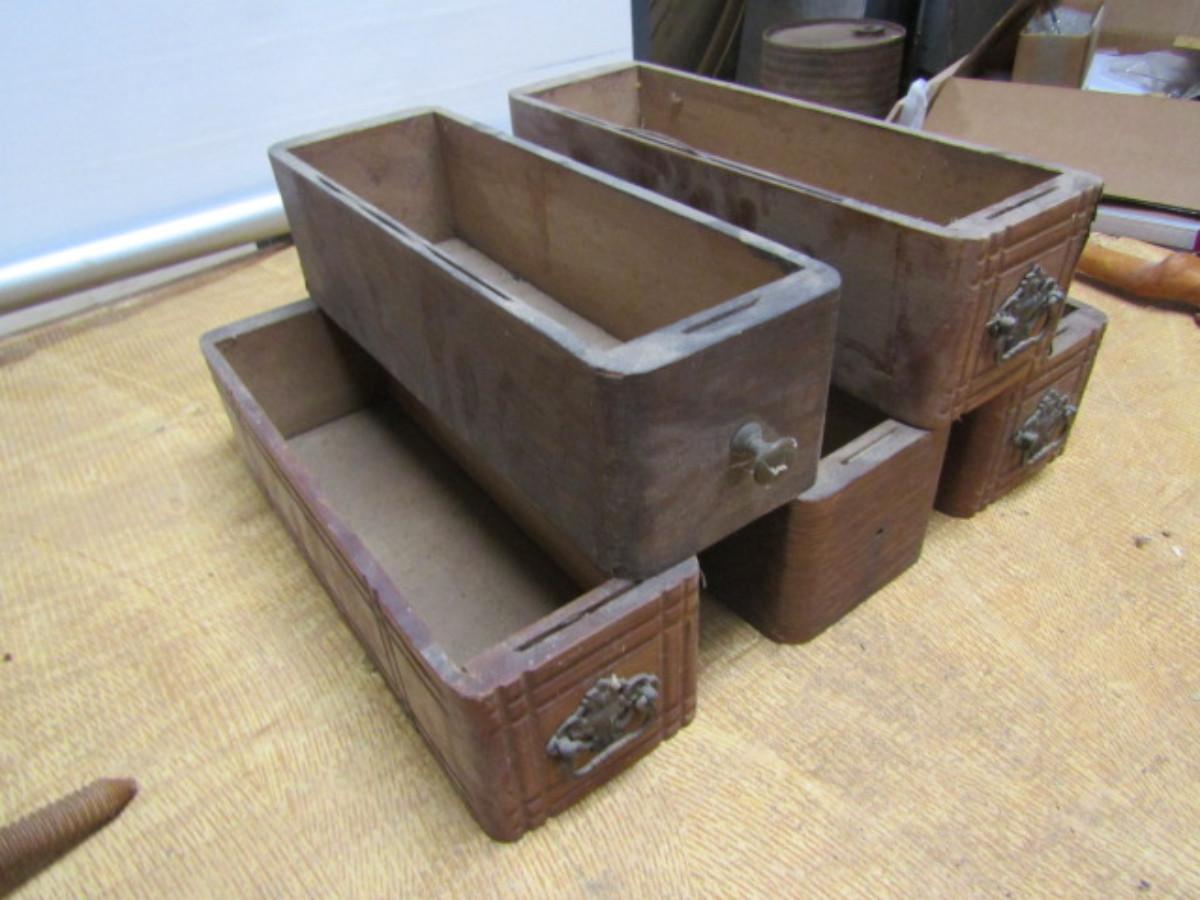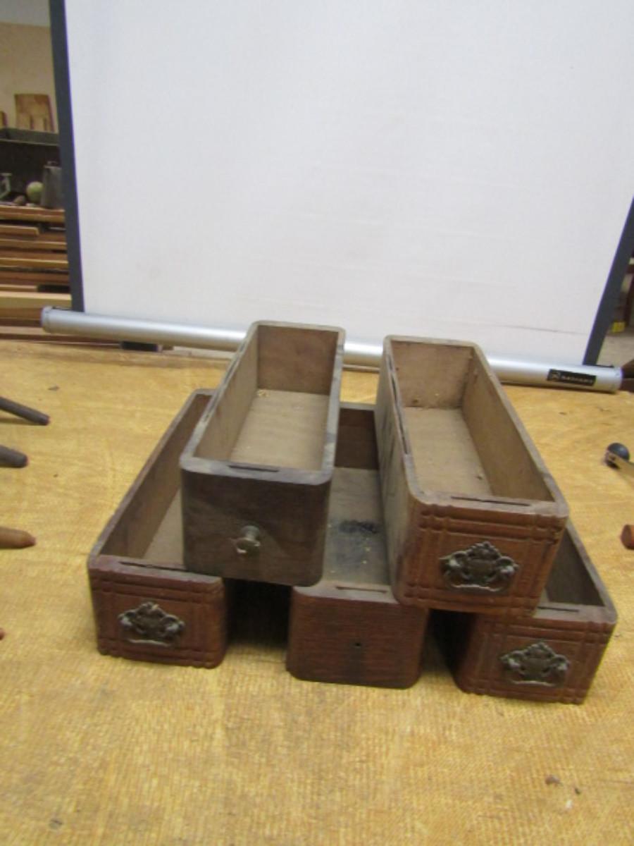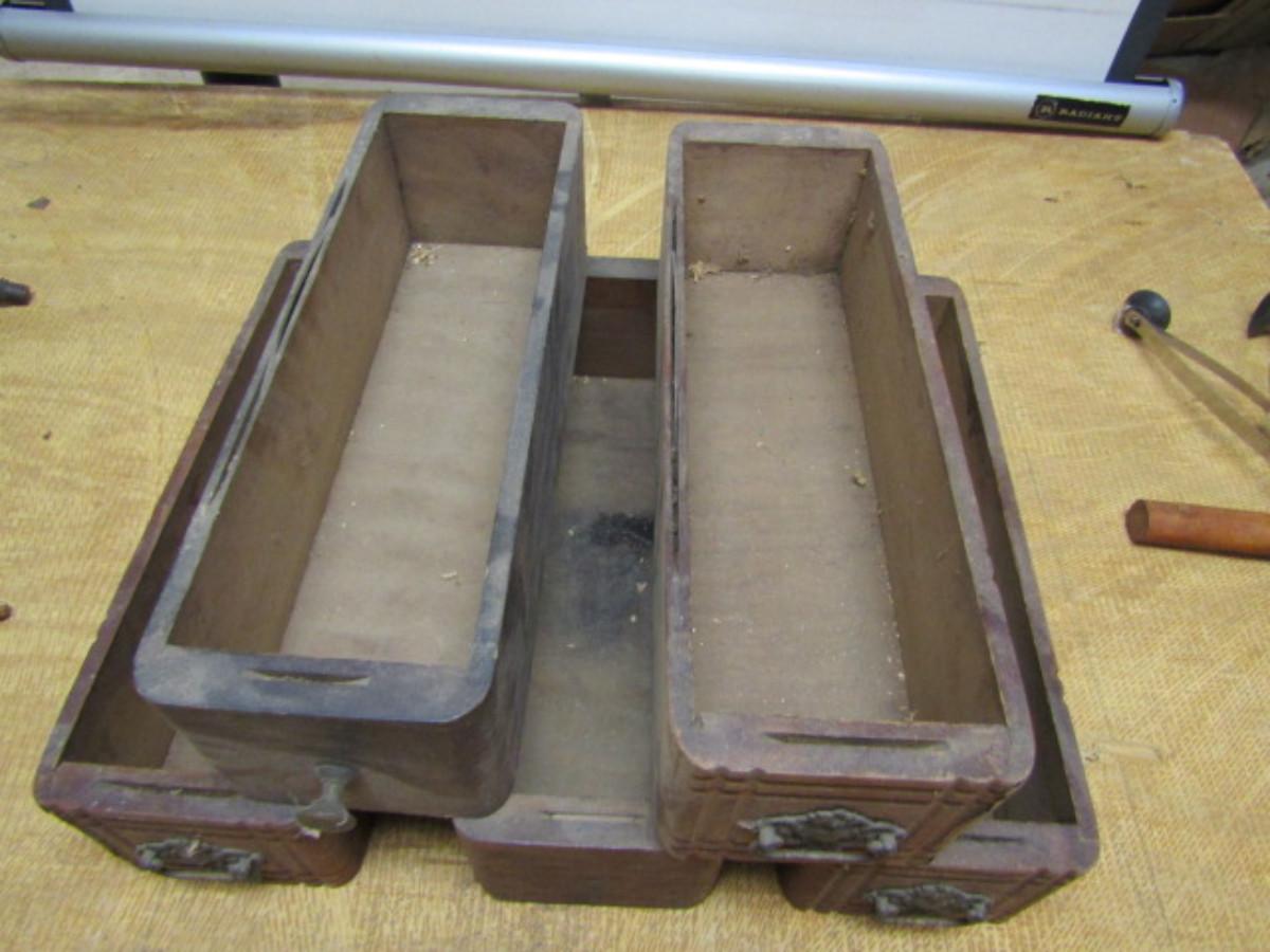 Set of Five Antique Sewing Machine Drawers. Stored in non-climatized basement so expect item may need to be cleaned from dust, insects, etc.