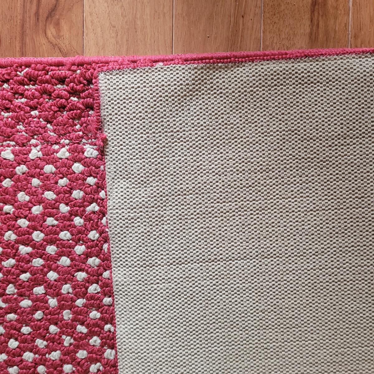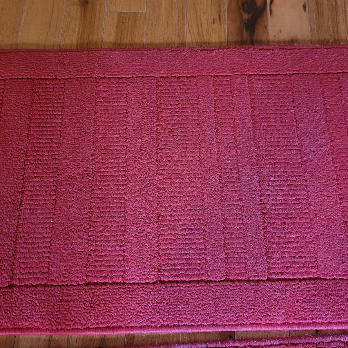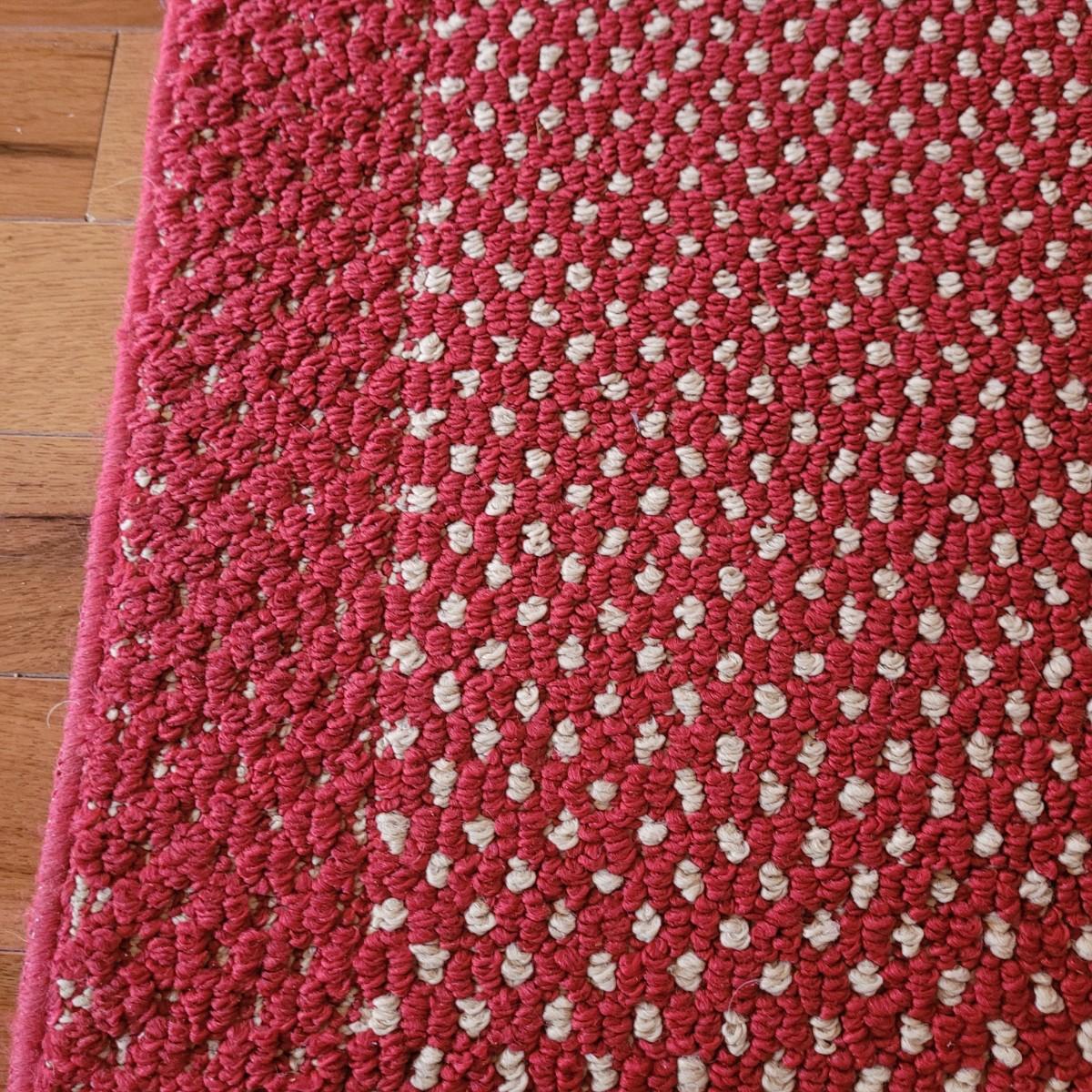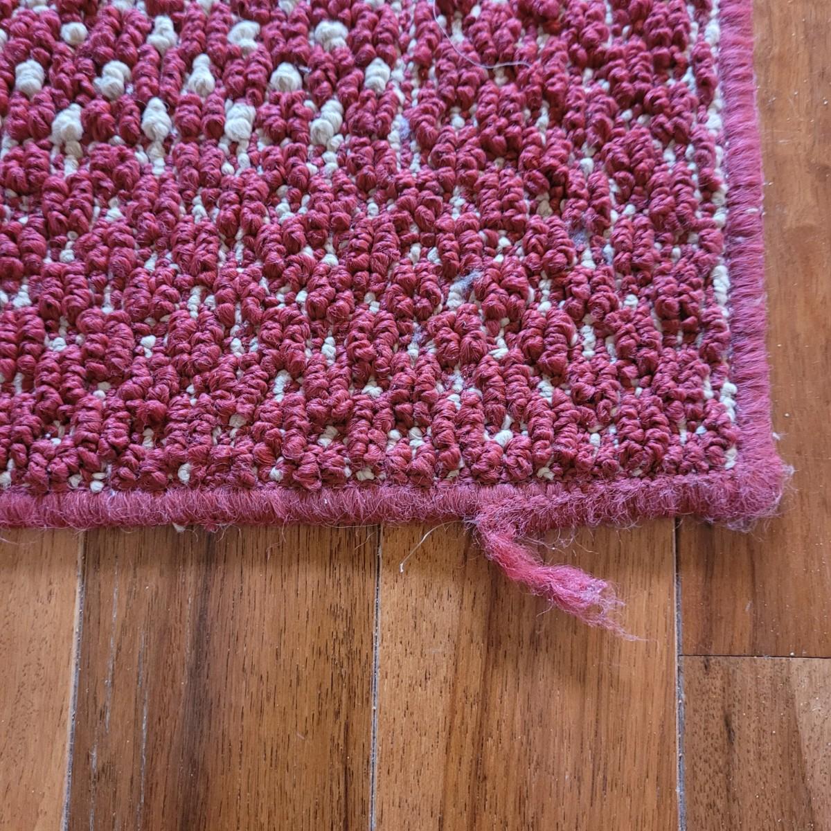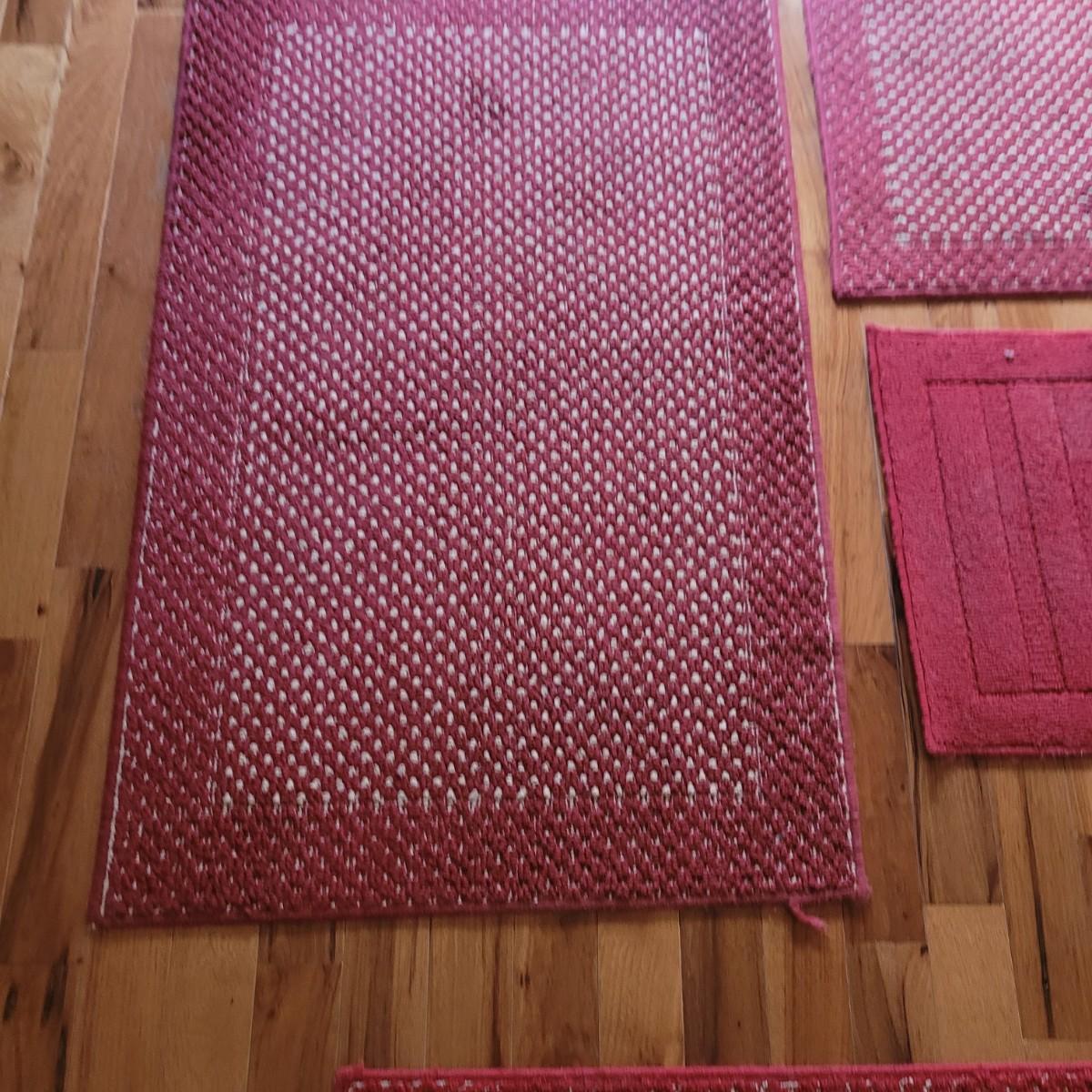 This set of five deep red and cream area rugs are made of synthetic materials with a grip bottom. Shows signs of normal use, with some fraying at the edges, and could use a deeper clean. Large rectangular rugs measure approximately 47” x 30”, runner 21.5” x 60”, small rectangular 20” x 34”. Please see photos for details. Local pickup only.