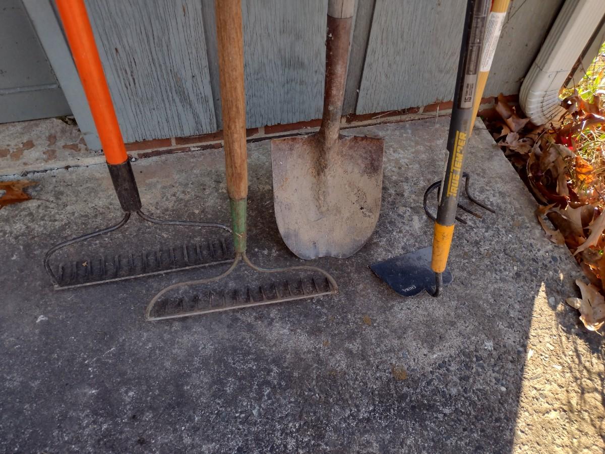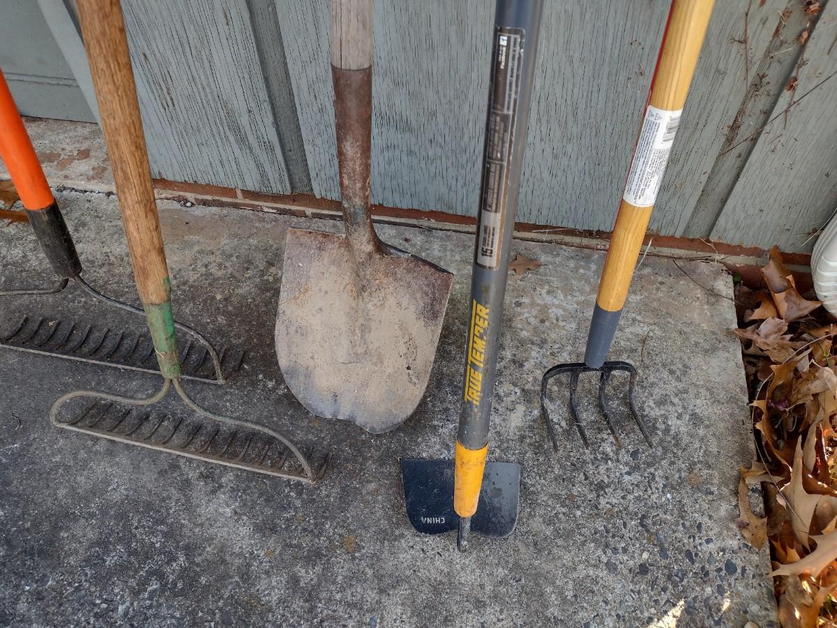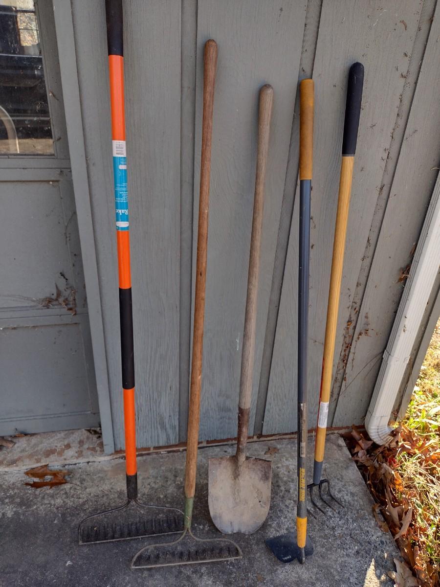 Set of Five Garden Hand Tools Includes Rakes, Shovel, and Hoes