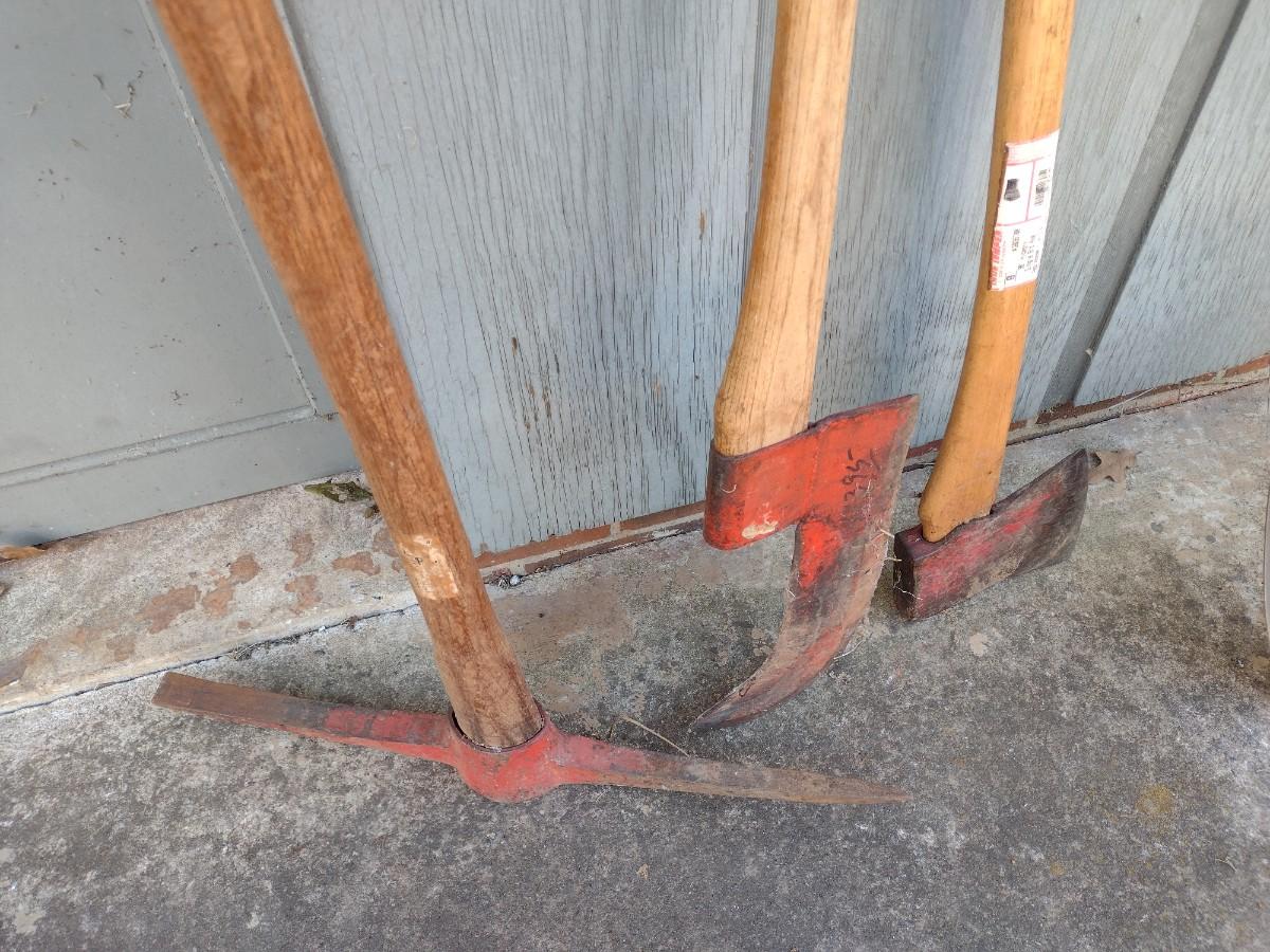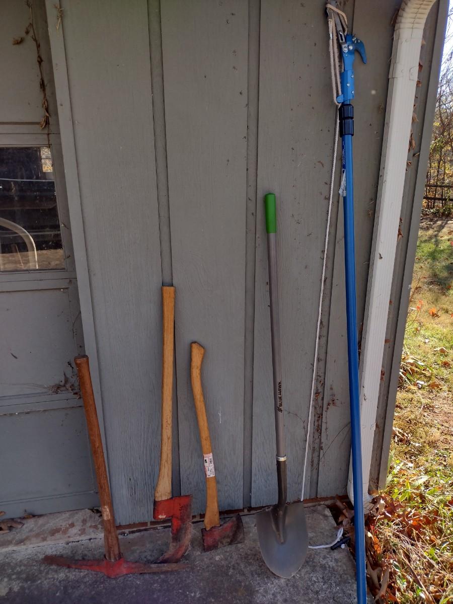 Set of Five Garden Hand Tools Includes Bush Ax, Wood Ax, Shovel and Telescoping Branch Trimmer
