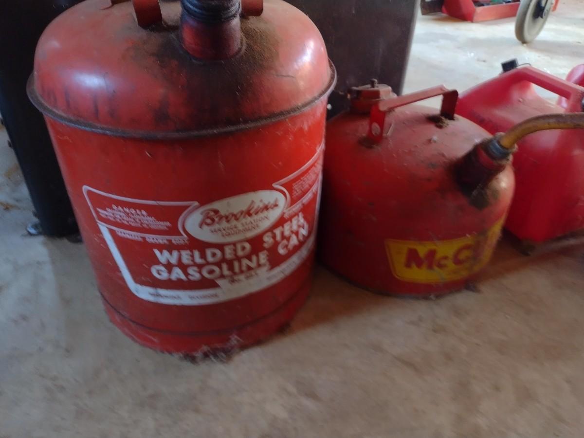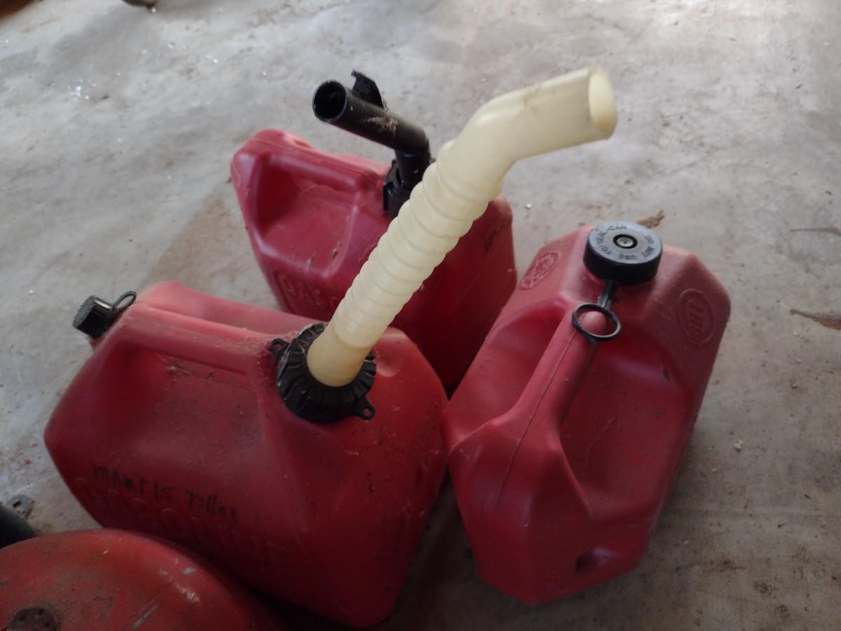 Set of Five Gas Cans Metal and Plastic Various Sizes