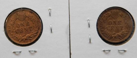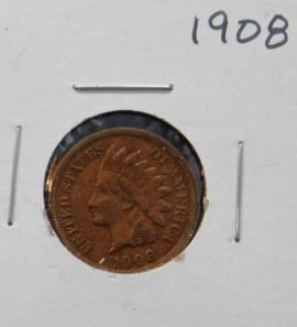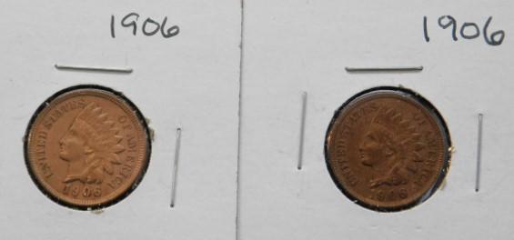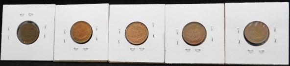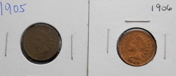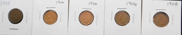 Set of Five Indian Head US Mint One Cent Pieces 1905, 1906, 1906, 1906, 1908 Circulated VG/F++/VF+