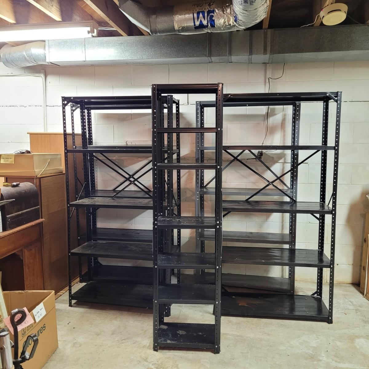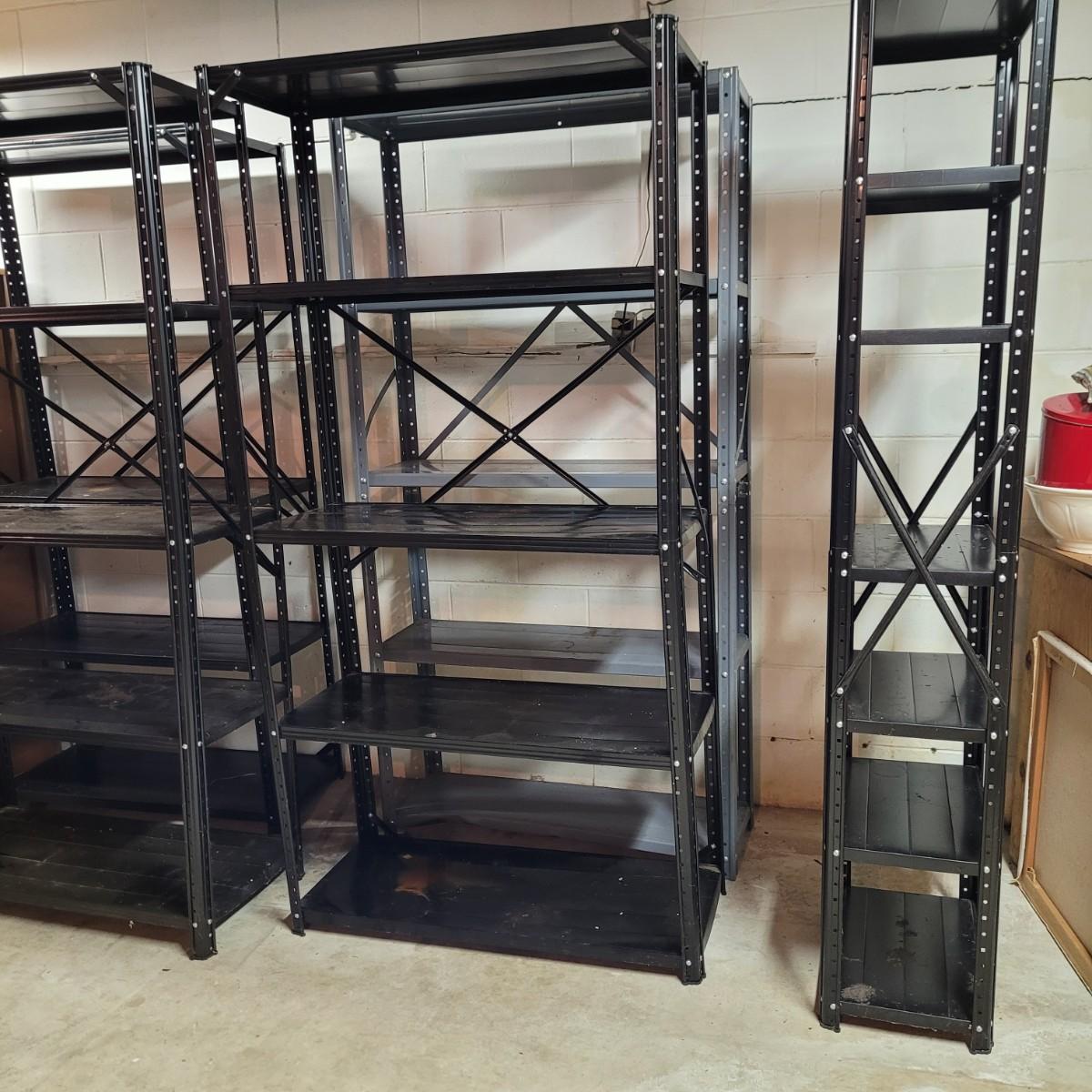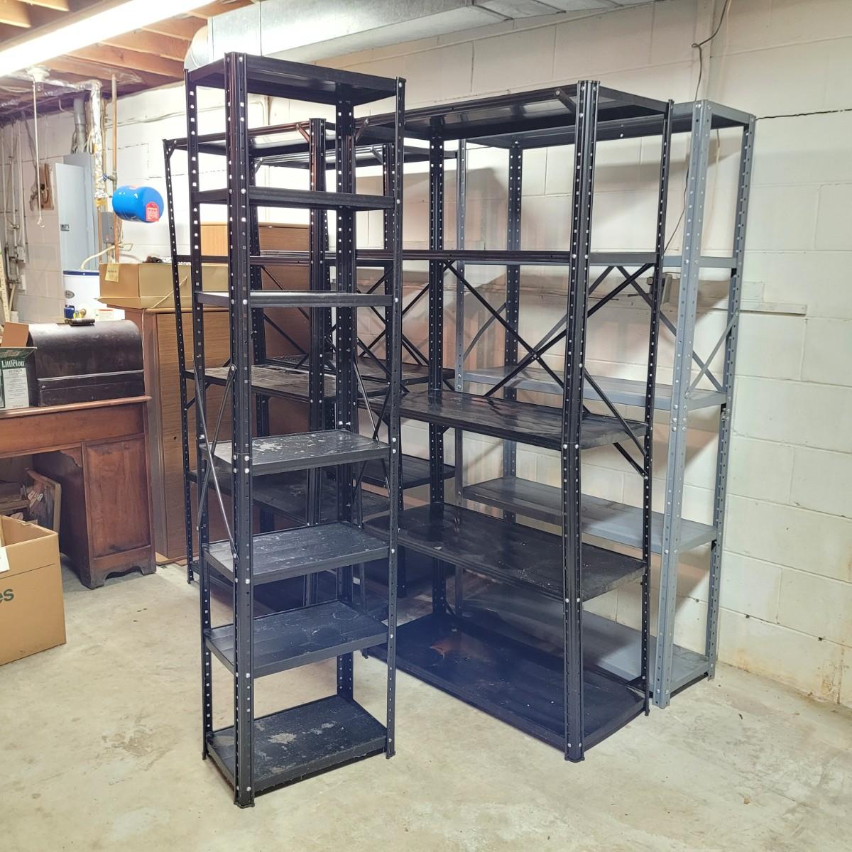 Metal shelves include four wider shelves, each with five adjustable shelves, measuring approximately 36"L x16"D x71"H. Narrow shelf has seven adjustable shelves, measuring approximately 18"L x12"D x71"H. Local pickup only.