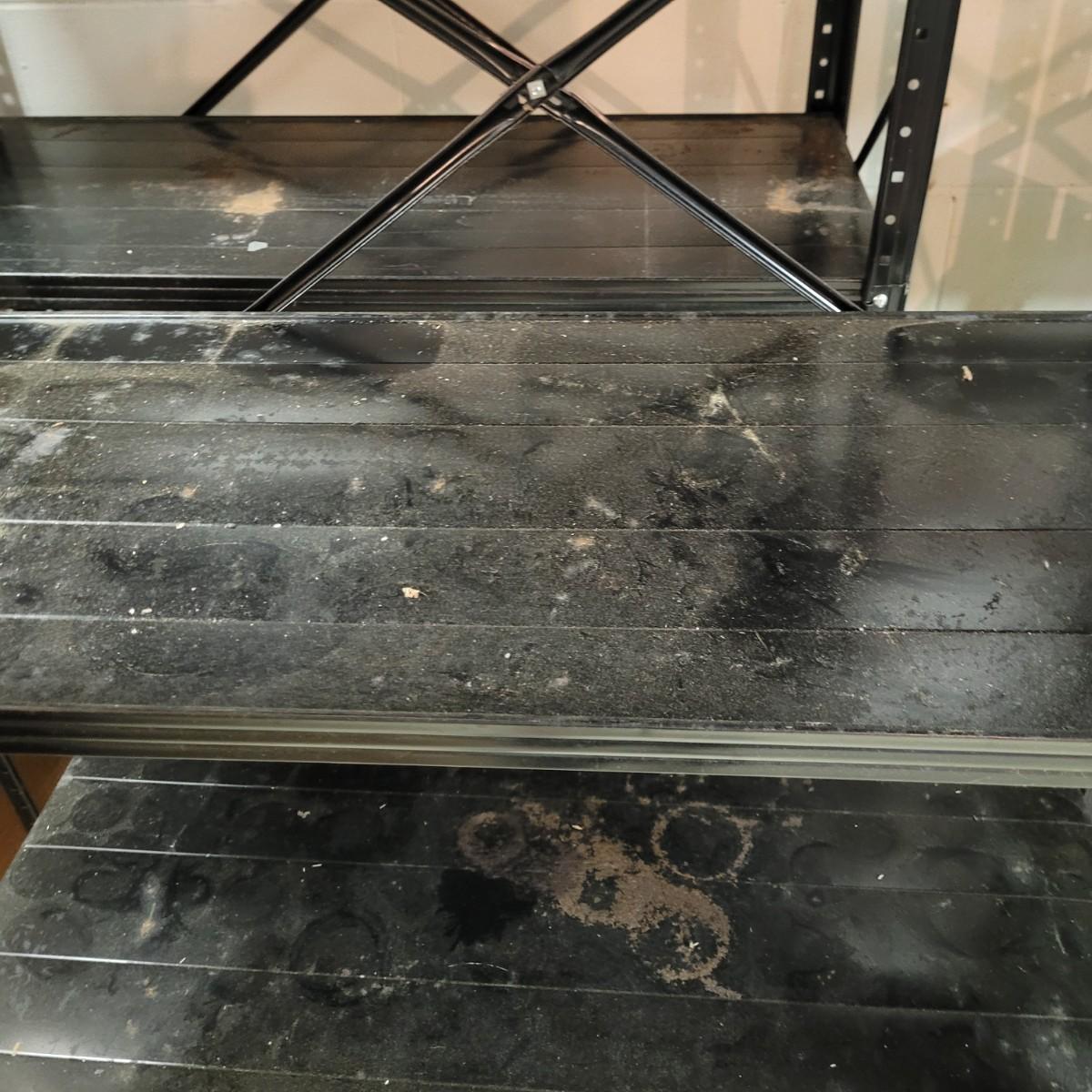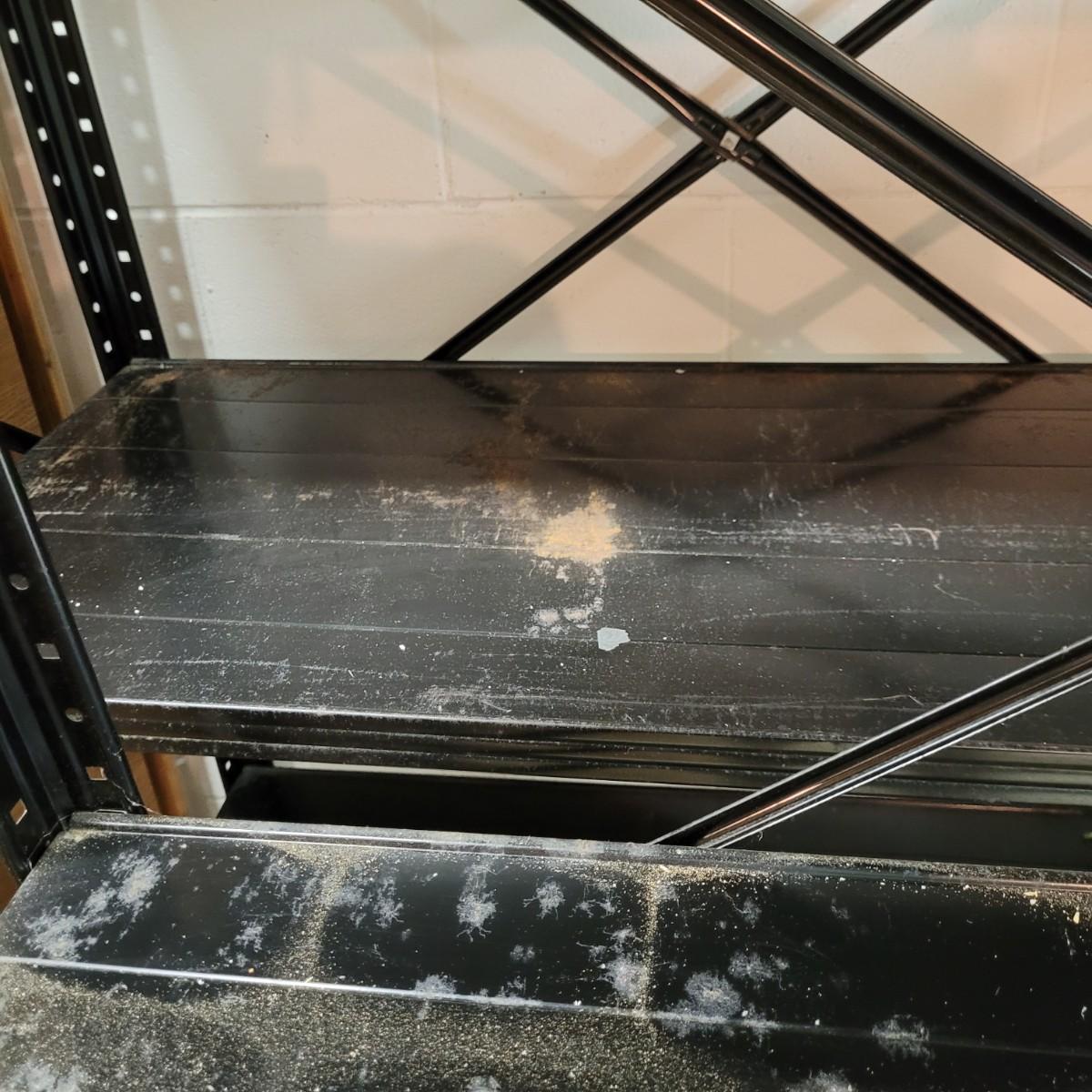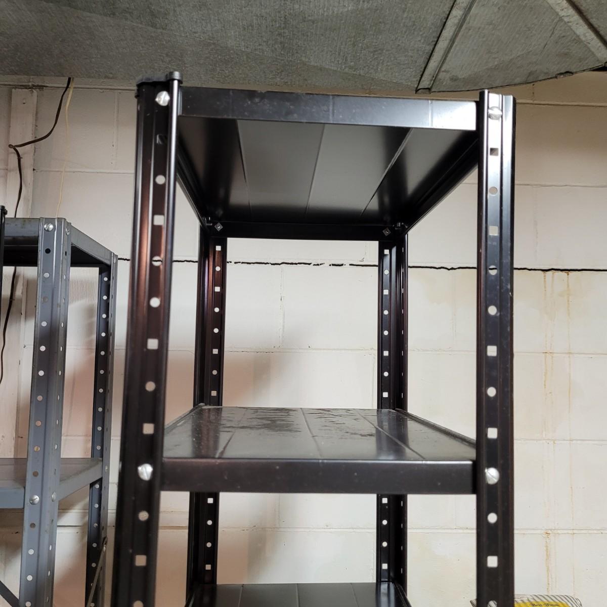 Metal shelves include four wider shelves, each with five adjustable shelves, measuring approximately 36"L x16"D x71"H. Narrow shelf has seven adjustable shelves, measuring approximately 18"L x12"D x71"H. Local pickup only.