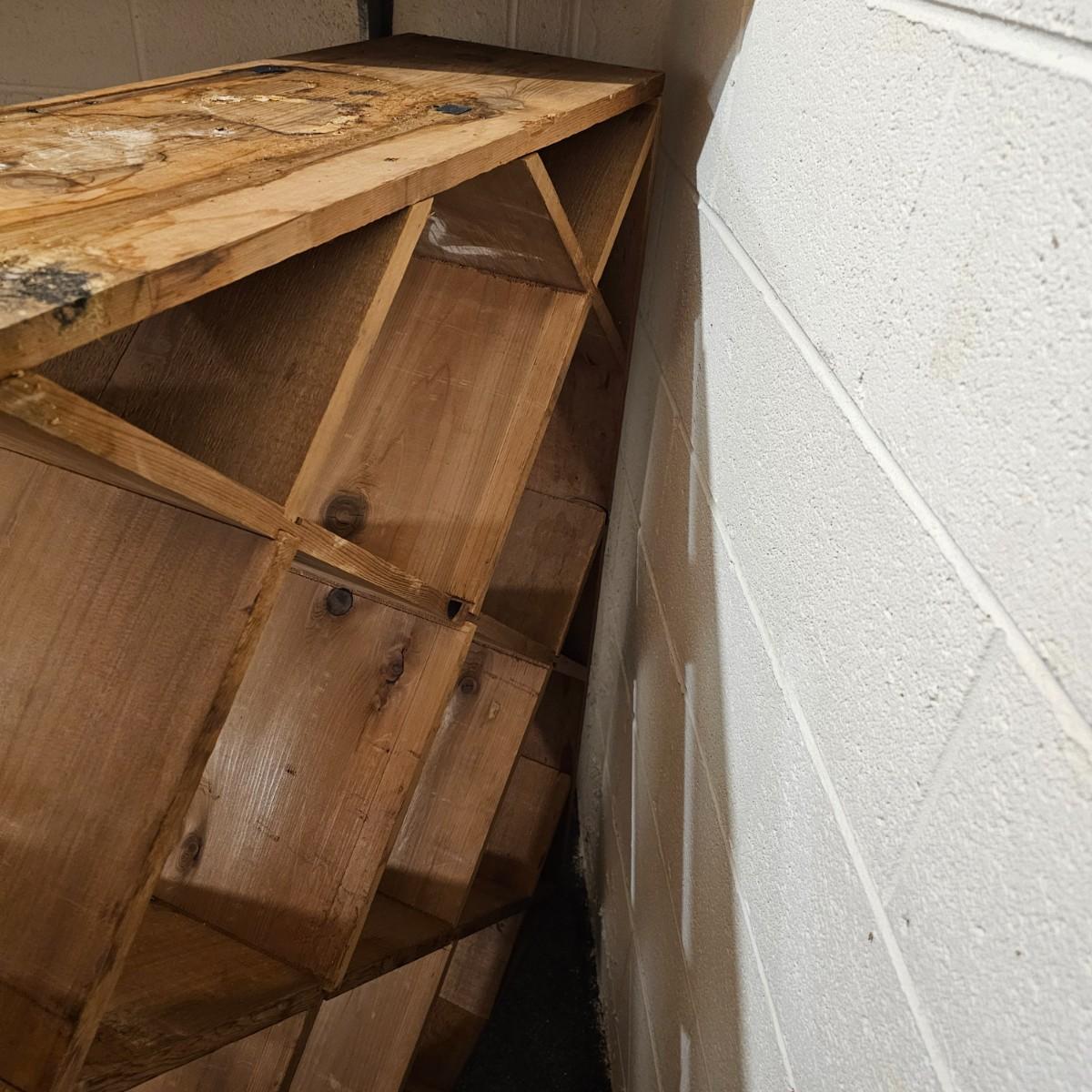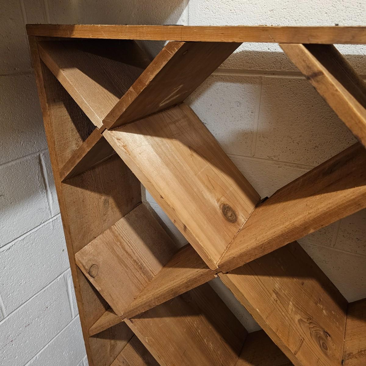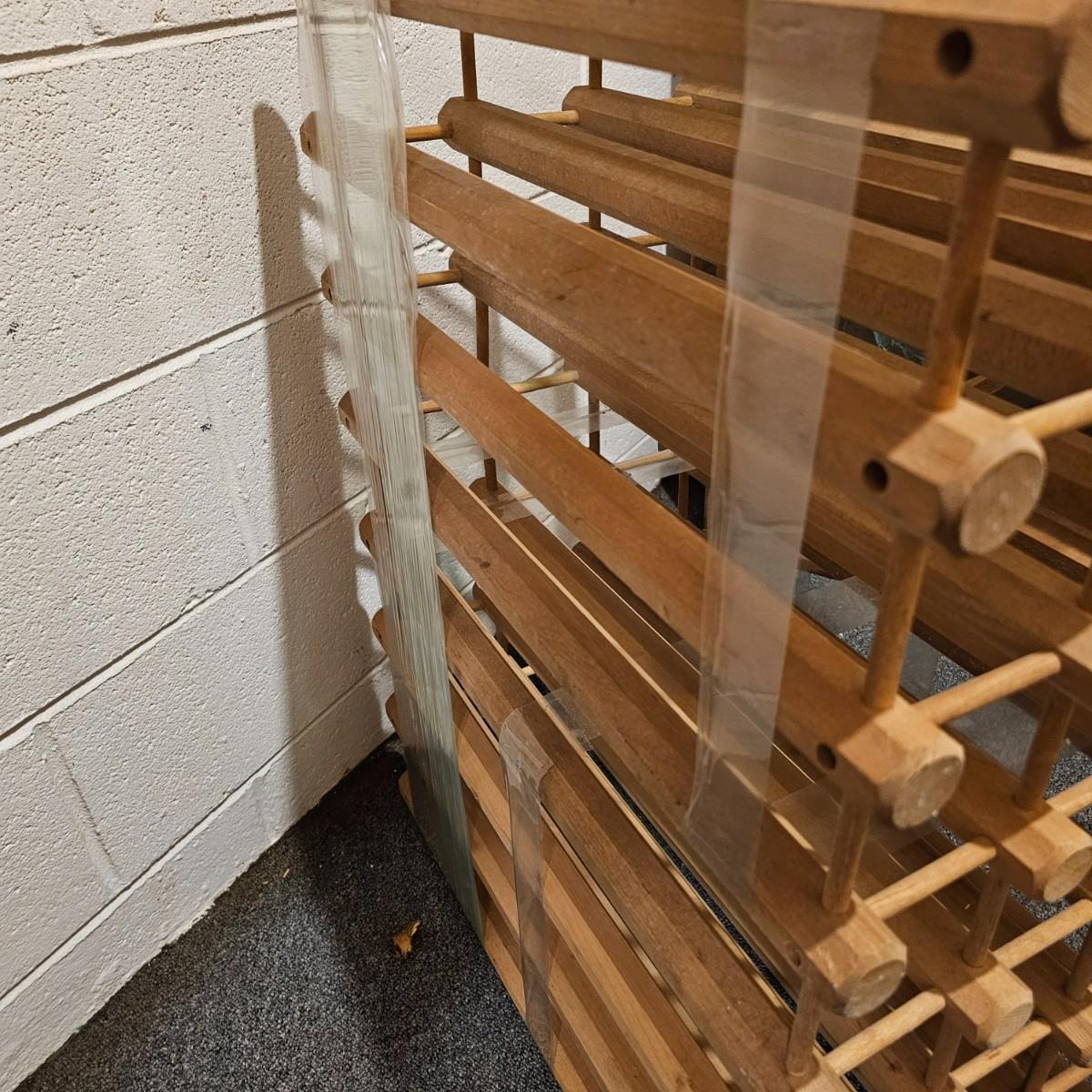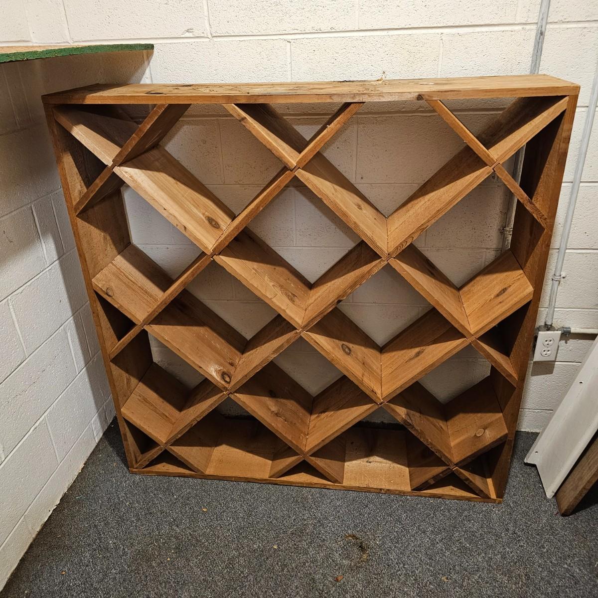 One large angle storage cedar wine racks, three stack type wooden racks and one rack to be assembled, also wood, appears to be maple. Large rack measures 48" x 11" x 48"H, will hold approximately two dozen bottles or more. Three similar style racks can be stacked with pins, included, and measure 13.5" x 23" x 17.5", 21.5" and 30"H. Will hold bottles on either side, approximately 96 total. Unassembled rack has cross base pieces and long stringers with grooves for bottles. See photos for details. Local pickup only.