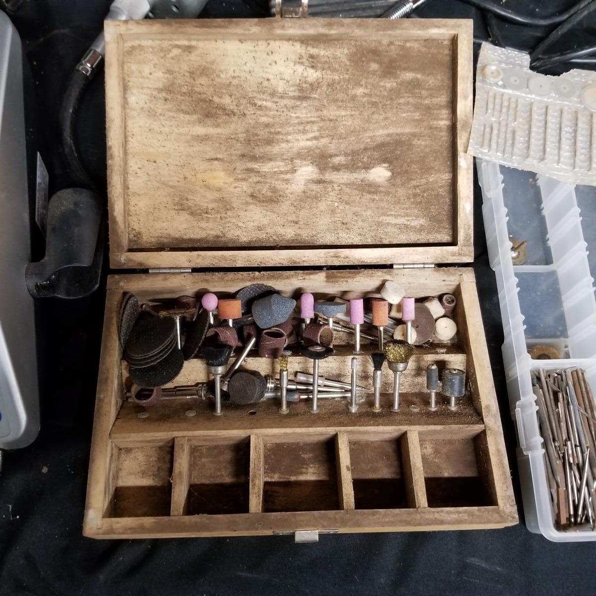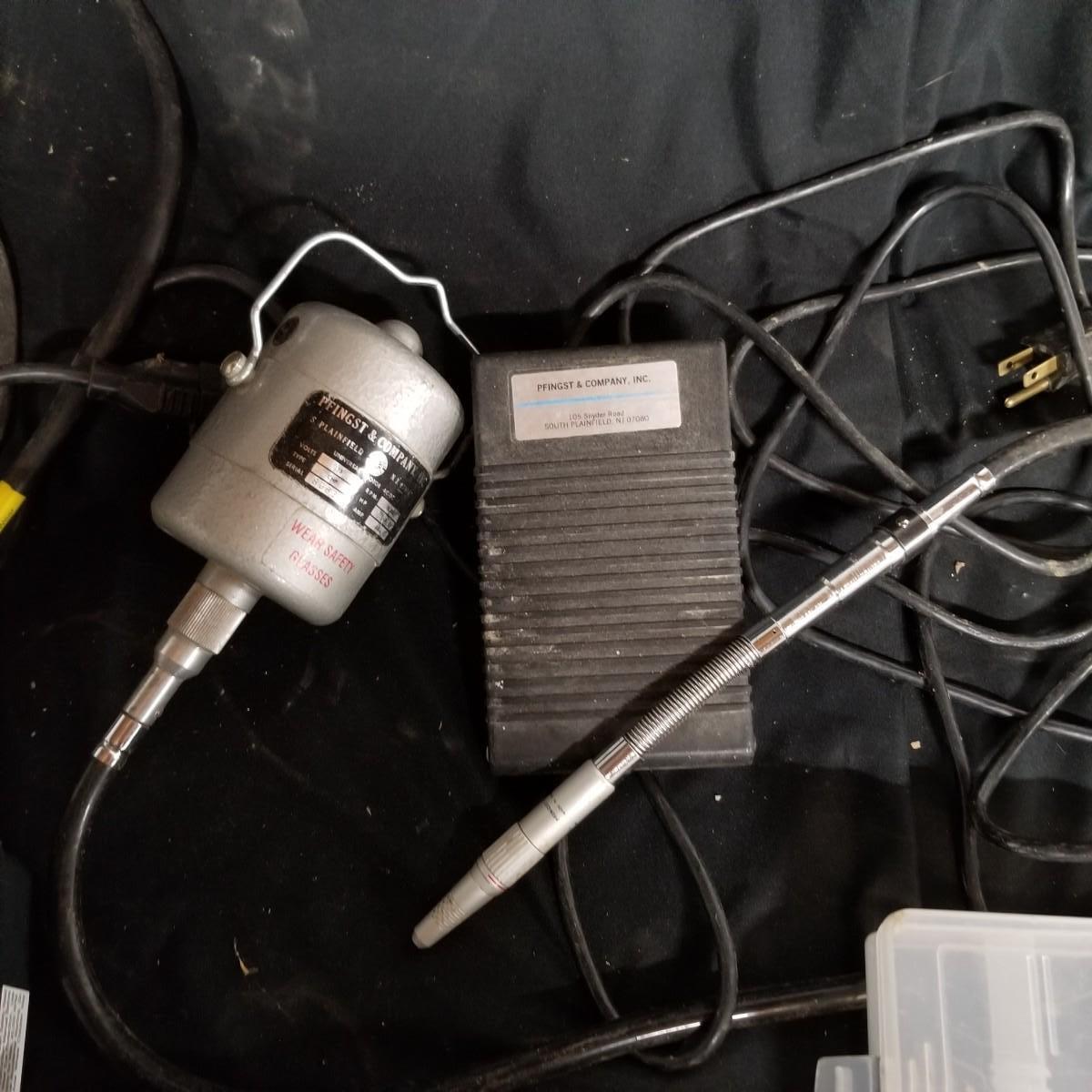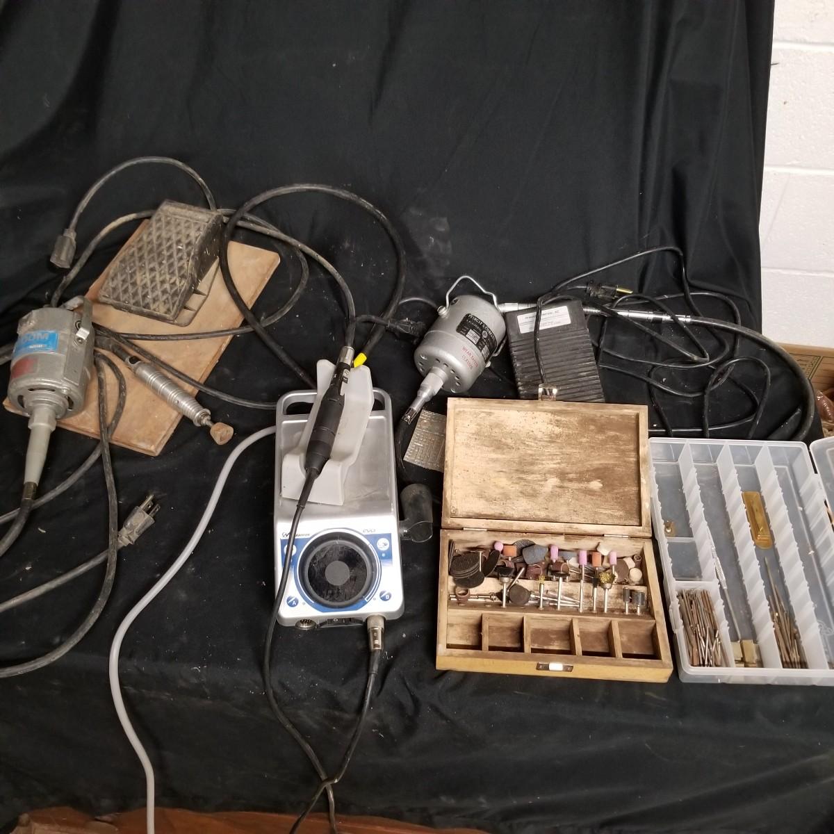 Three flex shaft tools and accessories. One Foredom with foot pedal and standard hand-piece, one Pfingst with foot pedal and 432 hand-piece, and one Nakanishi electronic control Evolution unit with adjustable speed dial.  Unit can take two hand-pieces, only one is available with this lot.  Also two boxes assorted drills, stones, sanders and wheels.  All items tested working.  Local pickup only.