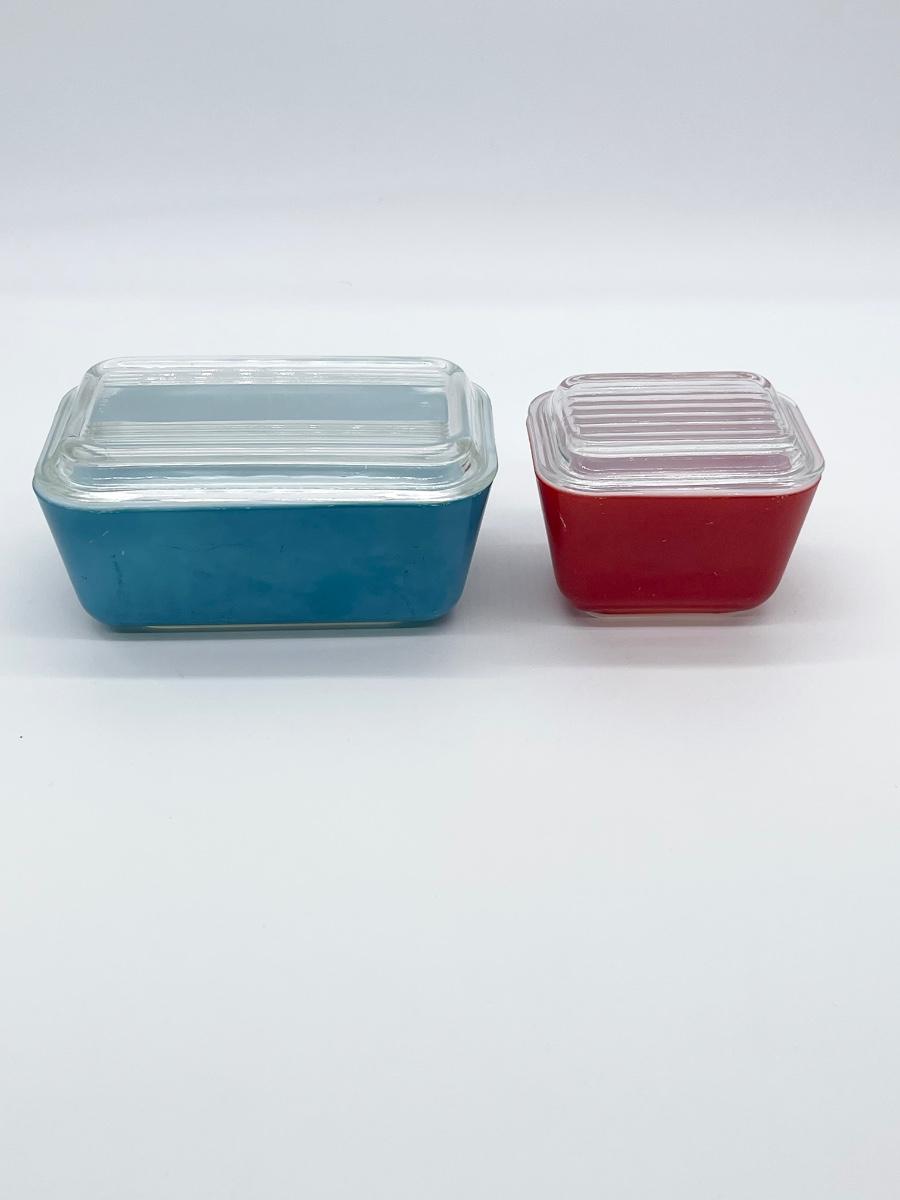 1 - Red Pyrex = 2.5” H x 4” W x 3.25” D ~ lid on blue dish has minor chip
