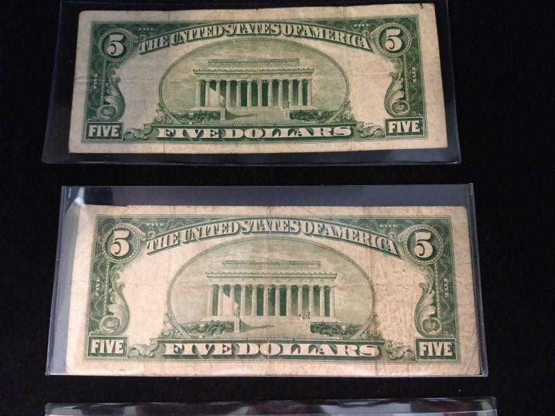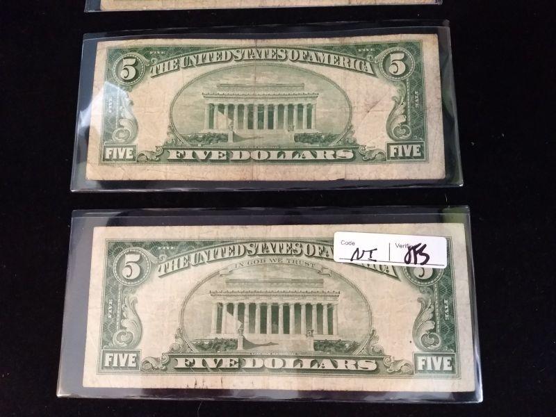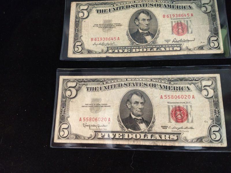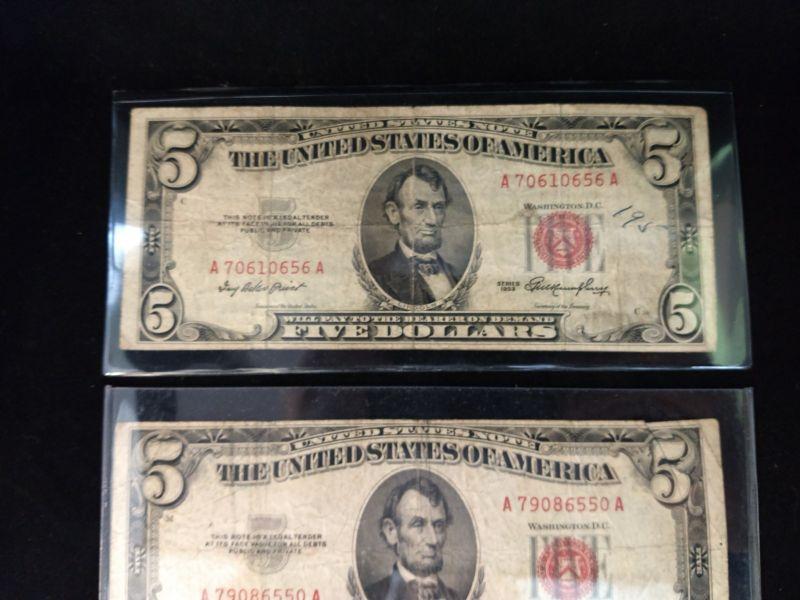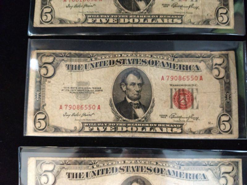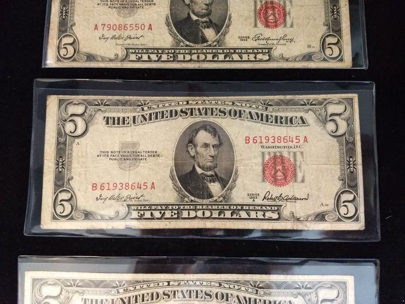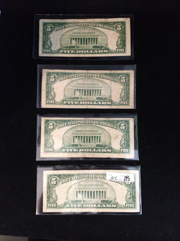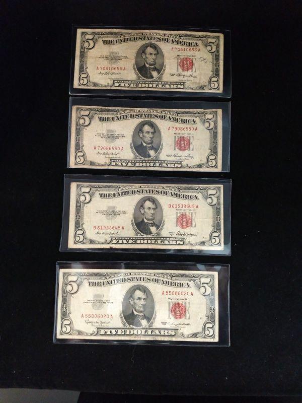 Set of Four $5 US Paper Currency Red Seal Circulated