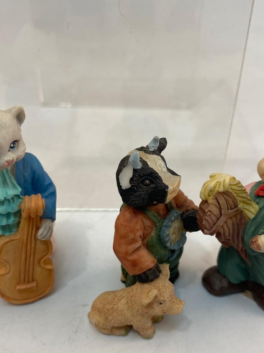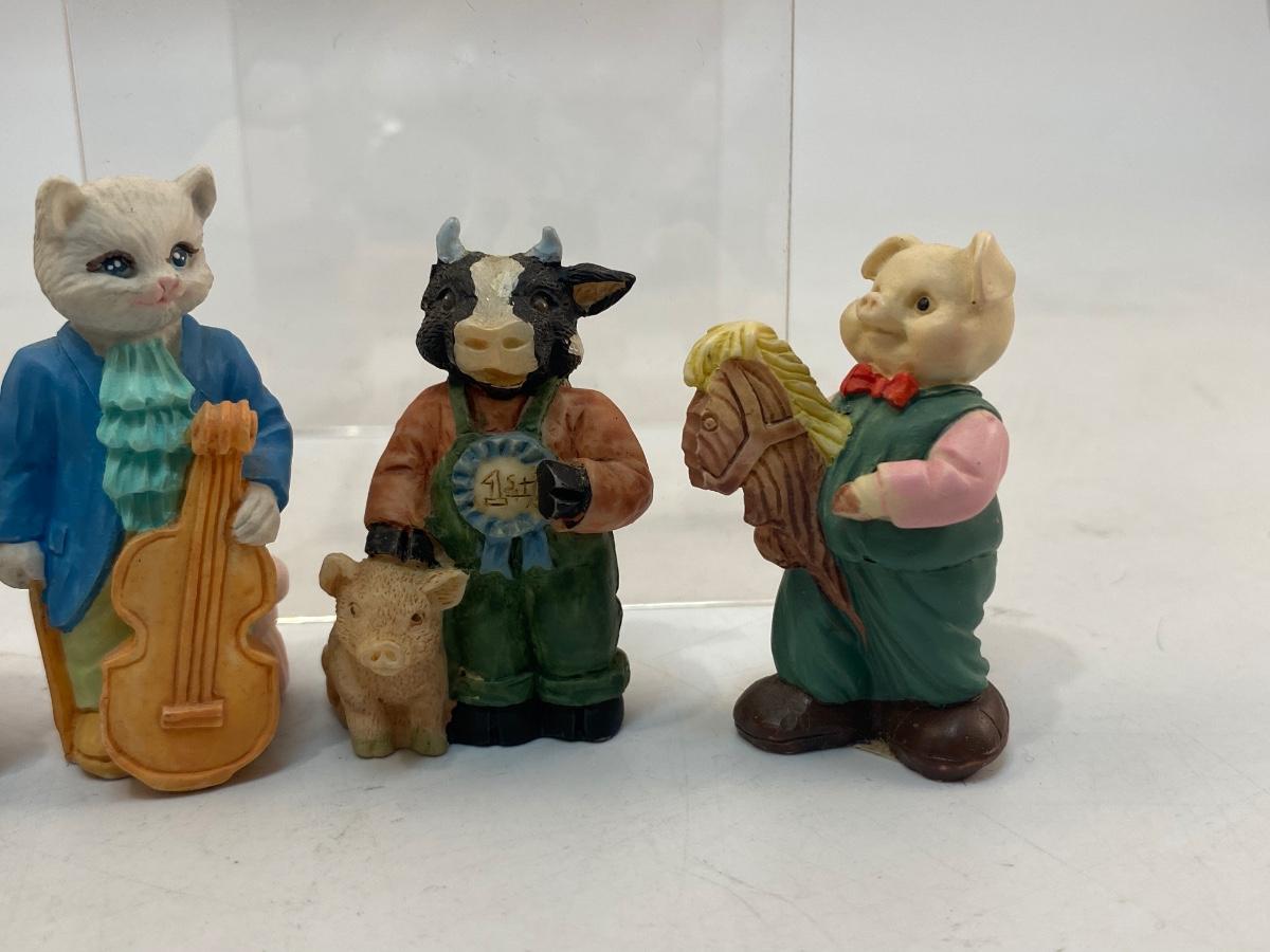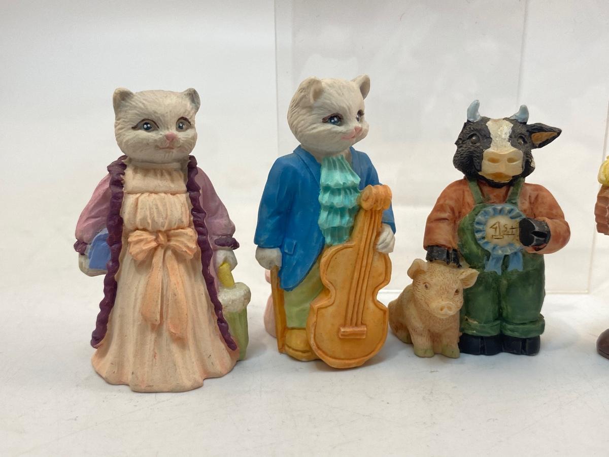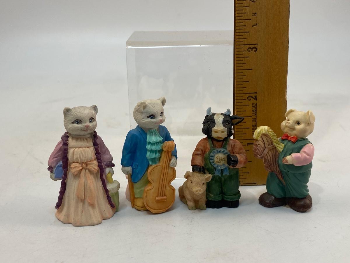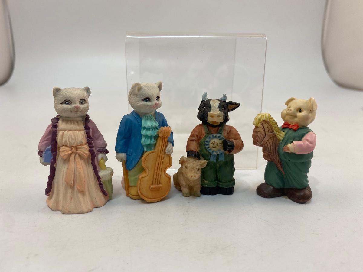 Set of Four Animal Miniature Figurines Cats Cow Pig. Fancy dressed cats, blue ribbon winning cow, and happy pifg on wood horse. The cow is missing an ear unfortunately. Under 2" tall.