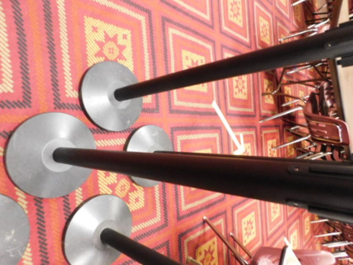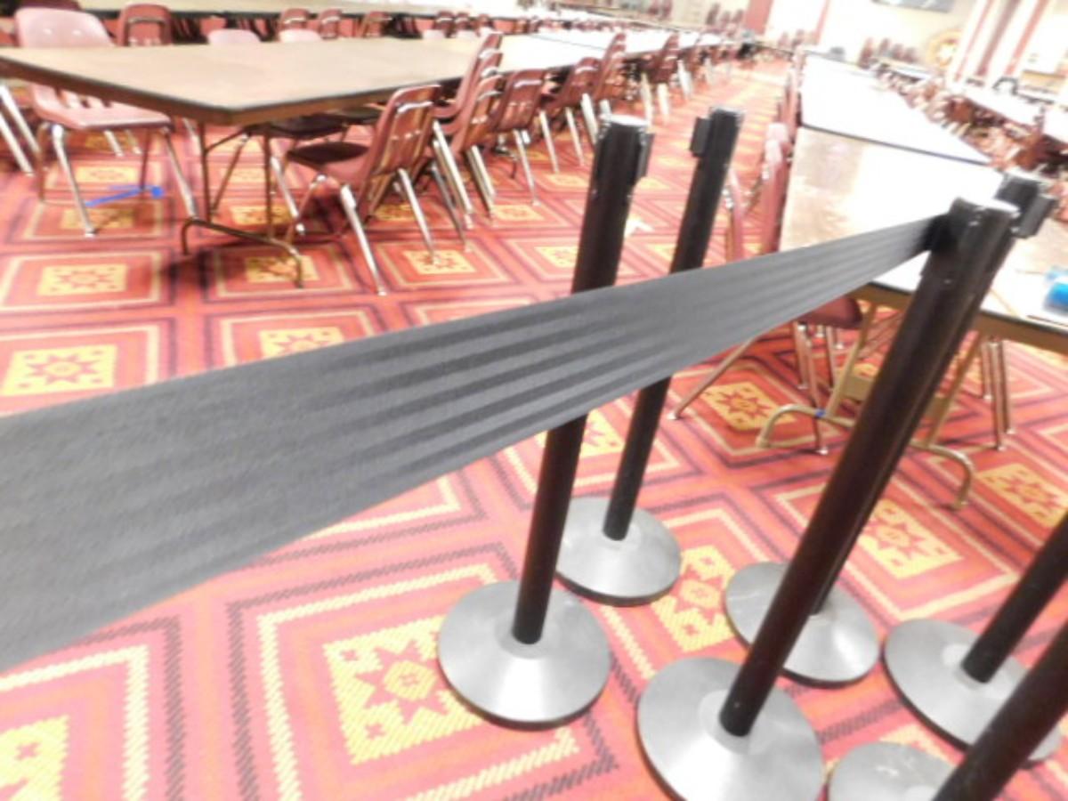 Set of Four Black Finish Stanchions with Blank Black Barrier Ribbon Choice A Expect some wear or scratches to finish. Shipping option available via freight or local mover at Buyer's expense. Buyer must have all shipping scheduled within the stated dates and times of pickup. Recommended local mover is Beaty Bros. Moving 828-201-2982