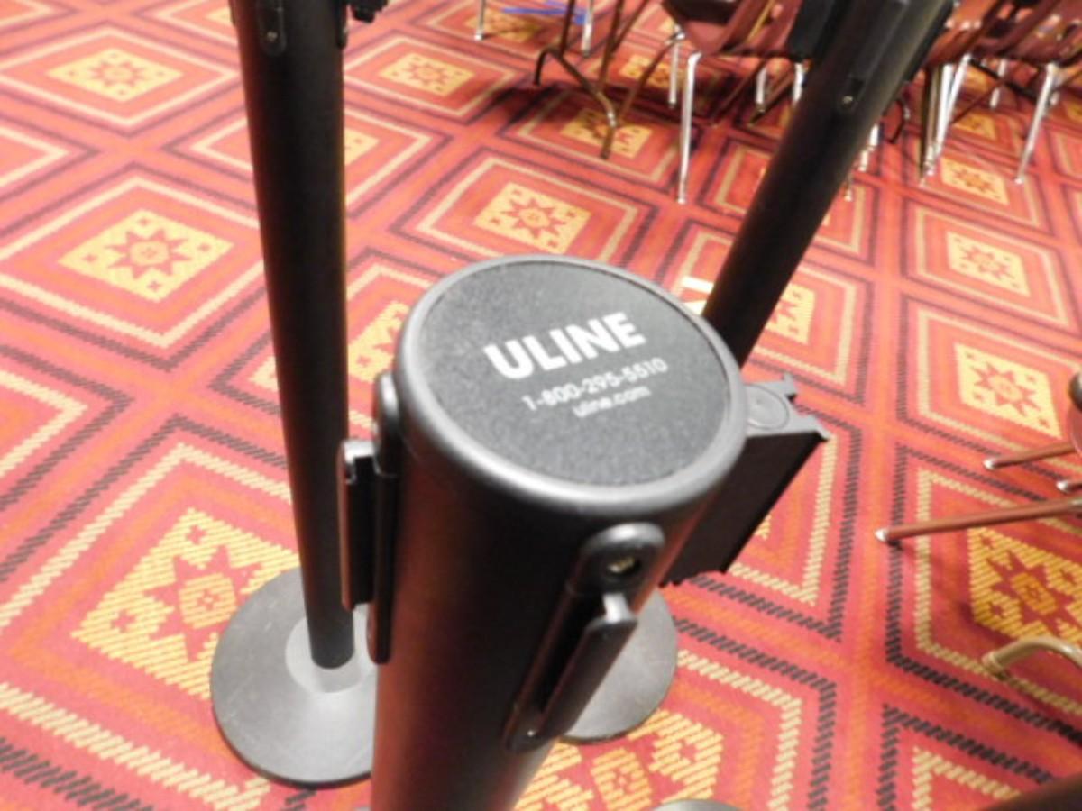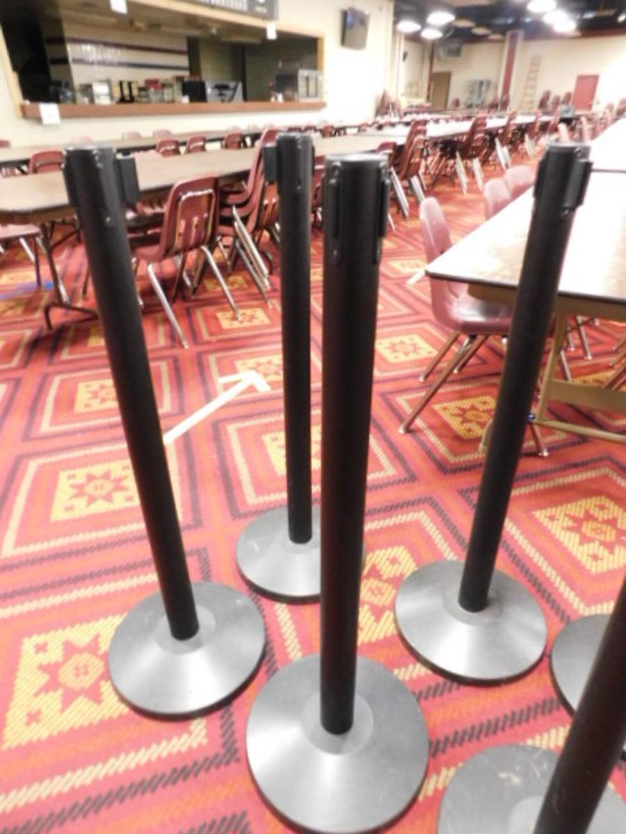 Set of Four Black Finish Stanchions with Blank Black Barrier Ribbon Choice B Expect some wear or scratches to finish. Shipping option available via freight or local mover at Buyer's expense. Buyer must have all shipping scheduled within the stated dates and times of pickup. Recommended local mover is Beaty Bros. Moving 828-201-2982