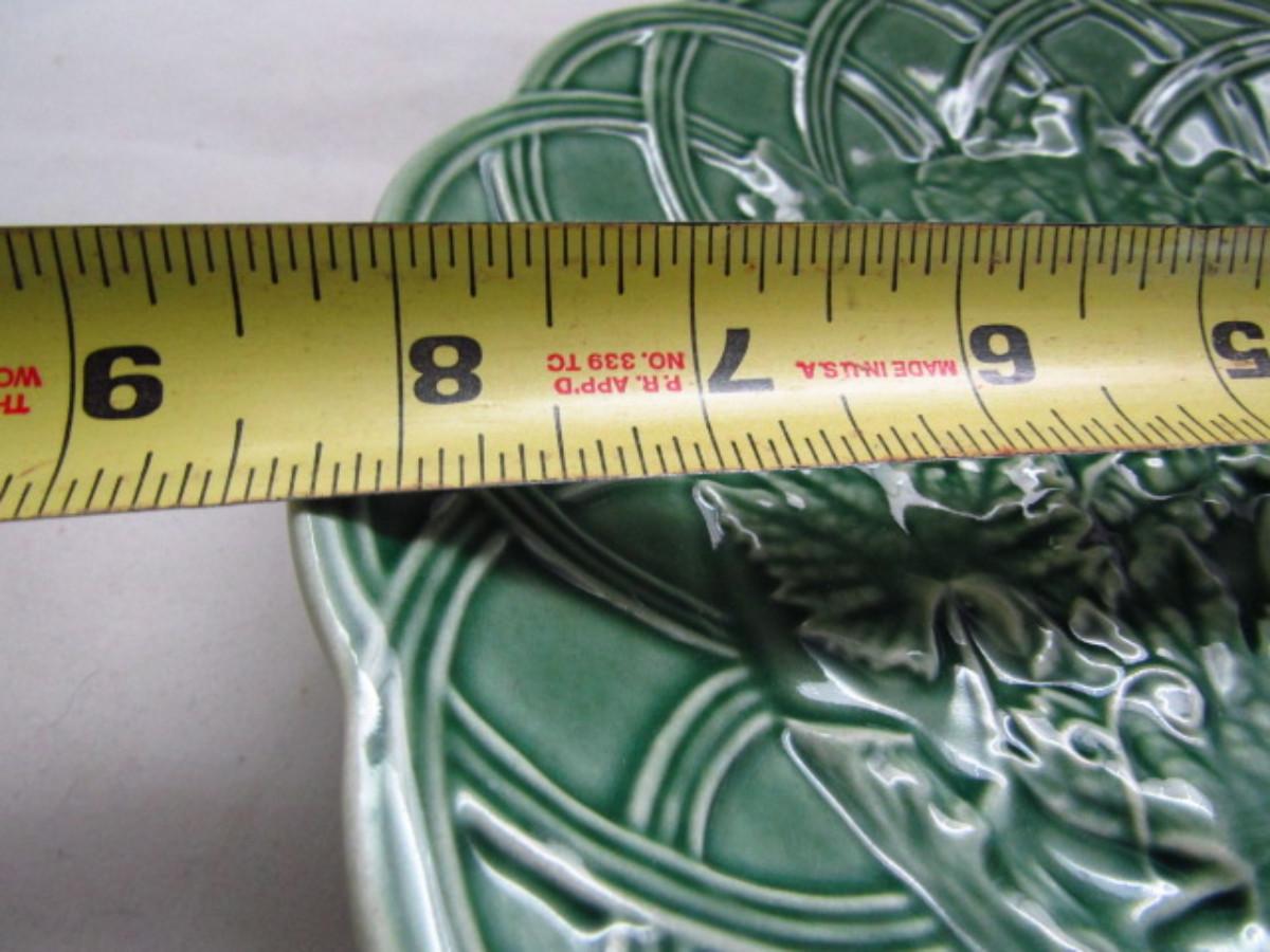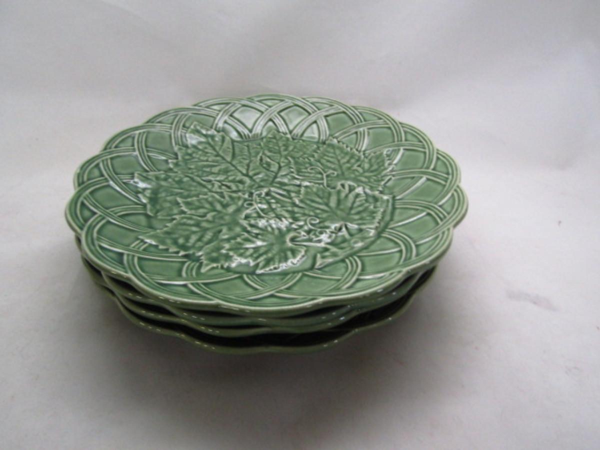 Set of Four Bordallo Pinheiro Plates- Leaves and Lattice- Made in Portugal. Each measures approx 8 1/4" across.