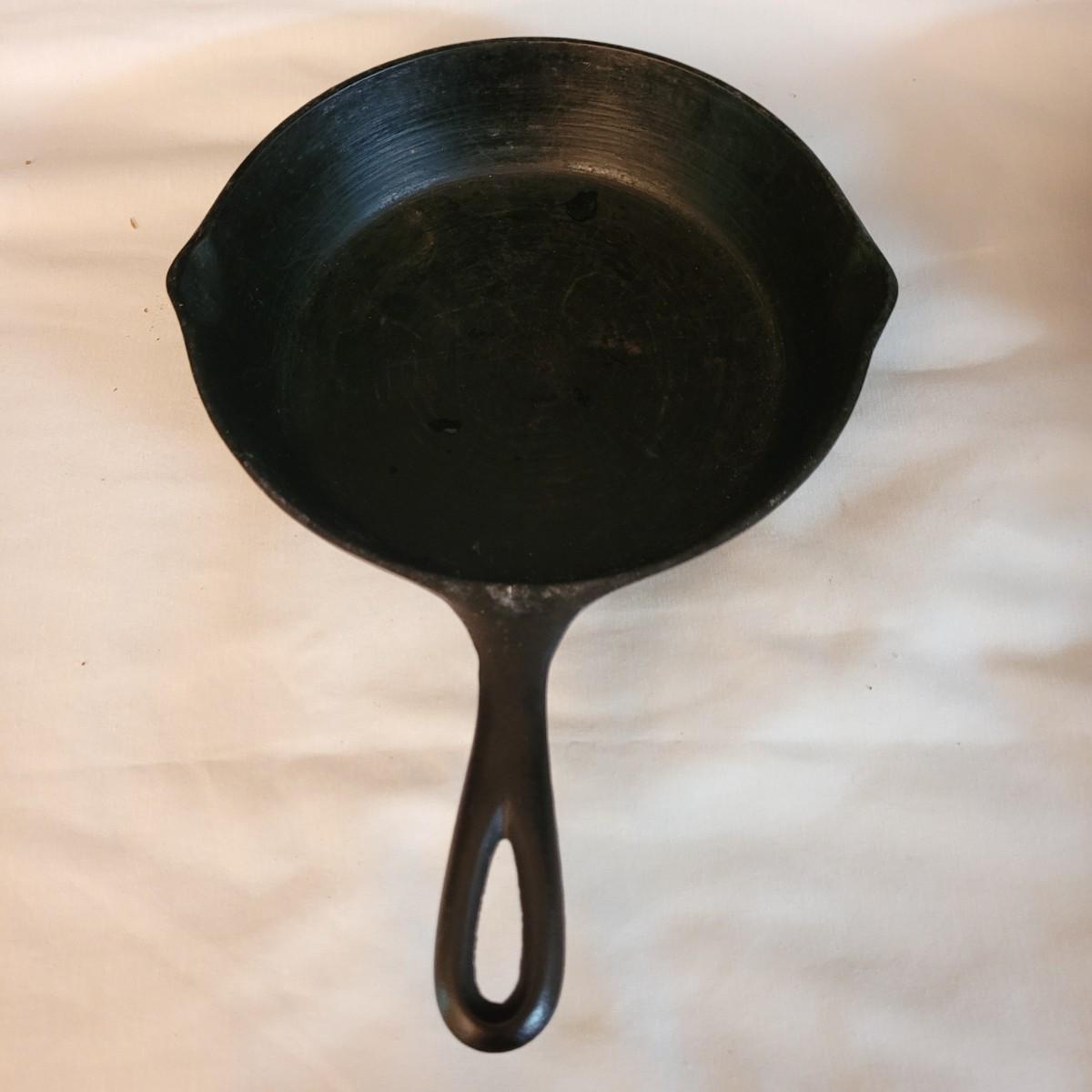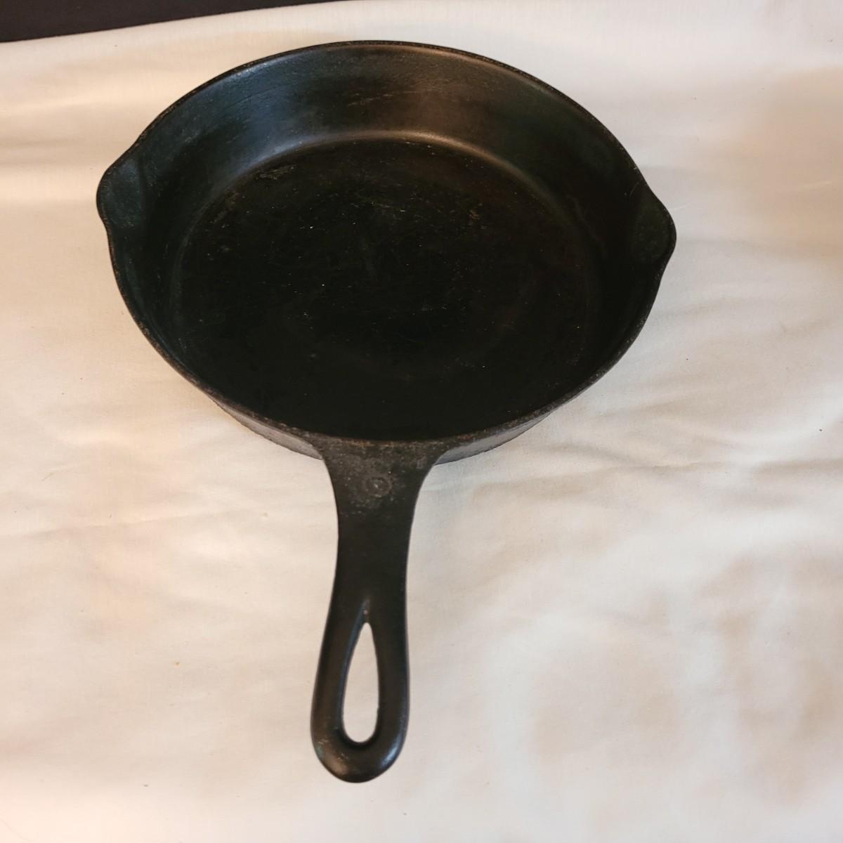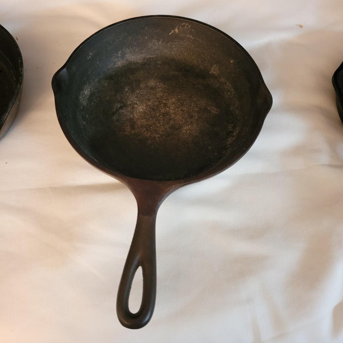 These four cast iron pans comes in a variety of sizes. The smallest measures approximately 6.5”DIA, two medium 8.5”DIA, and large 10.5”DIA. Shipping available.