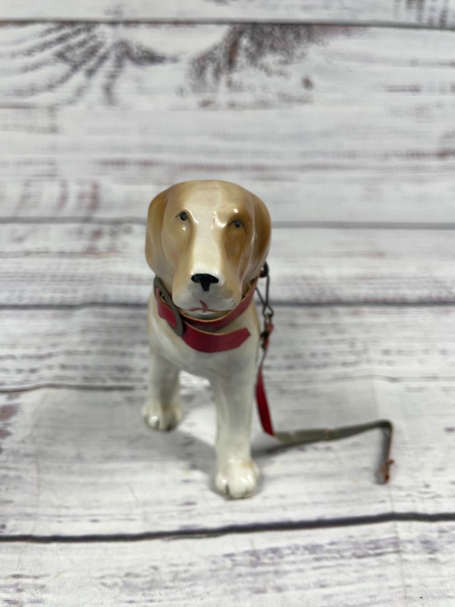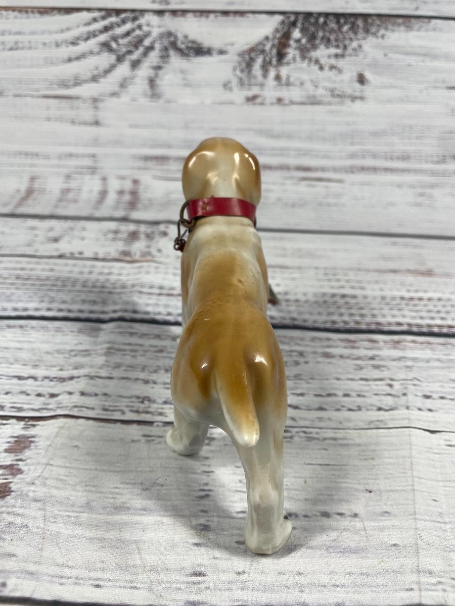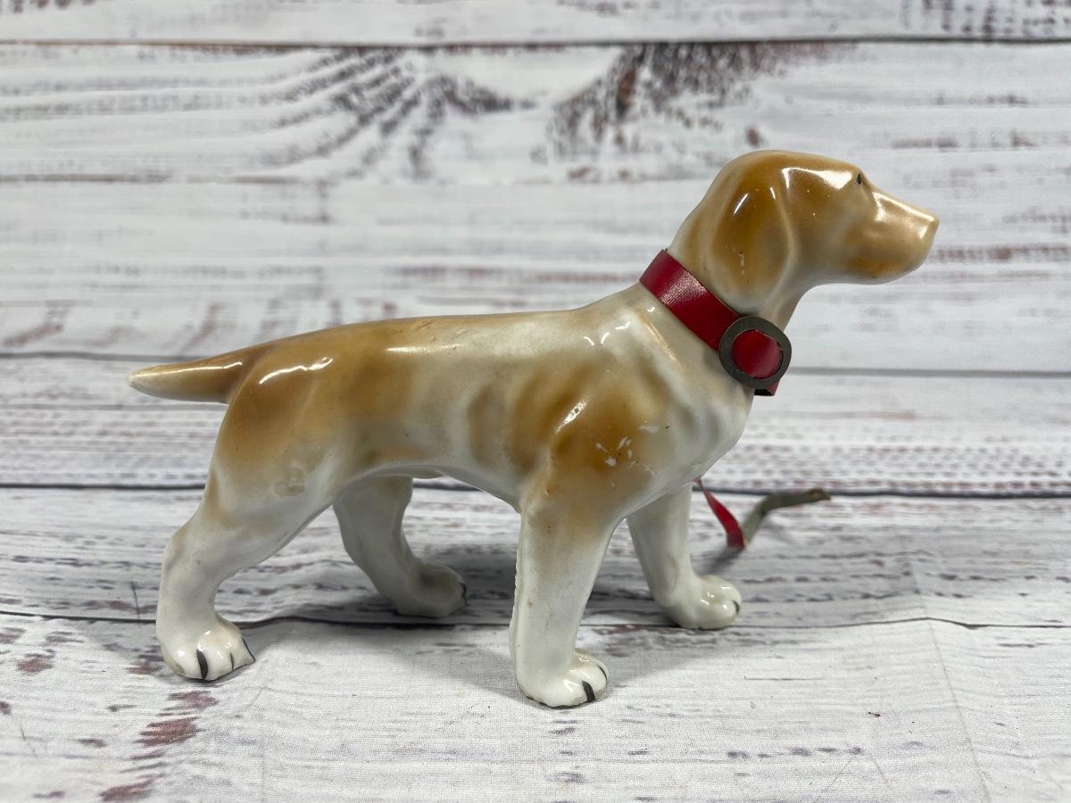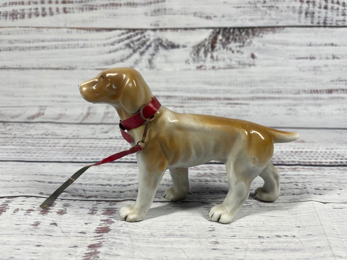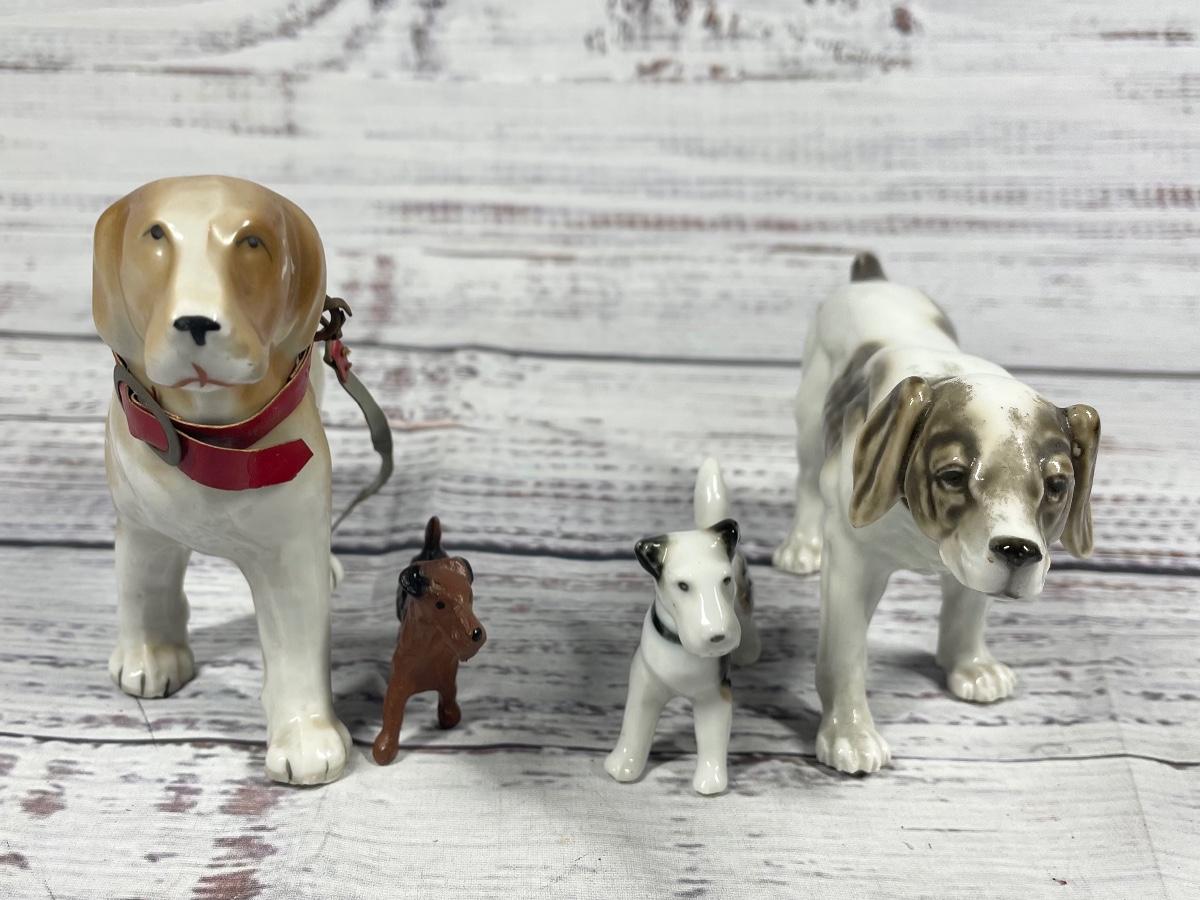 This is a set of four dog statues. All statues are in decent condition. All items seem to have some sort of discoloration. The leash on one of the dogs has some damage to it: