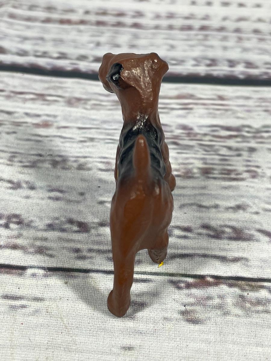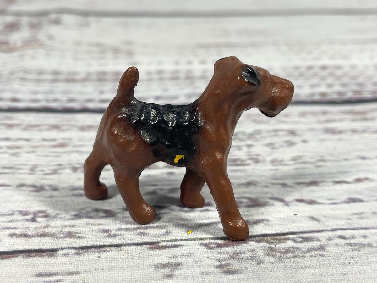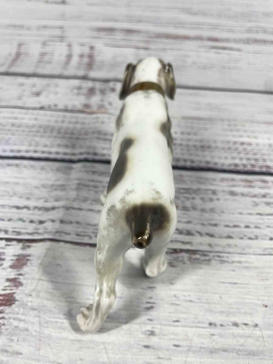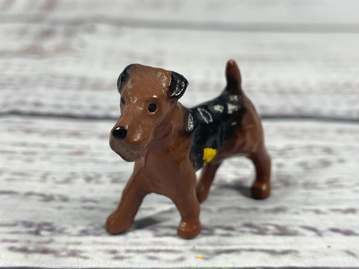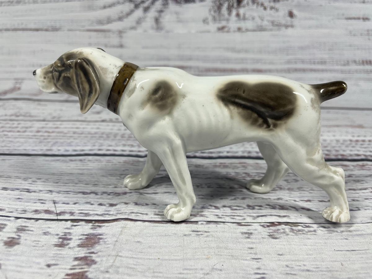 This is a set of four dog statues. All statues are in decent condition. All items seem to have some sort of discoloration. The leash on one of the dogs has some damage to it: