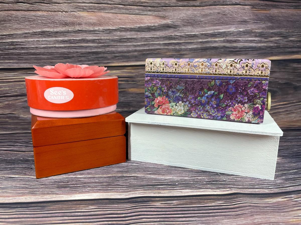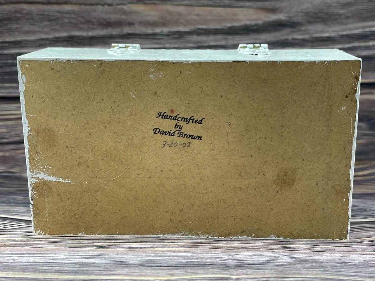 All are in good condition. The brown box has some damage inside due to years of usage. The white box was handcrafted by David Brown.