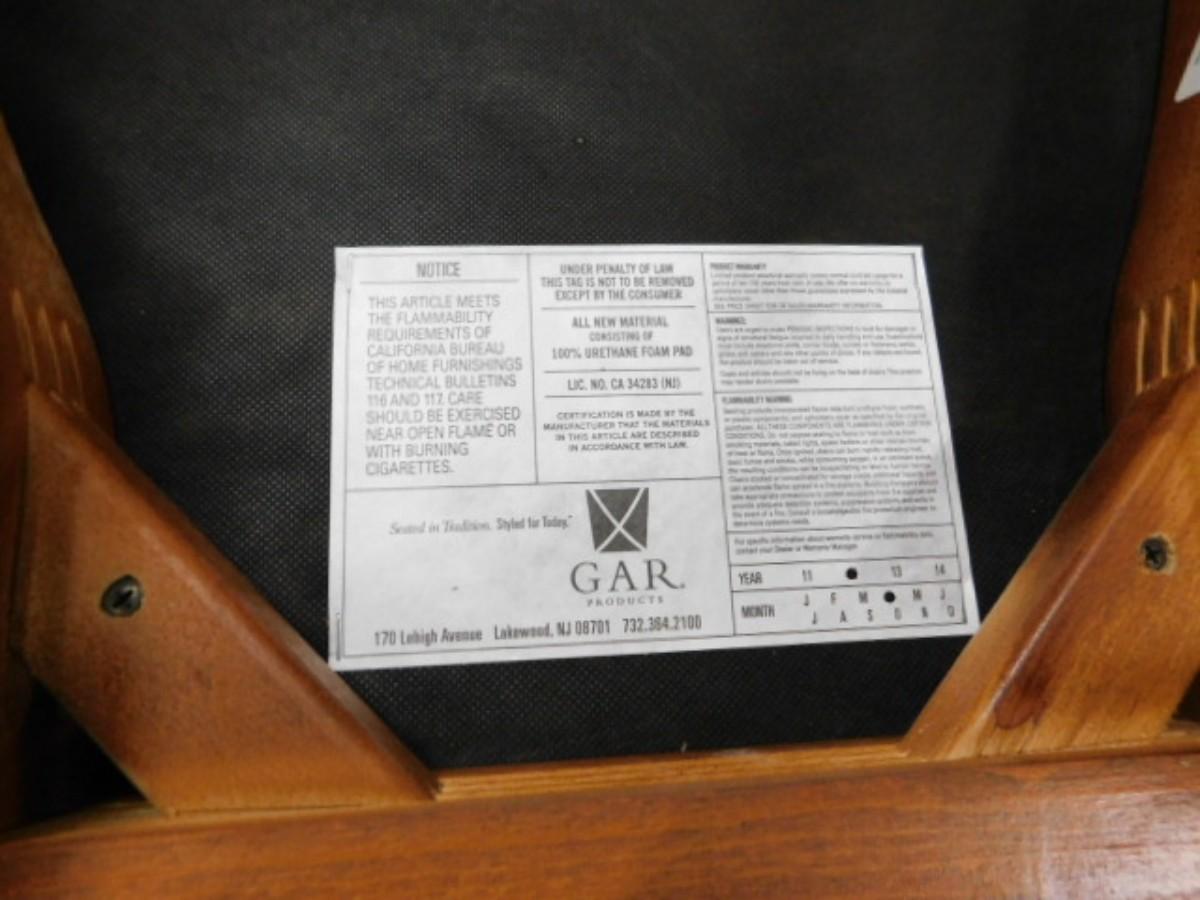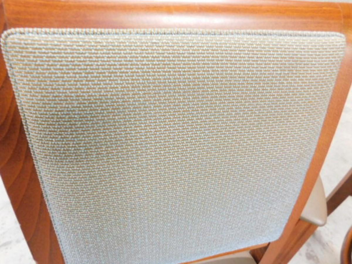 Set of Four Contemporary Faux Leather Seat Fabric Back Wood Frame Chairs by GAR. Expect some wear or scratches to the finish. Shipping option available via freight or local mover at Buyer's expense. Buyer must have all shipping scheduled within the stated dates and times of pickup. Recommended local mover is Beaty Bros. Moving 828-201-2982
