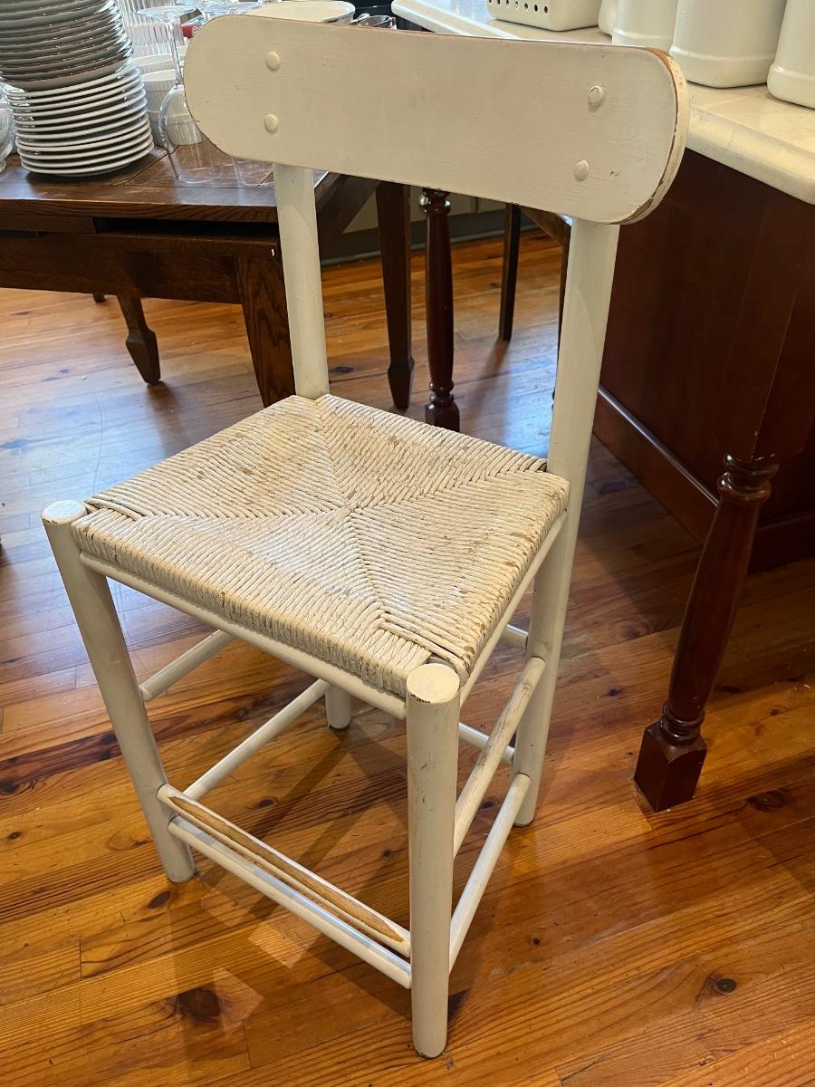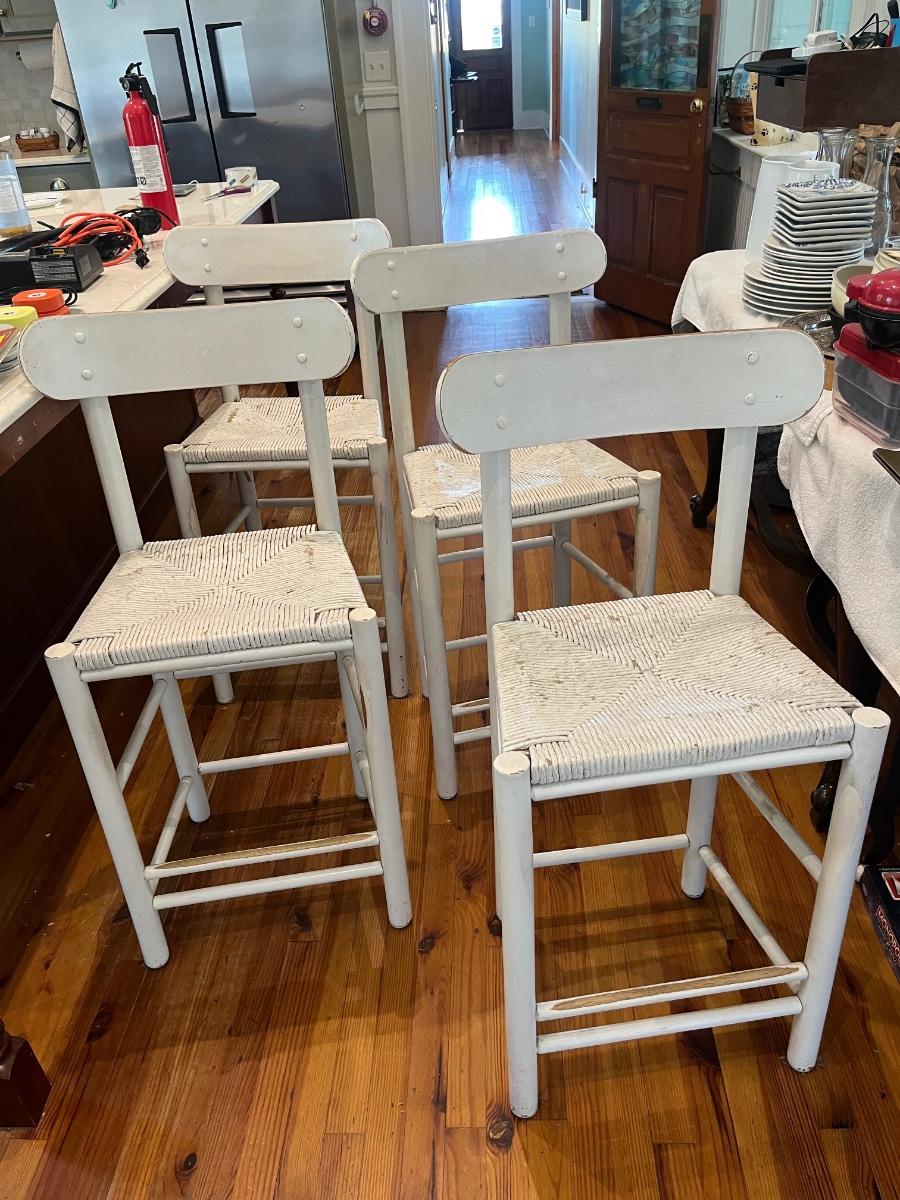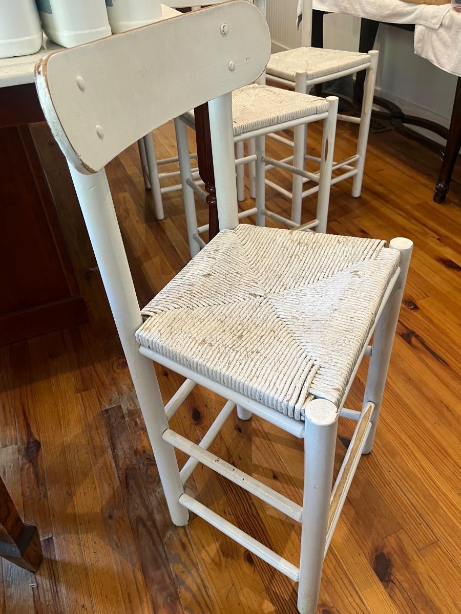 Four painted counter-height rush seat bar chairs; approx. 24" seat, 38" back x 18" W. x 14 D.; wear from use