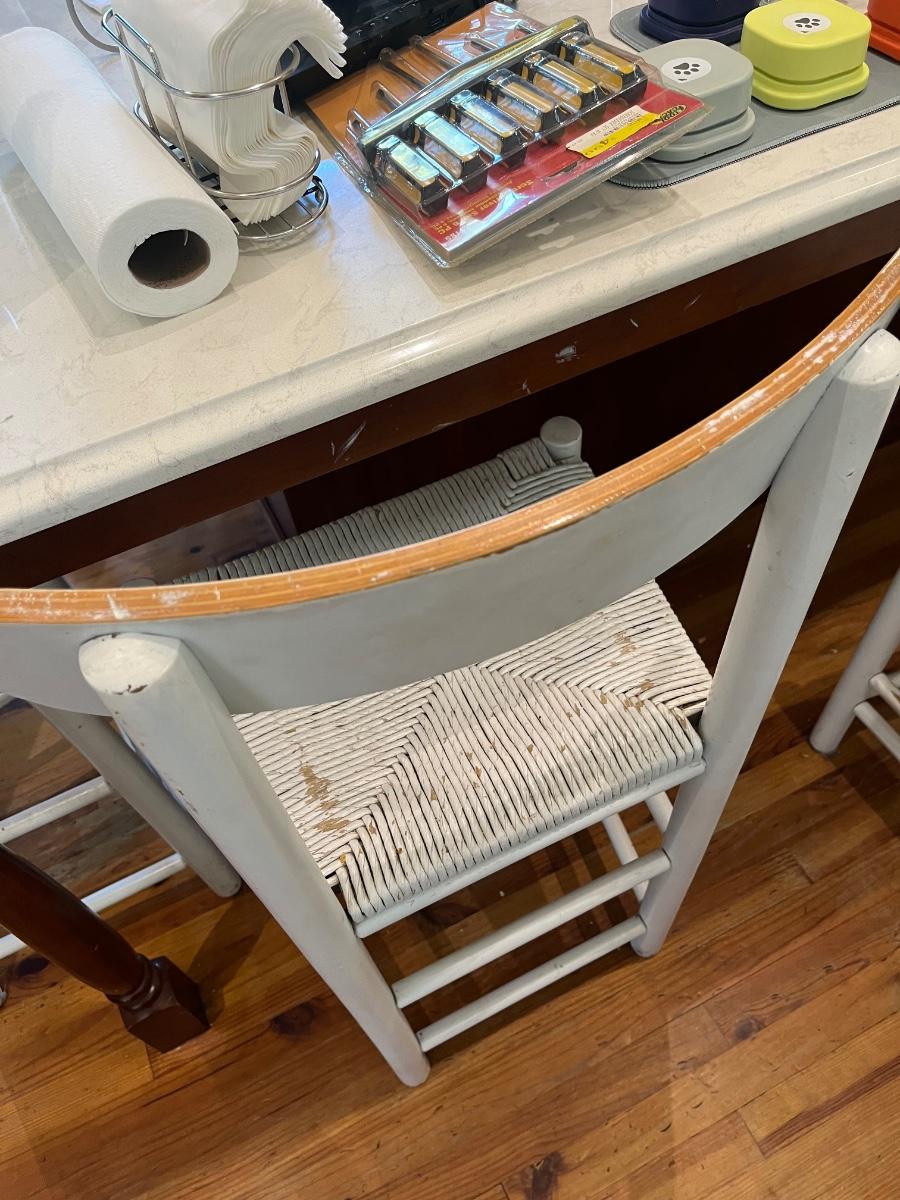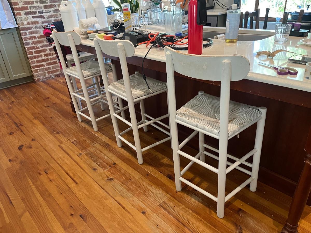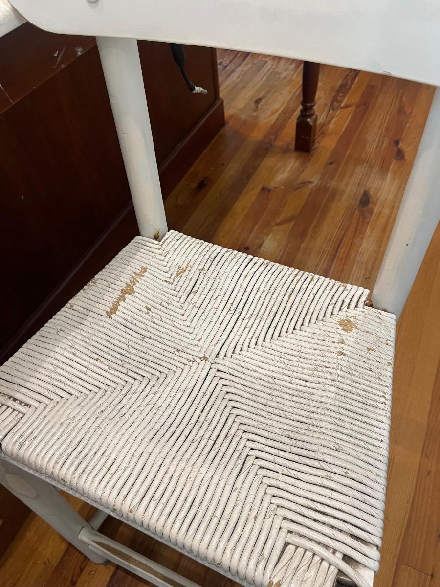 Four painted counter-height rush seat bar chairs; approx. 24" seat, 38" back x 18" W. x 14 D.; wear from use