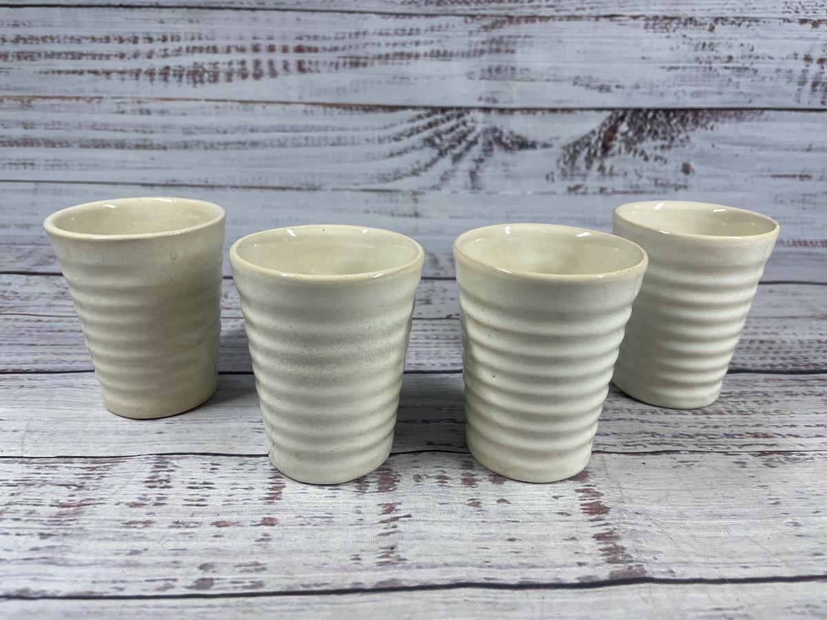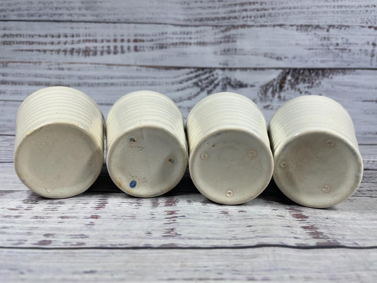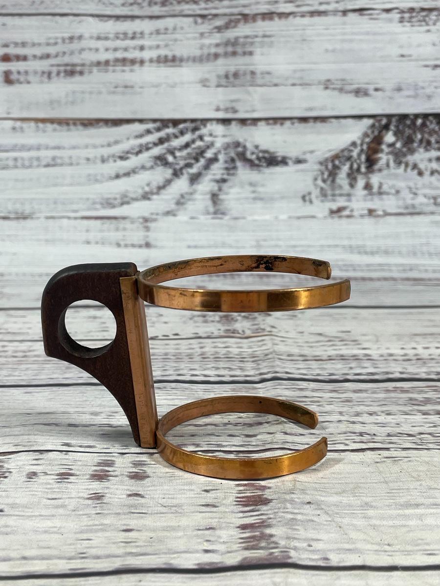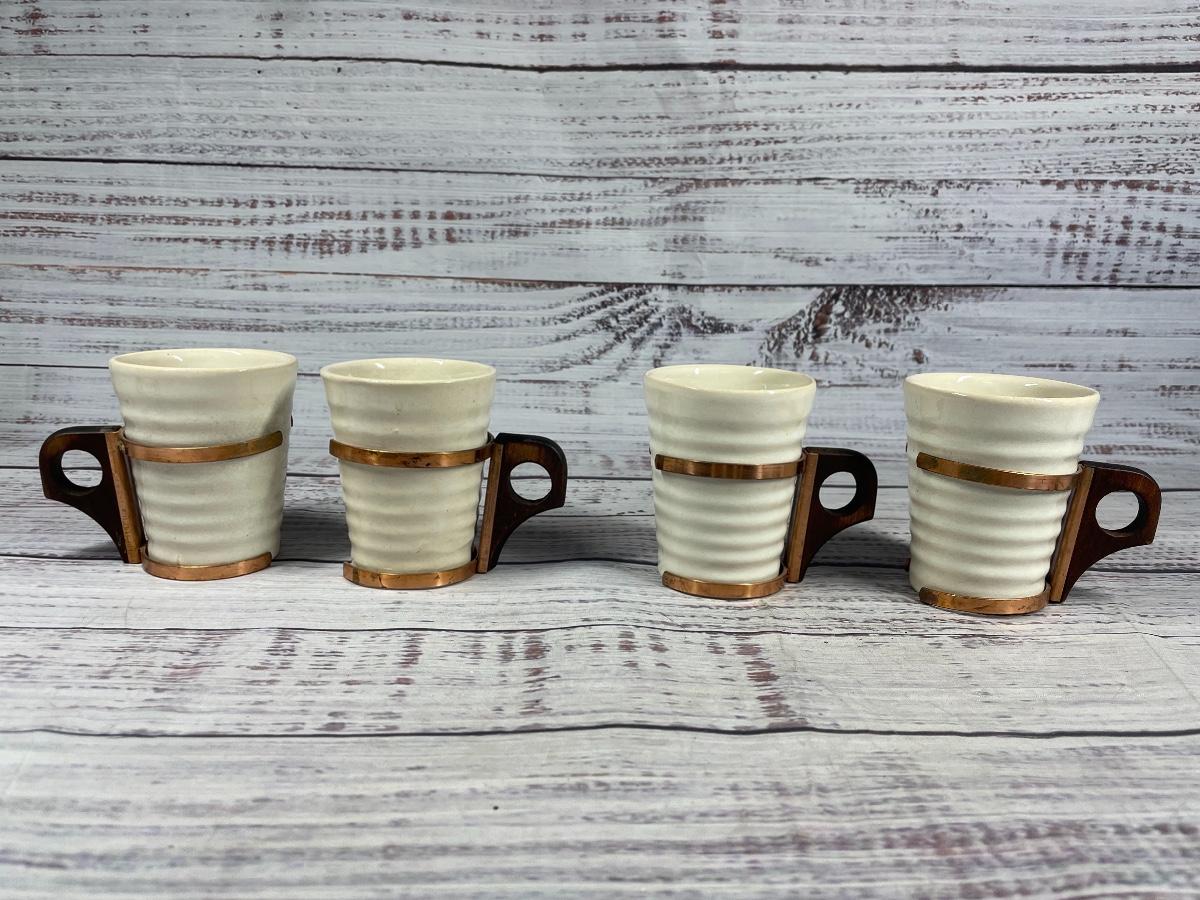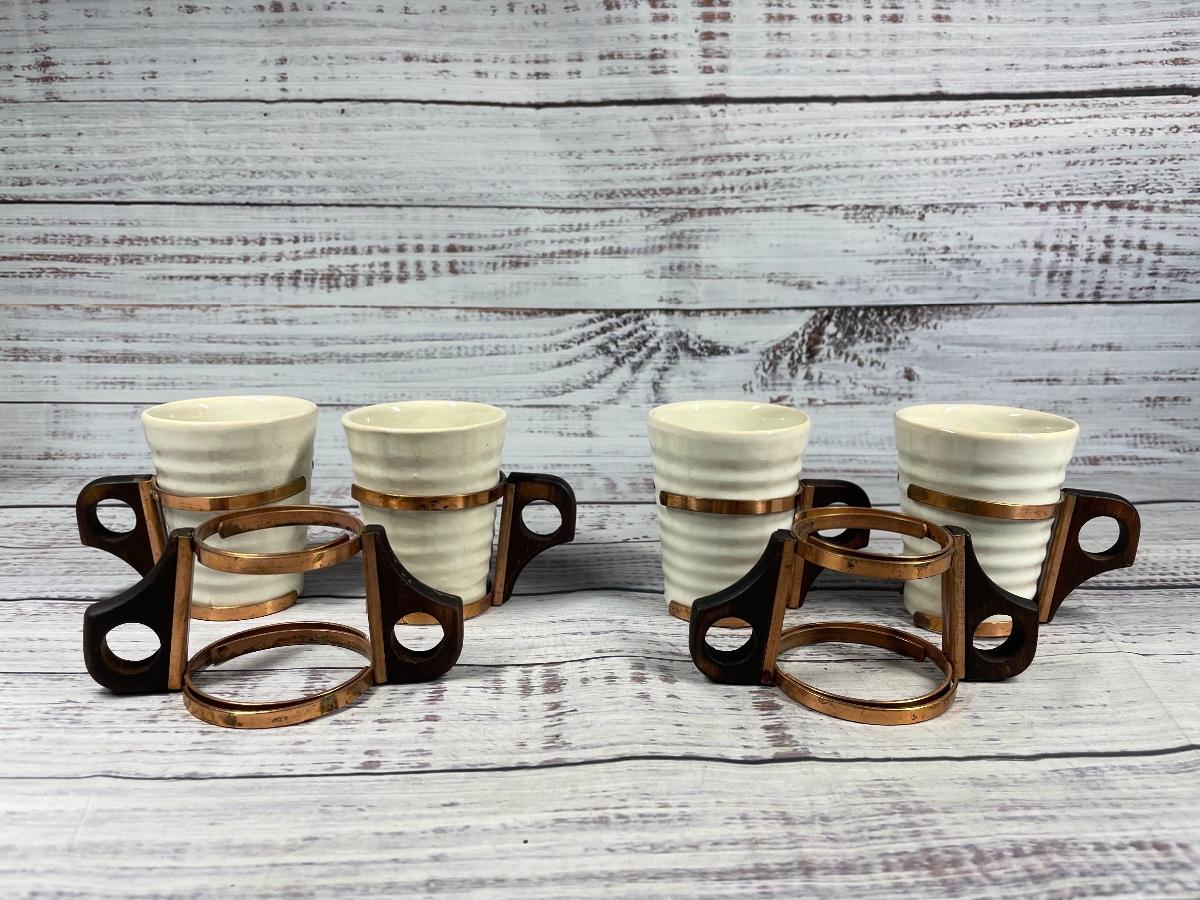 Set of White Ceramic Cup and Metal Copper Cup Holders, there are no significant chips or cracks to the cups or the cup holders and is in good useable condition. Comes with four cups and eight cup holders, check pictures for more details and for sizing.