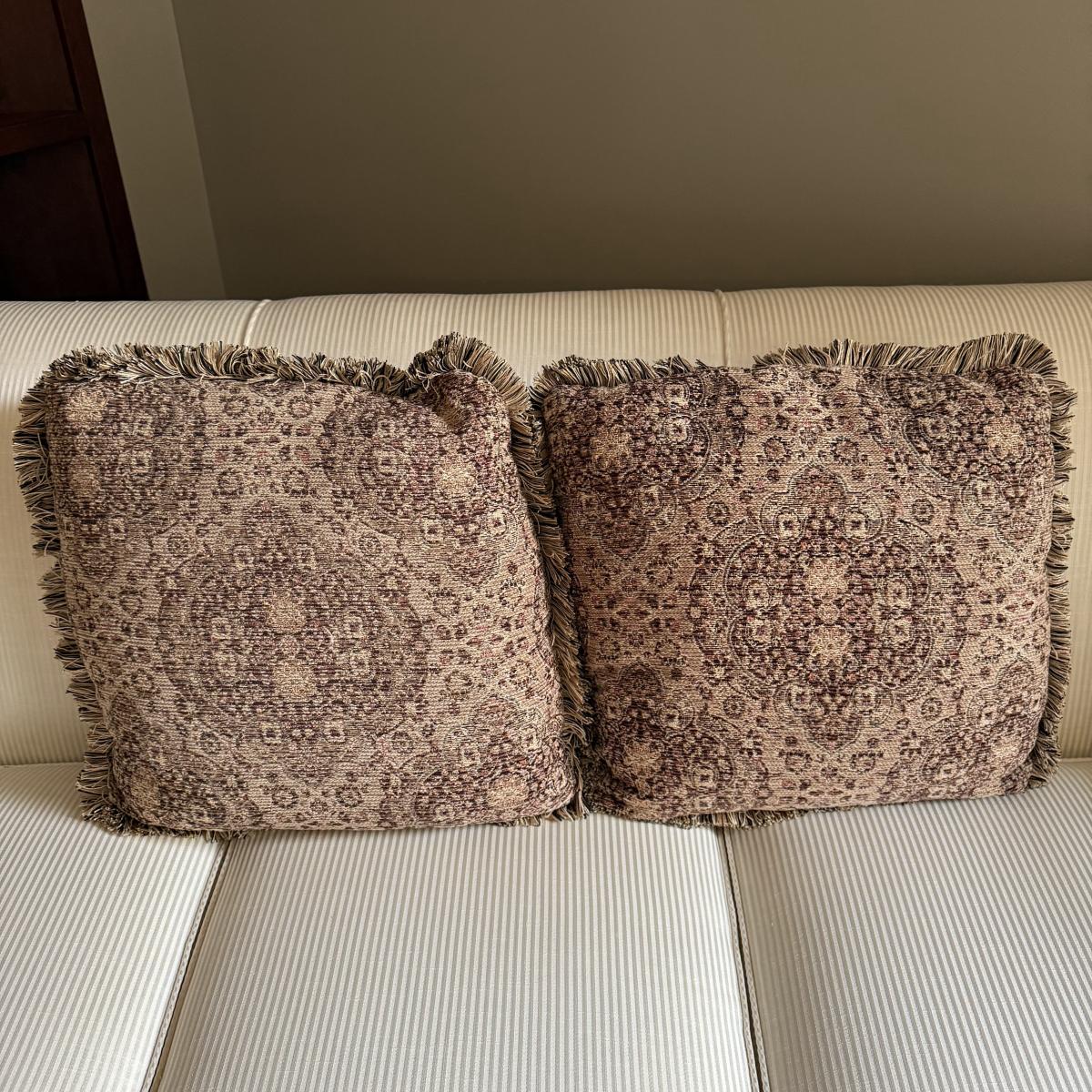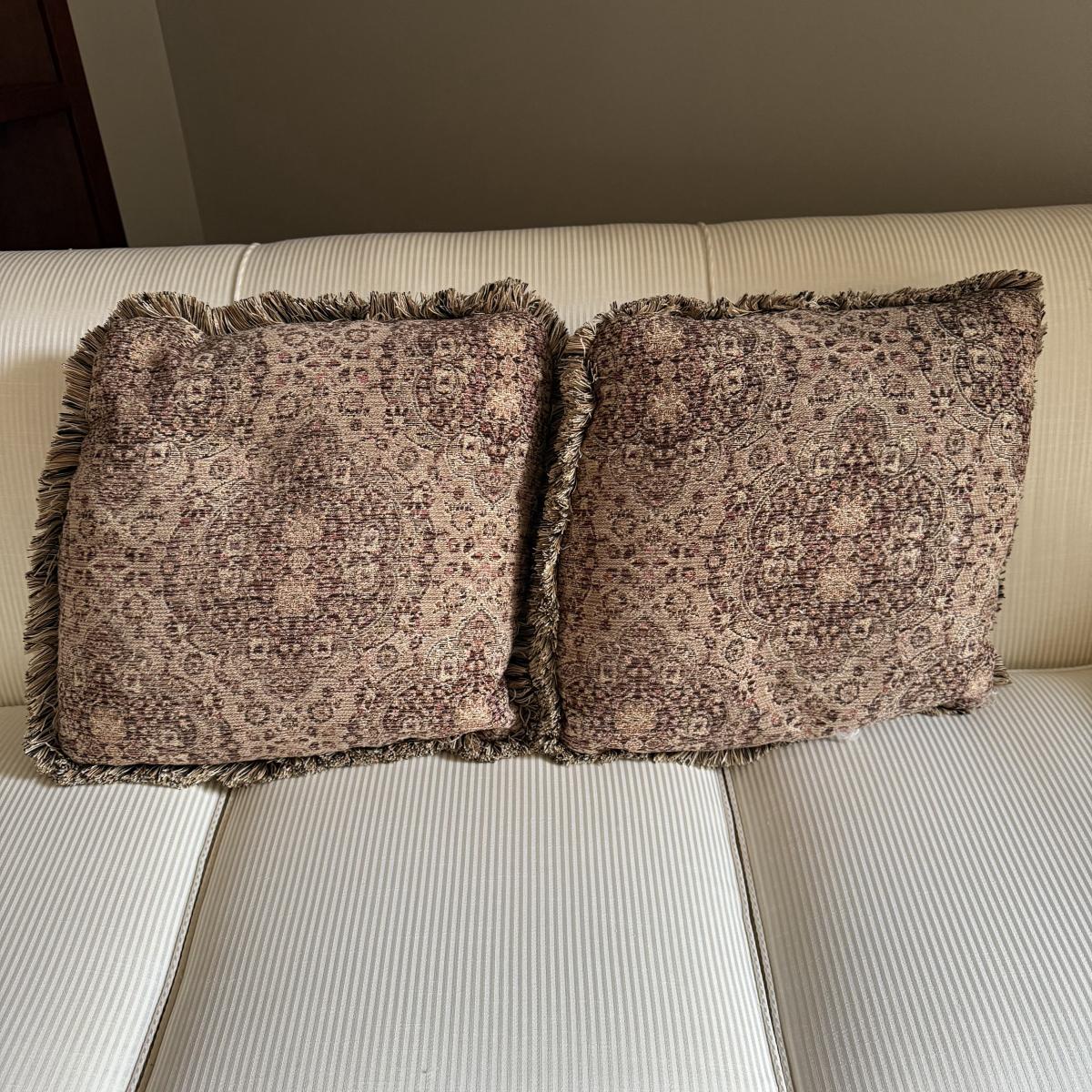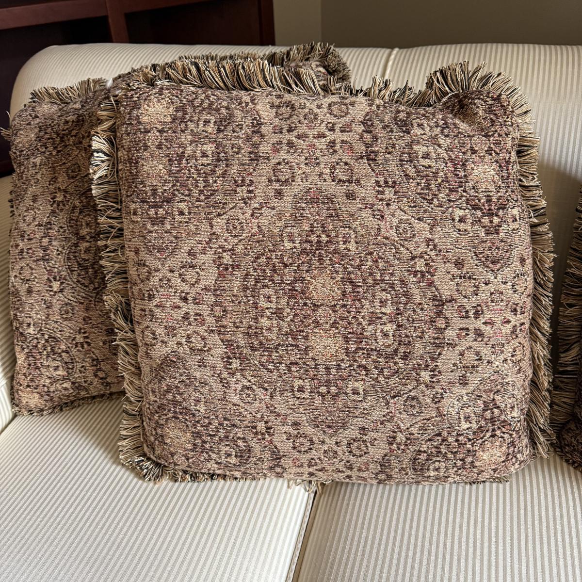 This lot contains a set of four decorative pillows. All the pillows are the same shape and design. They each measure 20” x 19” and have a gold and brown coloring. They are down pillows, and the cases are removable via a zipper along one edge. The sofa is not included but is listed in this sale as another lot. Shipping available.