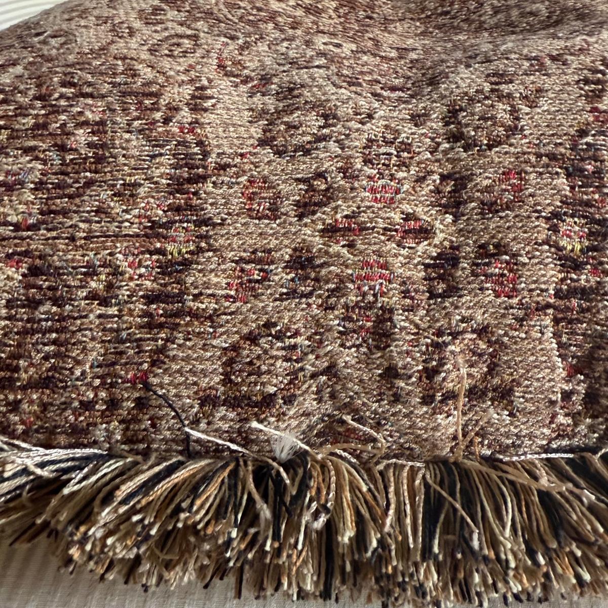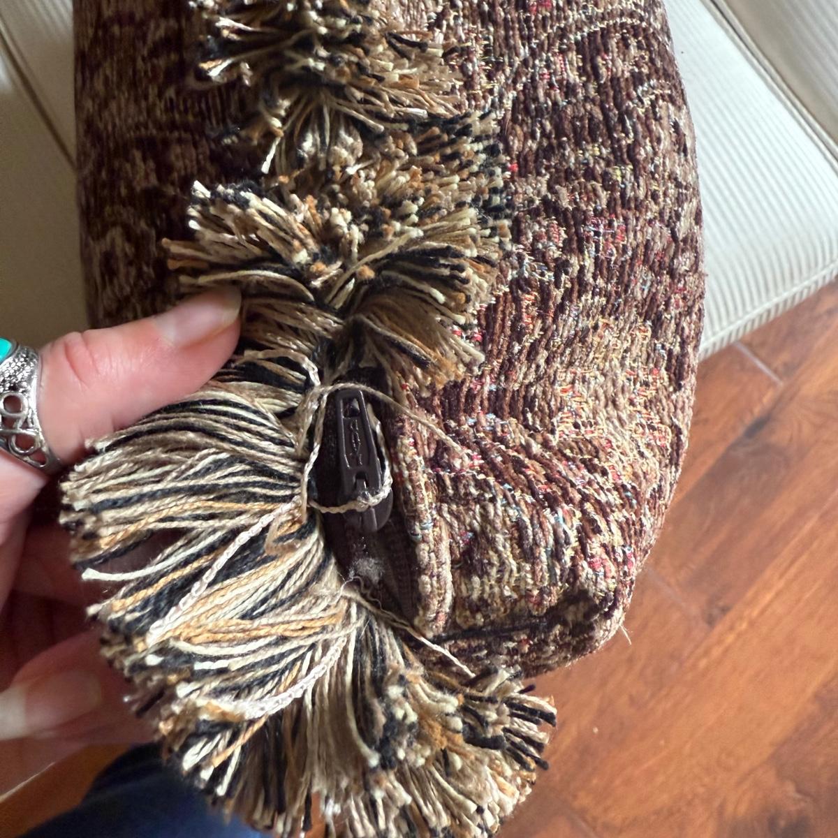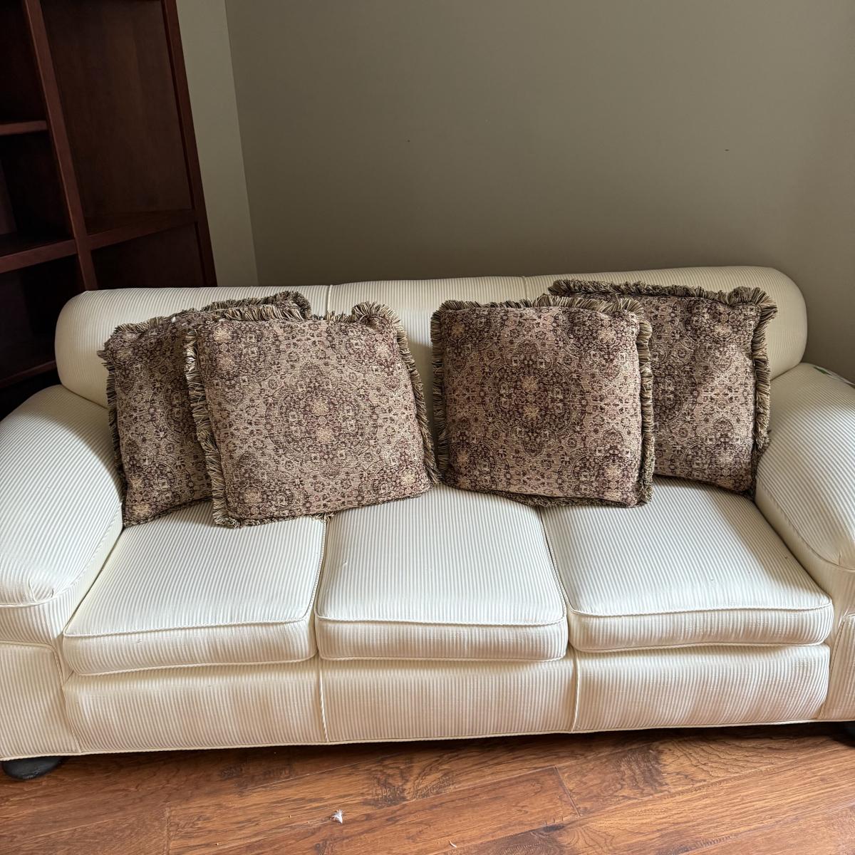 This lot contains a set of four decorative pillows. All the pillows are the same shape and design. They each measure 20” x 19” and have a gold and brown coloring. They are down pillows, and the cases are removable via a zipper along one edge. The sofa is not included but is listed in this sale as another lot. Shipping available.