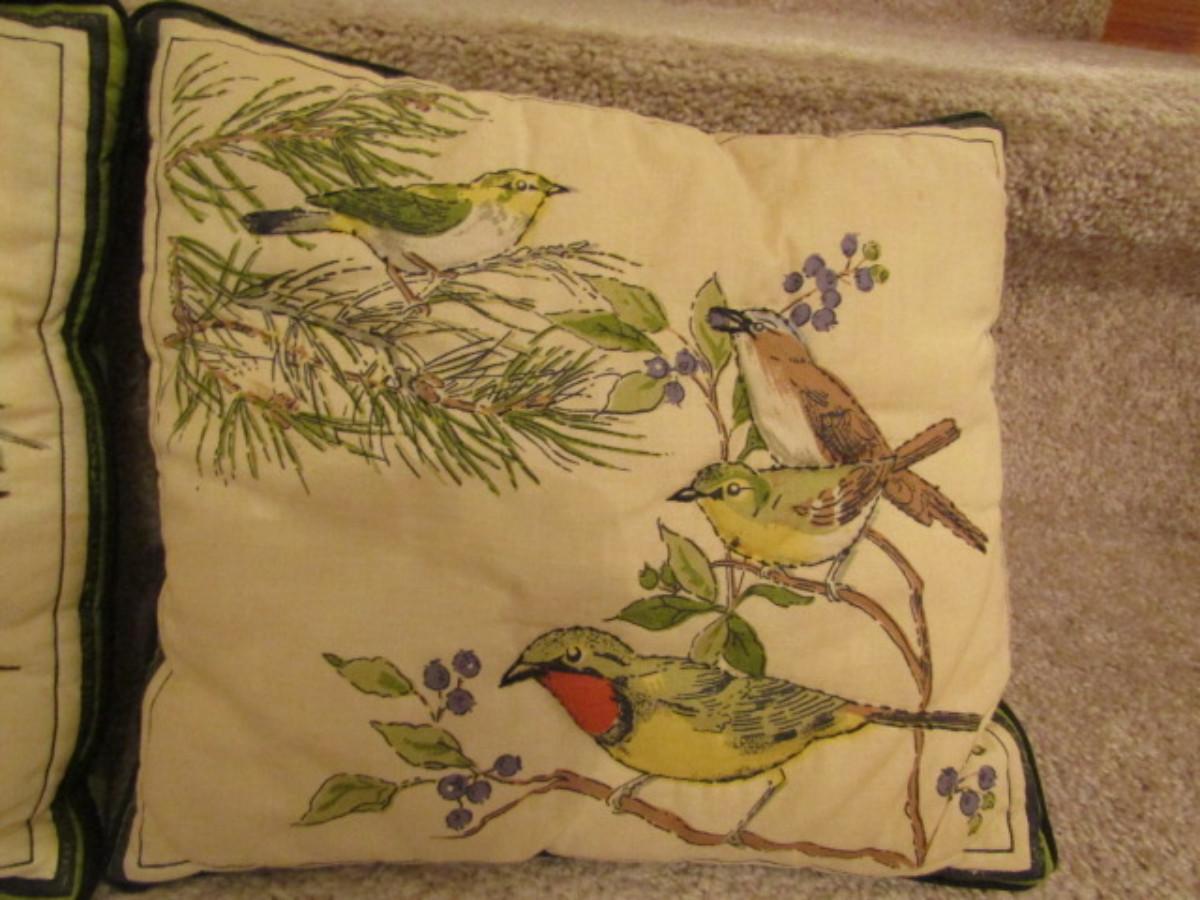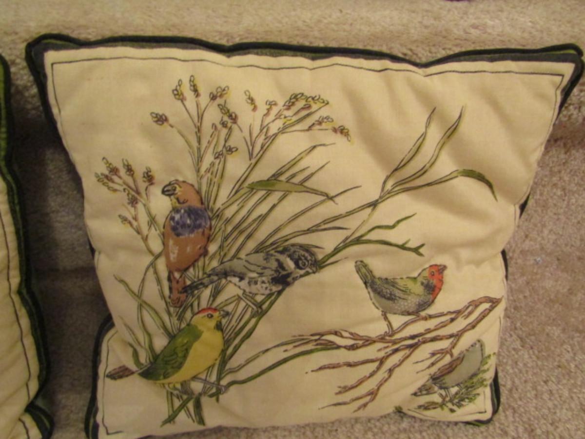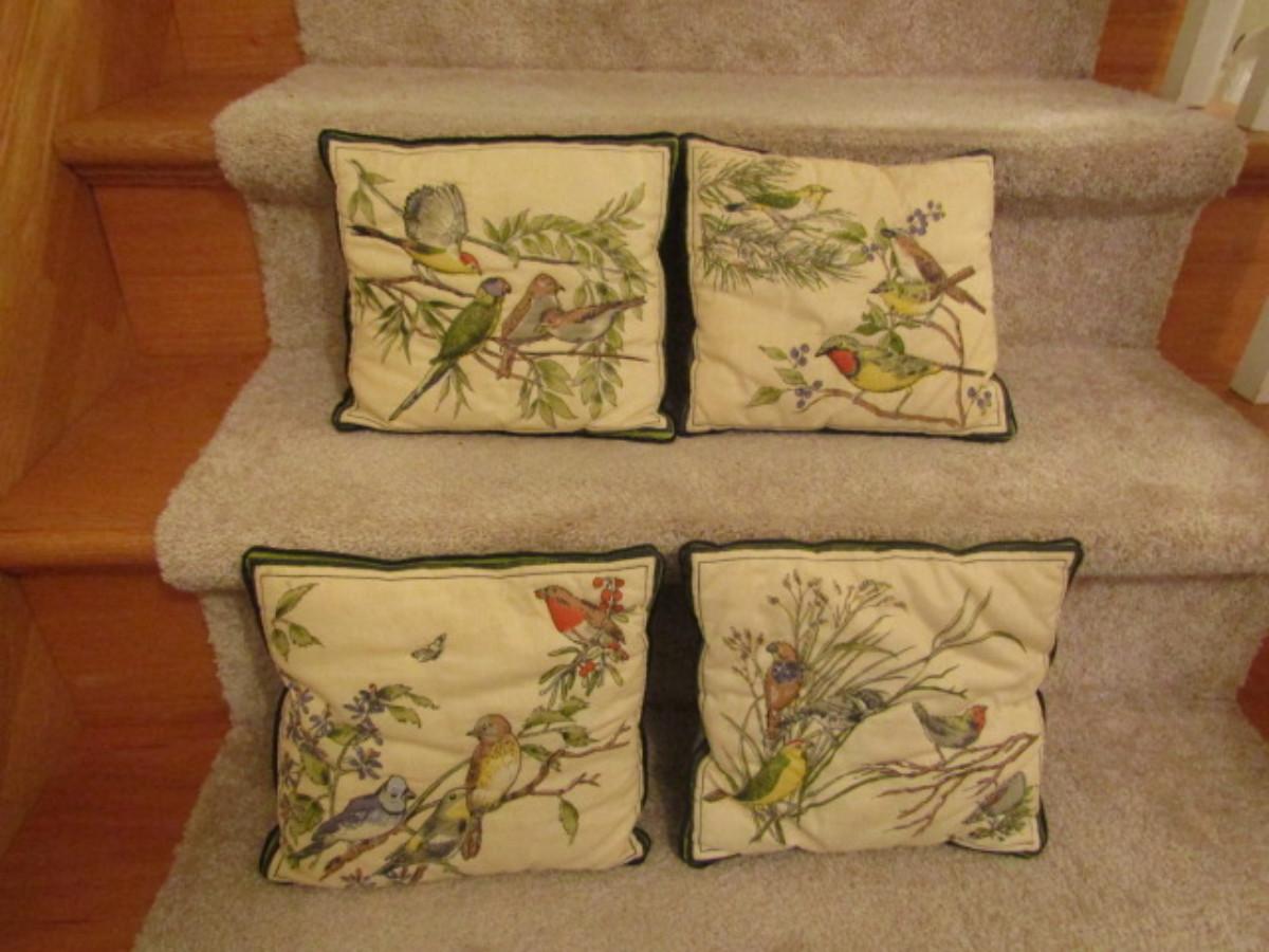 Set of Four Decorative Pillows- Bird Design- Approx 9 1/2" Square. Please see all pictures- one has snagged area on reverse side.