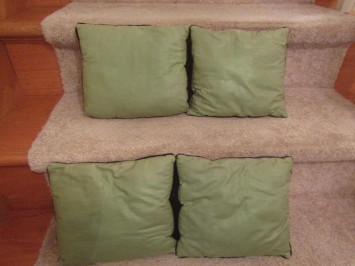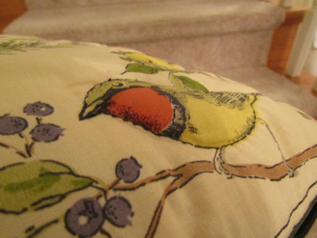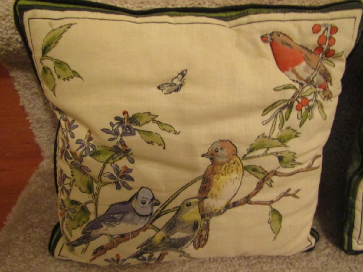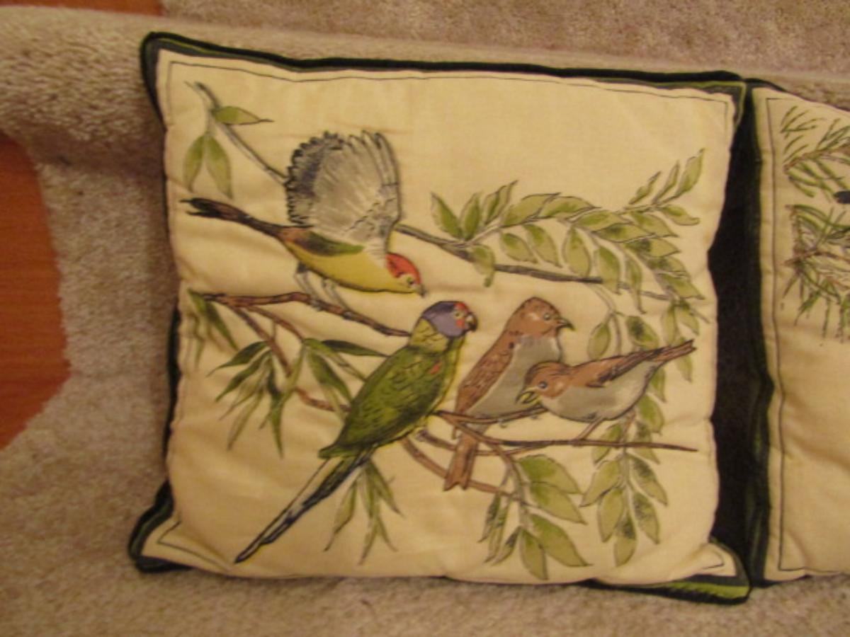 Set of Four Decorative Pillows- Bird Design- Approx 9 1/2" Square. Please see all pictures- one has snagged area on reverse side.